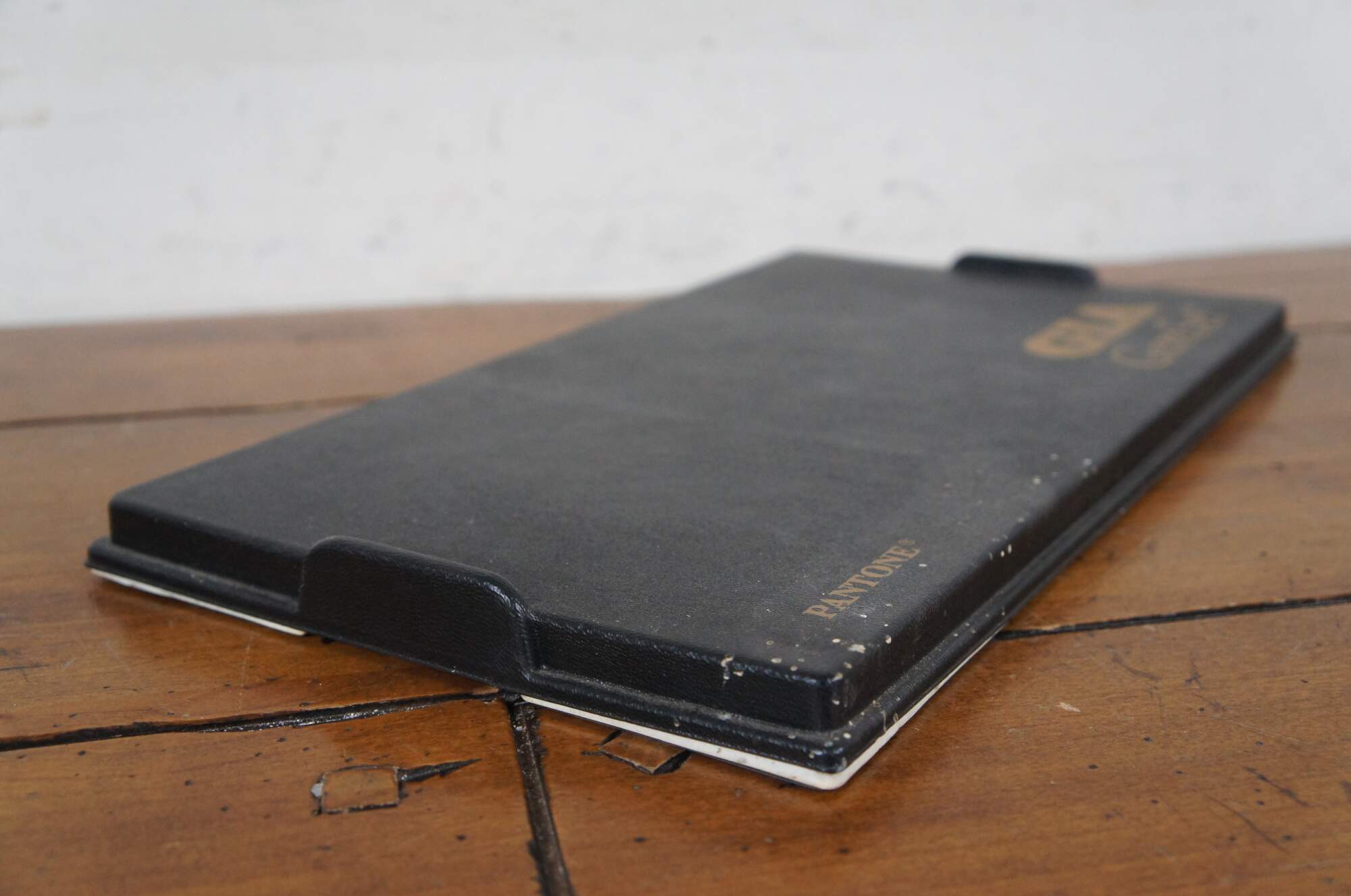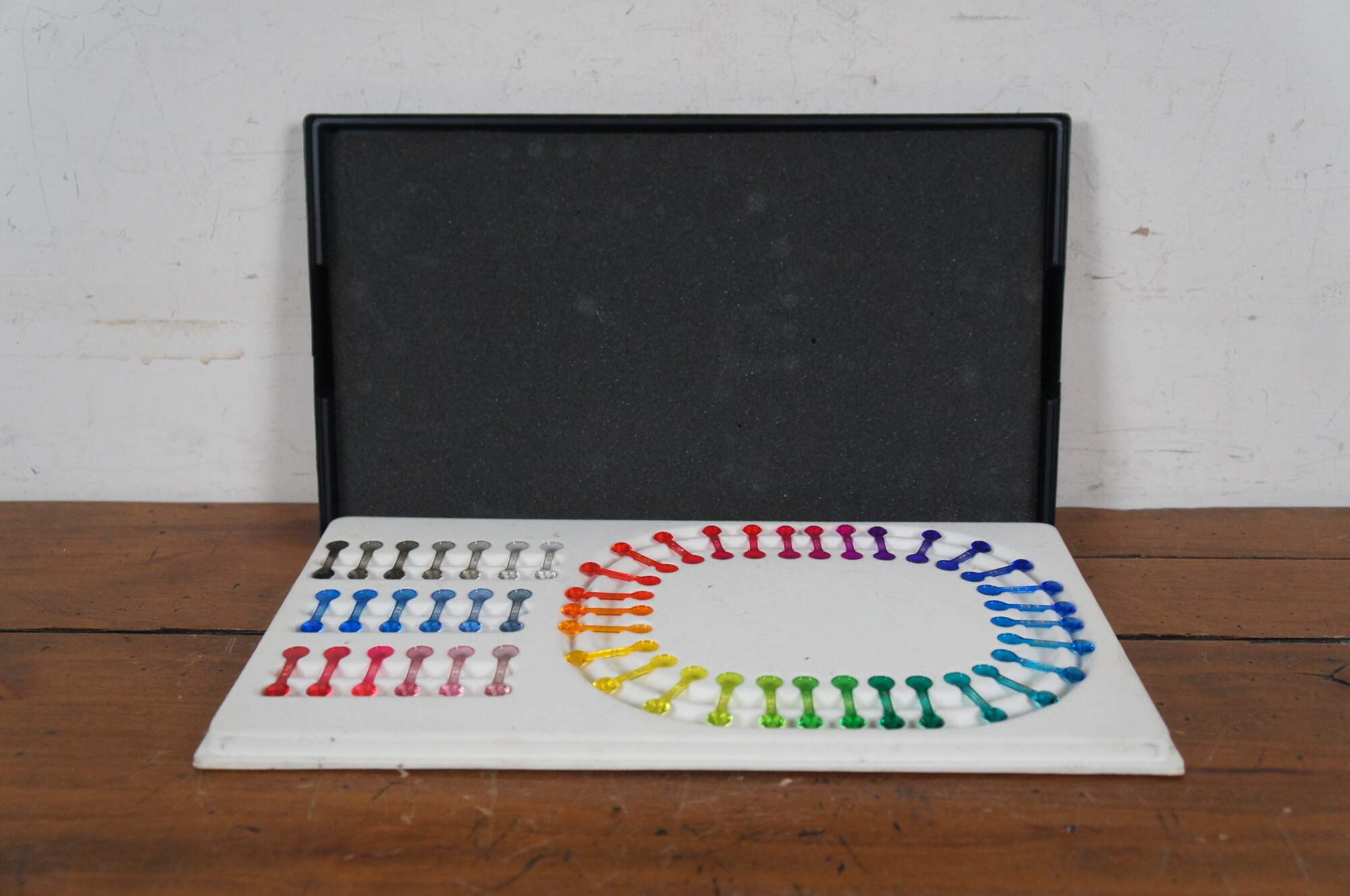 Rare discontinued, late 20th century, Pantone / GIA Hue Wheel GemSet. Set of 50 gem shaped paddles for use in color grading of natural gemstones by jewelers and gemologists. White fabric covered plastic base with black hard plastic cover.