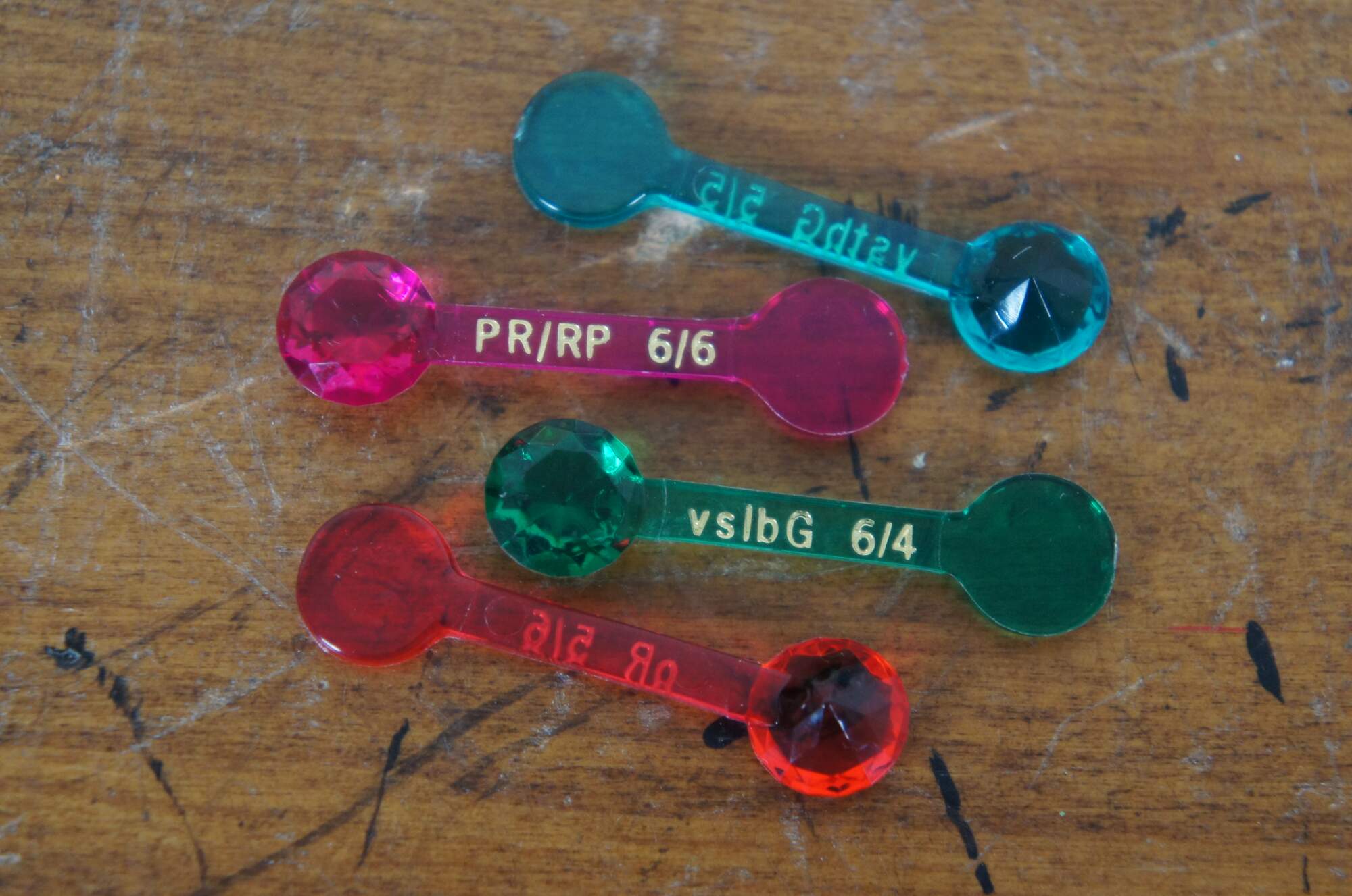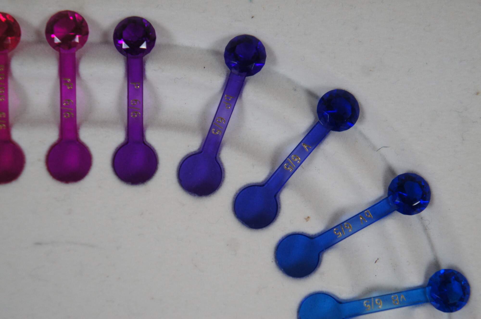"The Gemological Institute of America (GIA) used to distribute plastic color masters created by Pantone as a color grading reference for the Colored Gems Industry. They argued that the plastic comparison "gems" gave a more realistic representation of color than any flat media could. Used in combination with Normalised Color Wheel, Tone and Saturation Scale this was the perfect instrument combination before the apparition of Computarized System like Gemewizard which is able nowadays to identify "on a click" 1116 Colors Classifying 31 Hue's on 6 Tones and 6 Levels of Saturations. The Complete version included 324 Color Samples on a three trays storage case. The most common version seems to be the "Hue Wheel" GemSet. In 2007, X-Rite acquired Pantone, the company making the color masters. Thus, unfortunately, they are no longer produced." (Source: Internatinal Gem society / Dominican Amber Fossils)