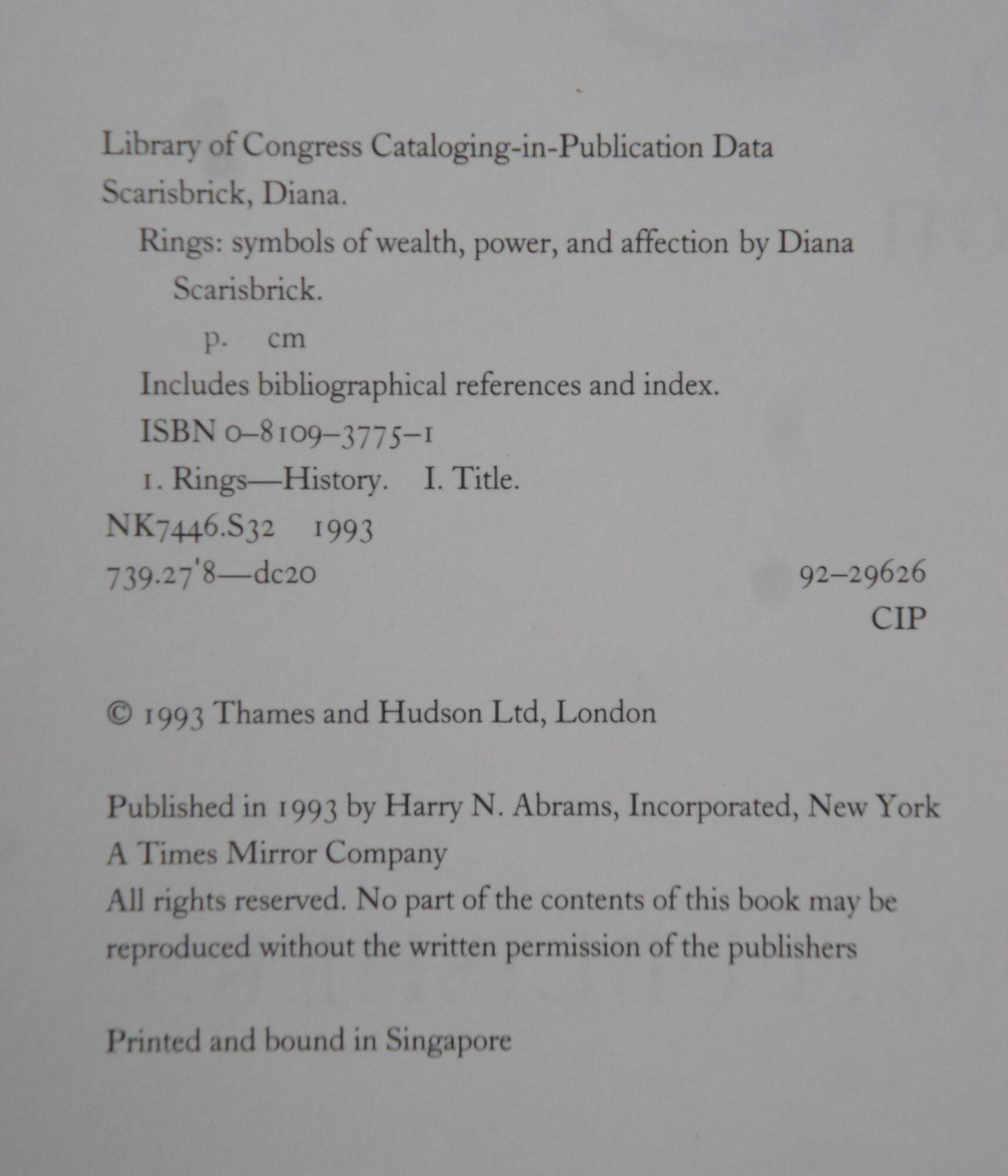 Rings: Symbols of Wealth, Power and Affection" - Diana Scarisbrick - Copyright 1993 Thames and Hudson Ltd, London - Published in 1993 by Harry N. Abrams, Inc, New York - Printed and Bound in Singapore - ISBN: 0-8109-3775-1. Black cloth bound hard back / hard cover with jacket.