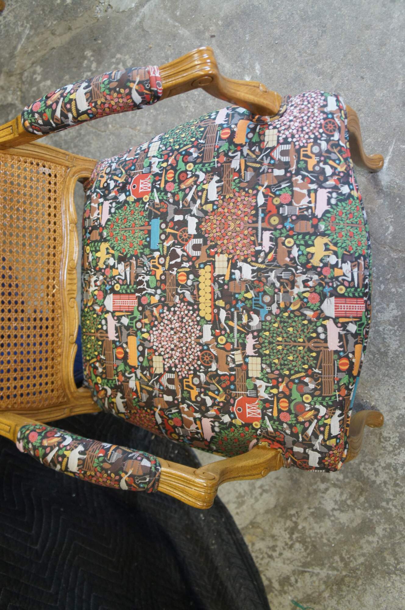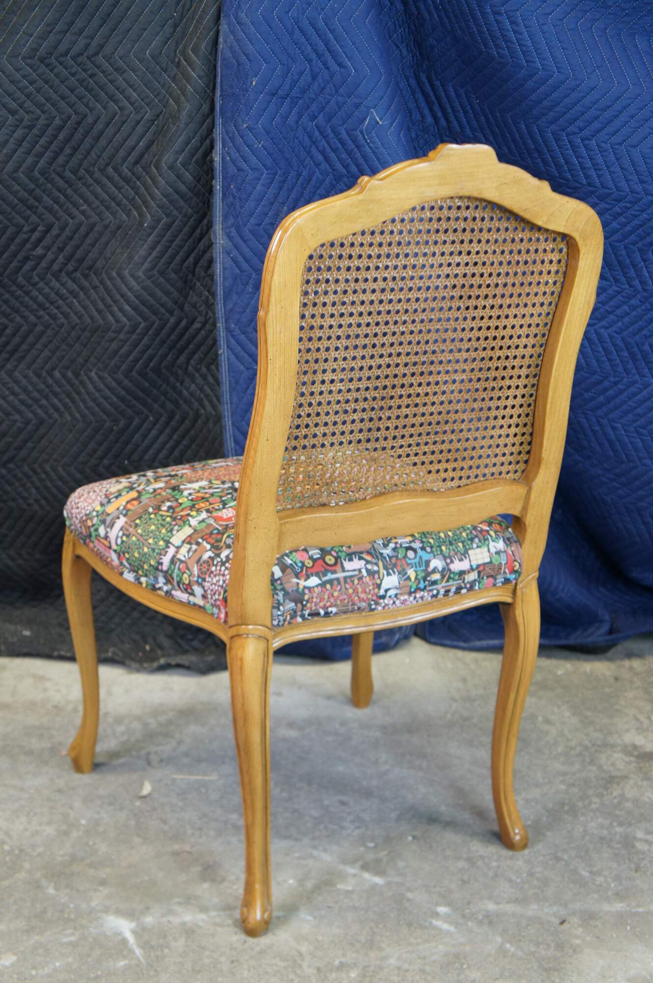 Eight vintage French Louis XV style dining chairs. Made of walnut featuring caned backs with carved floral accents, fauteuil arms and whimsical country farmhouse scenes.