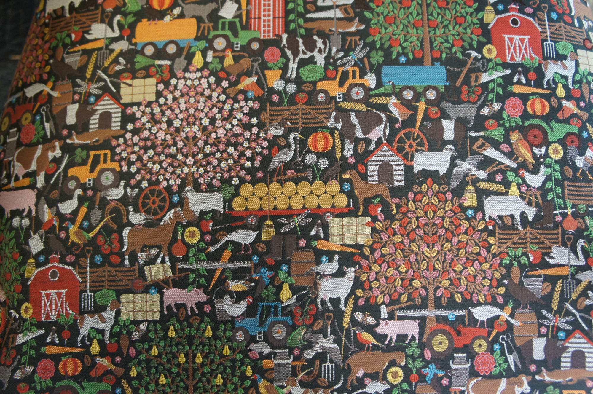 Jacquard upholstery pattern called Bavaria #466162 by Studio Job (sold exclusively by Maharam) features a landscape of farmland scenery with a dense assemblage of livestock animals, crops / trees, transport equipment and other farm implements.