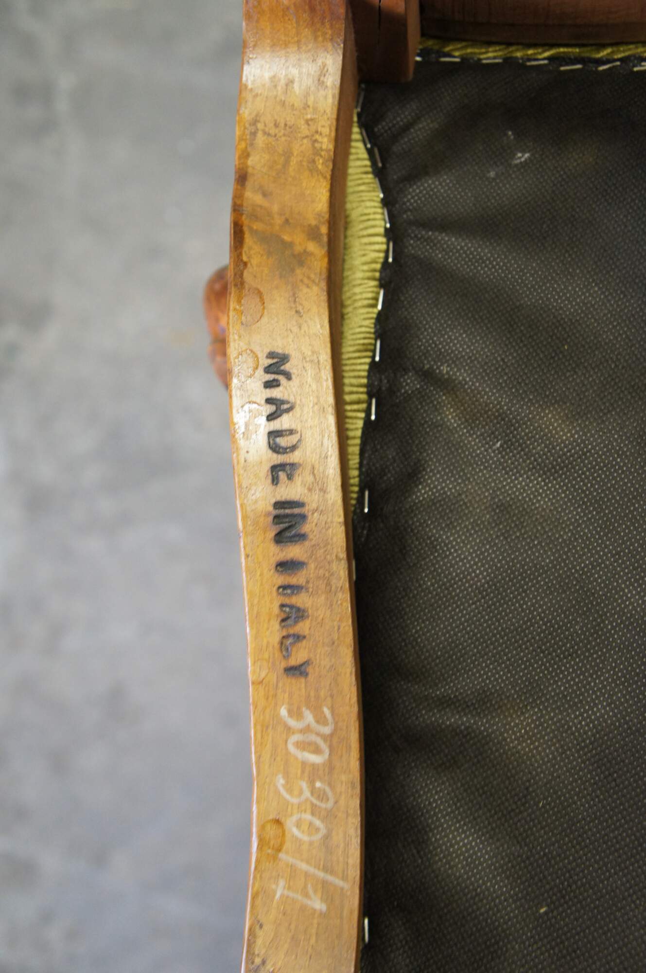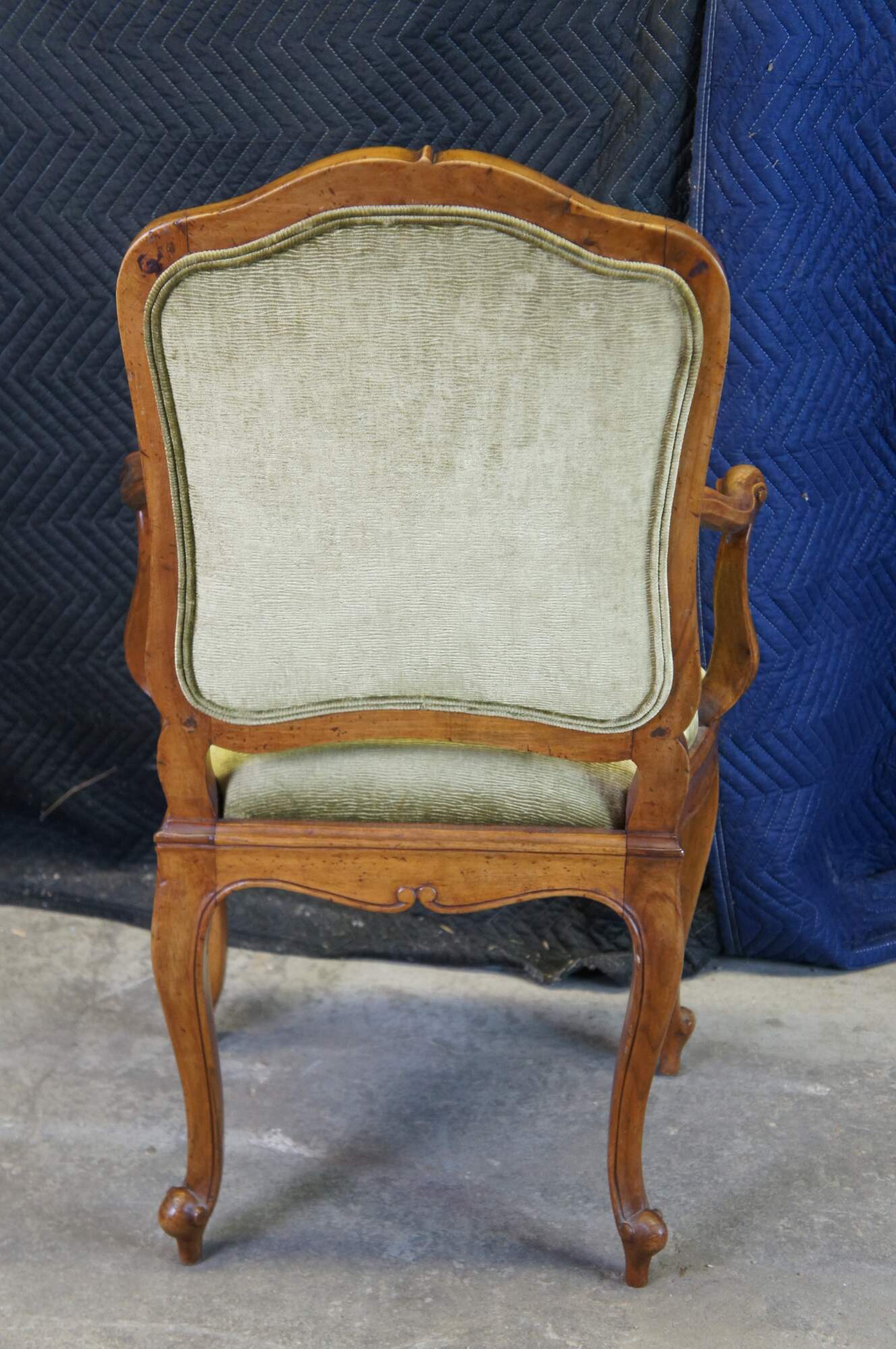 Pair of two vintage Italian dining / library / office arm chairs. Made of walnut feautring Louis XV styling with serpentine form, sloped arms, velvet upholstery and cabriole legs. Made in Italy.