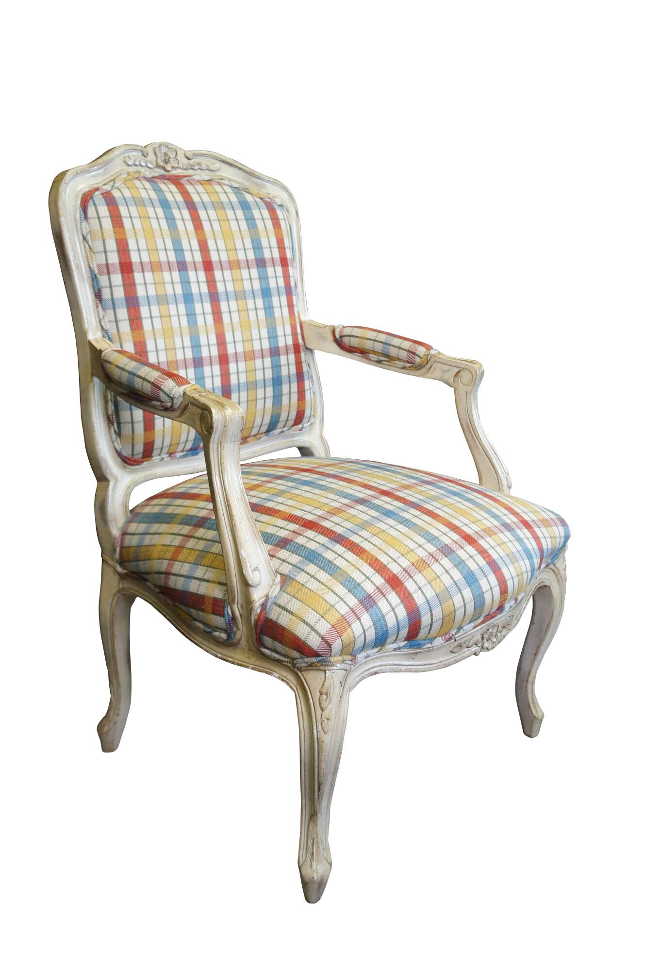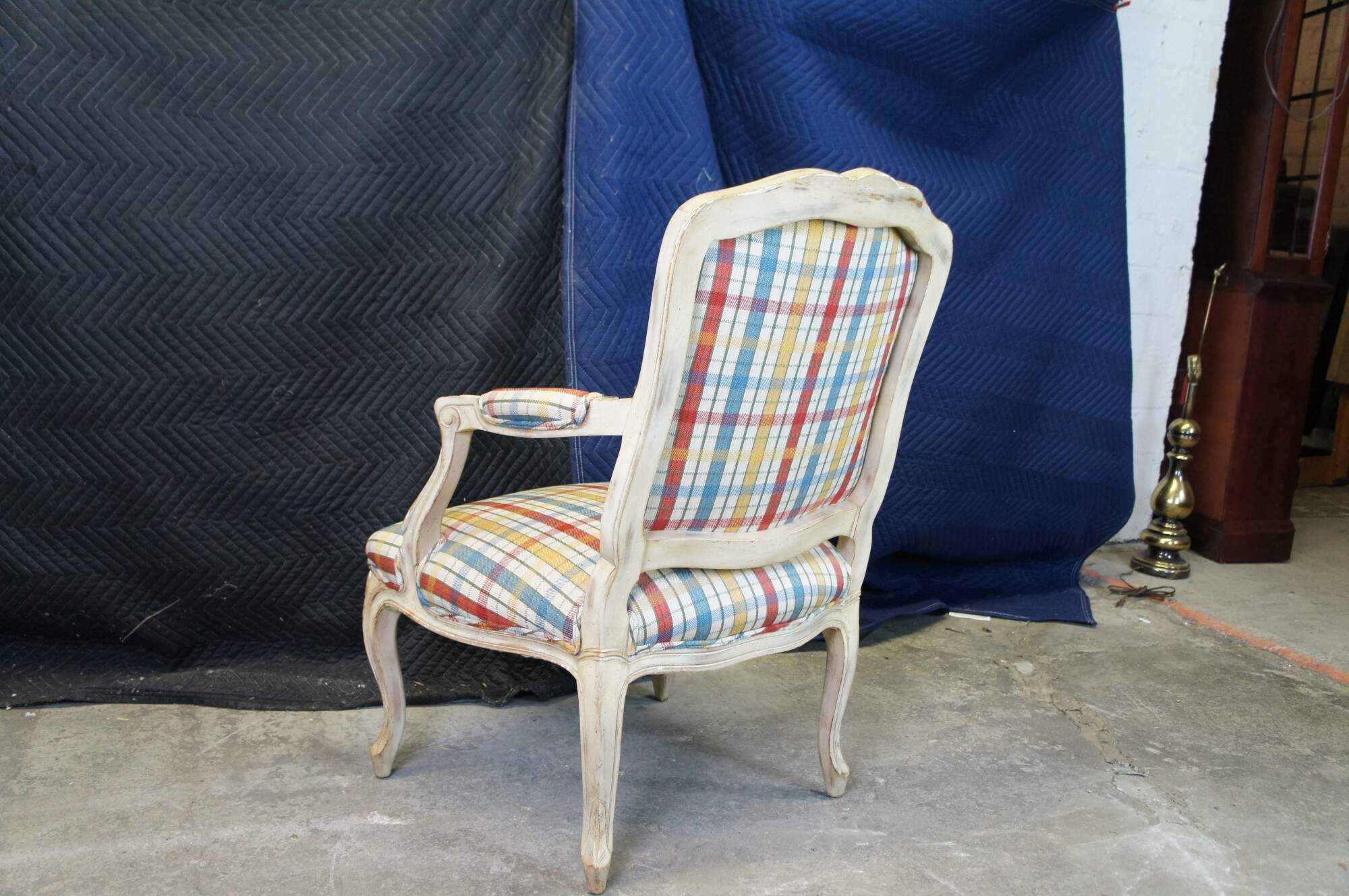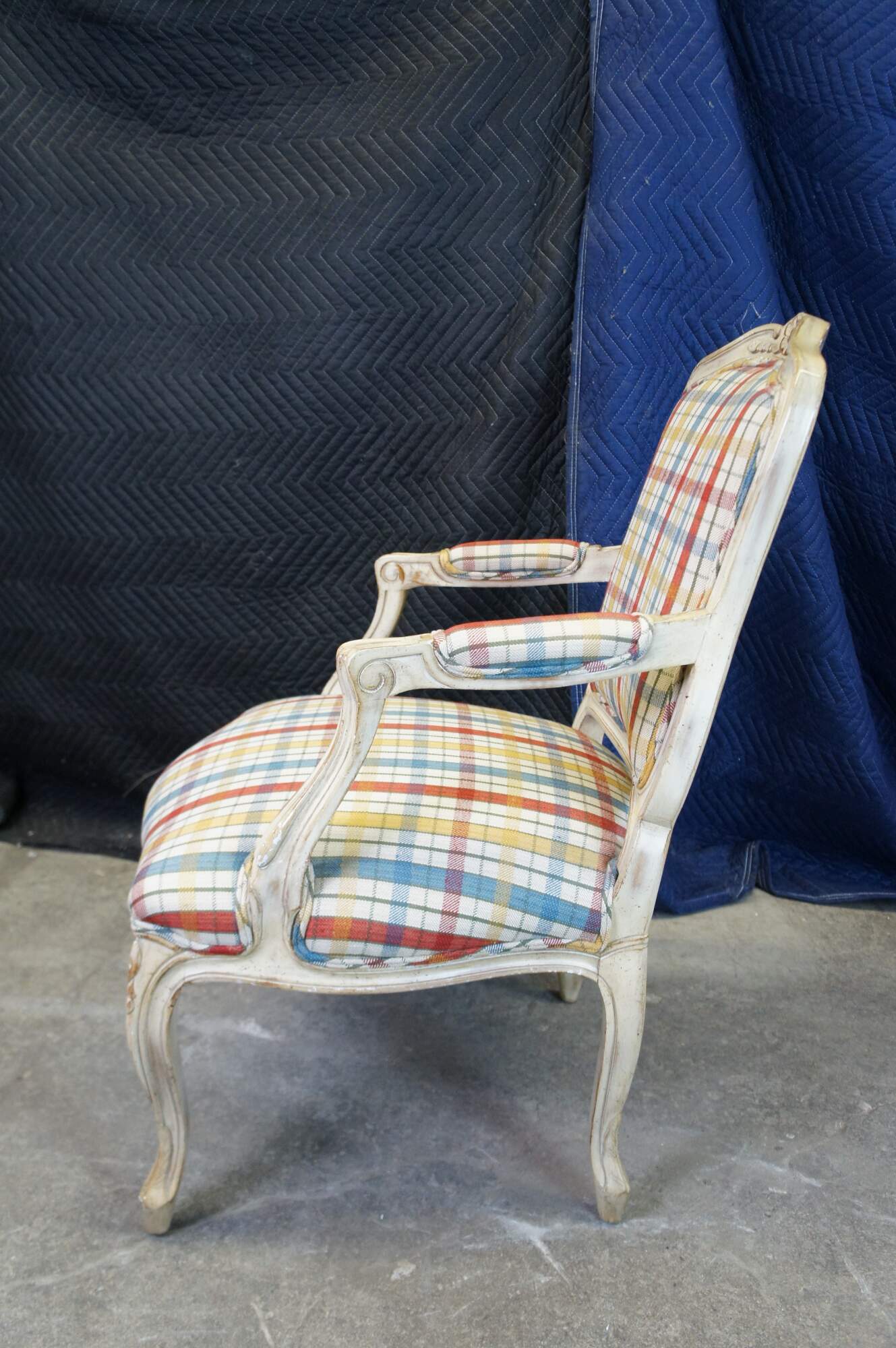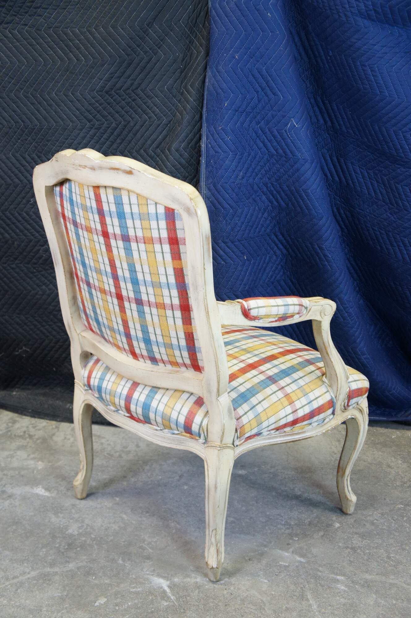 Vintage French Provincial / Louis XV style arm chair. Made of walnut featuring carved floral and serpentine design with fauteuil arms, white painted frame, and cabriole legs. Upholstered in a subtle but vibrant red, blue, yellow, green and white fabric.