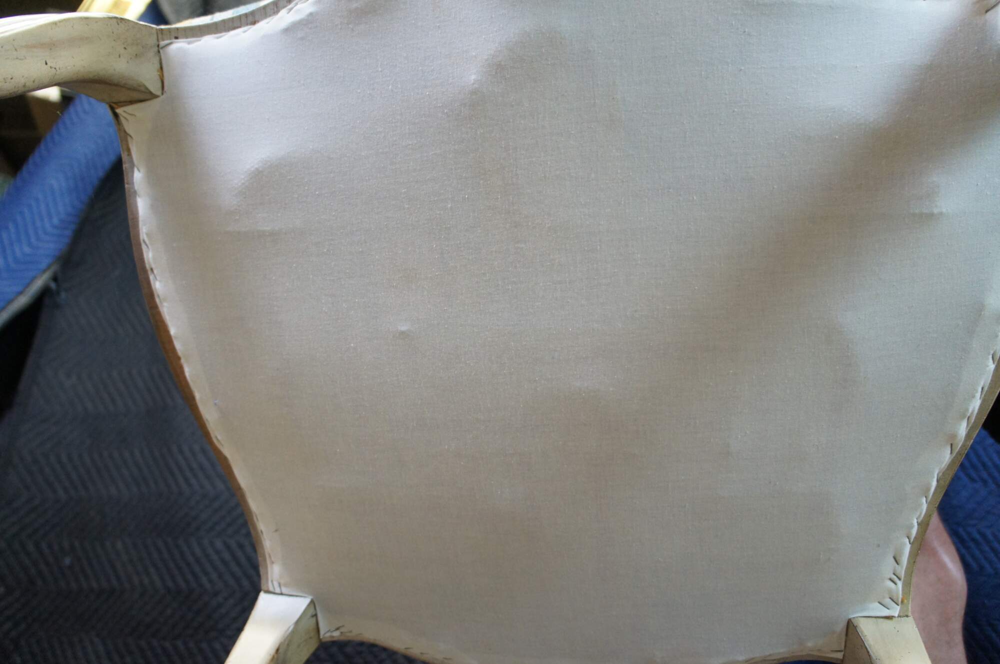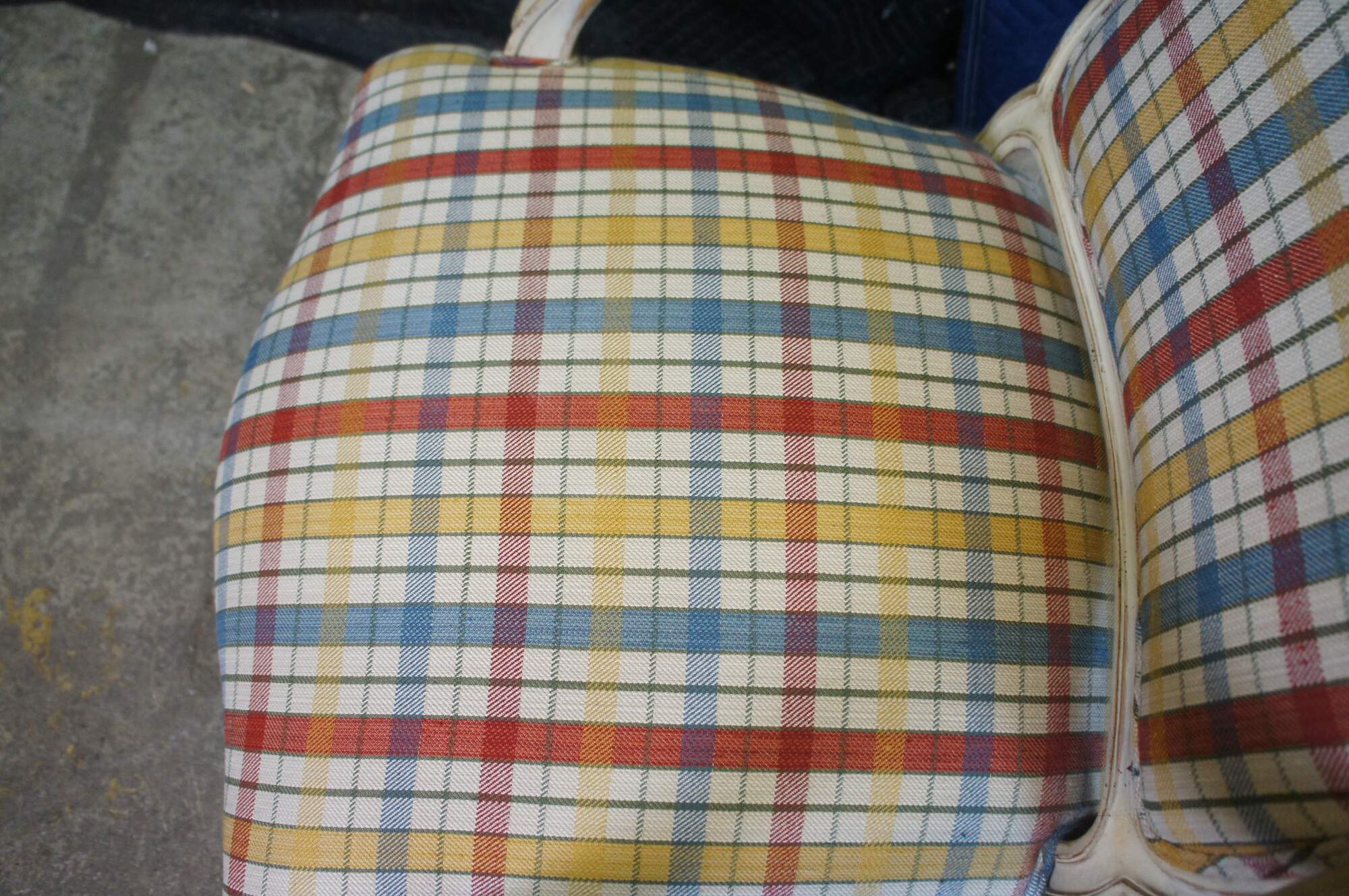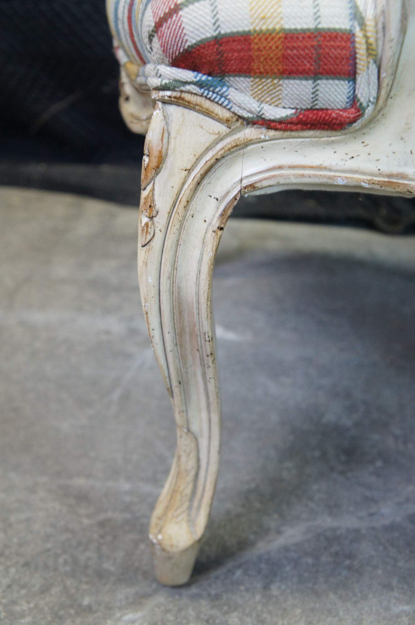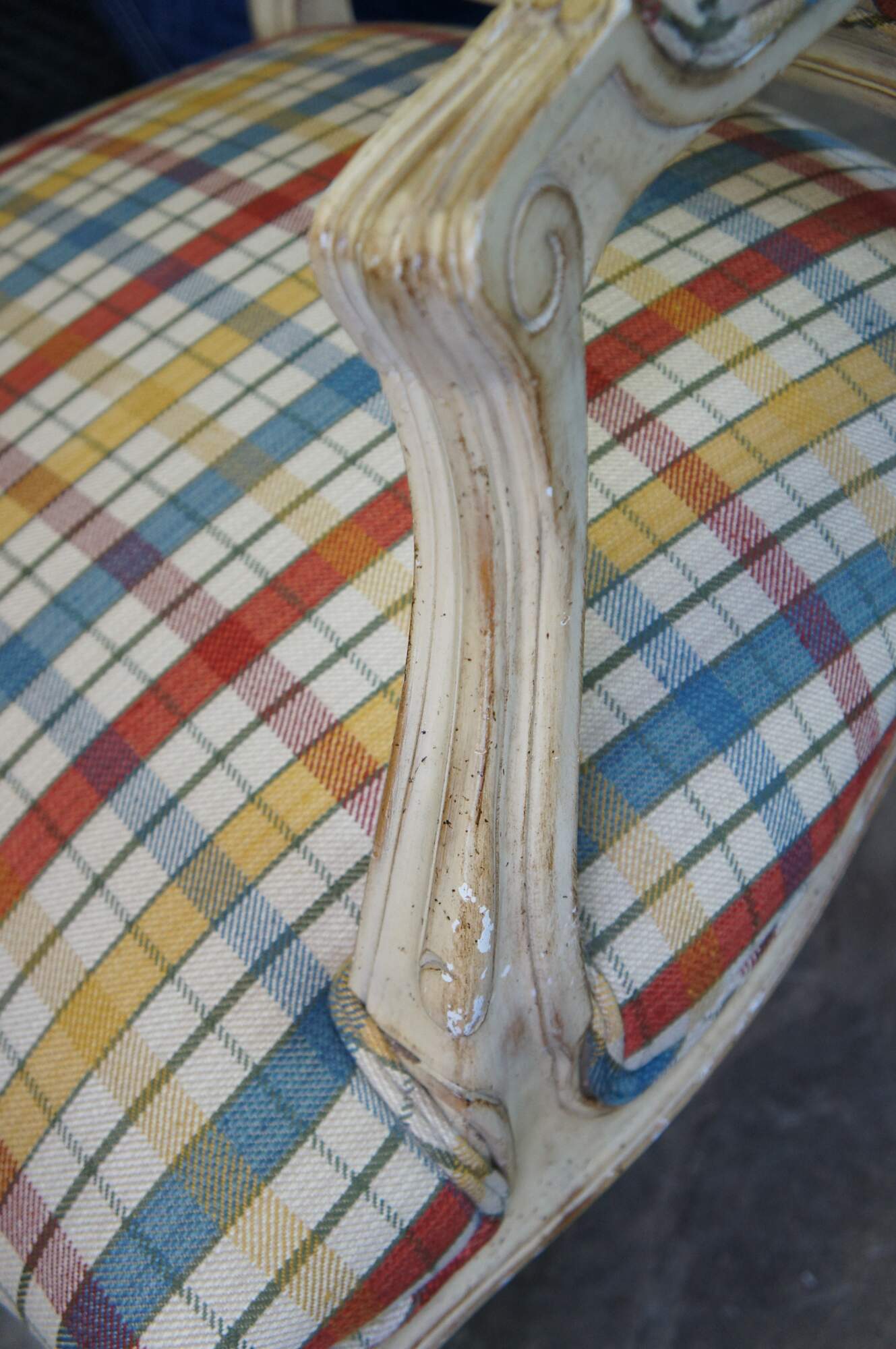 Vintage French Provincial / Louis XV style arm chair. Made of walnut featuring carved floral and serpentine design with fauteuil arms, white painted frame, and cabriole legs. Upholstered in a subtle but vibrant red, blue, yellow, green and white fabric.