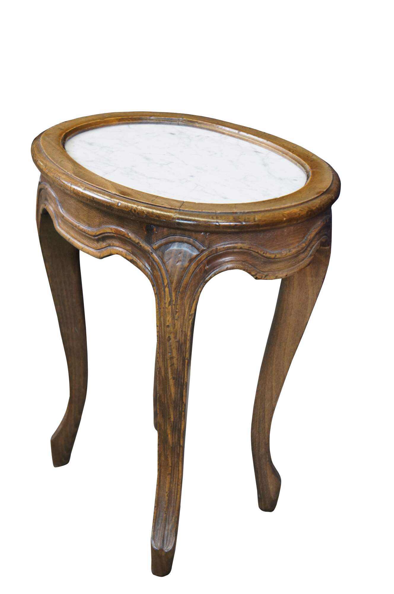 Mid century, circa 1940s, French country side table or plant stand. Made of walnut featuring a white marble top with serpentine accents and cabriole legs.