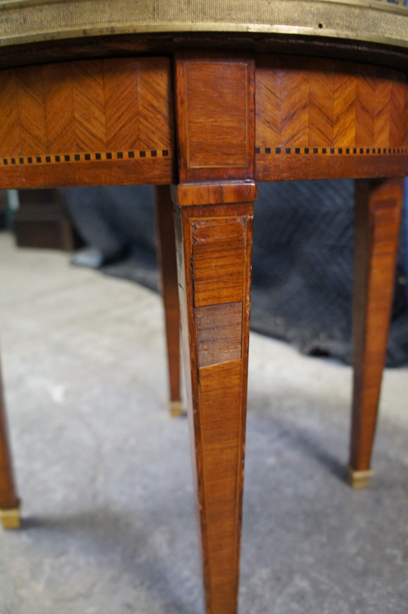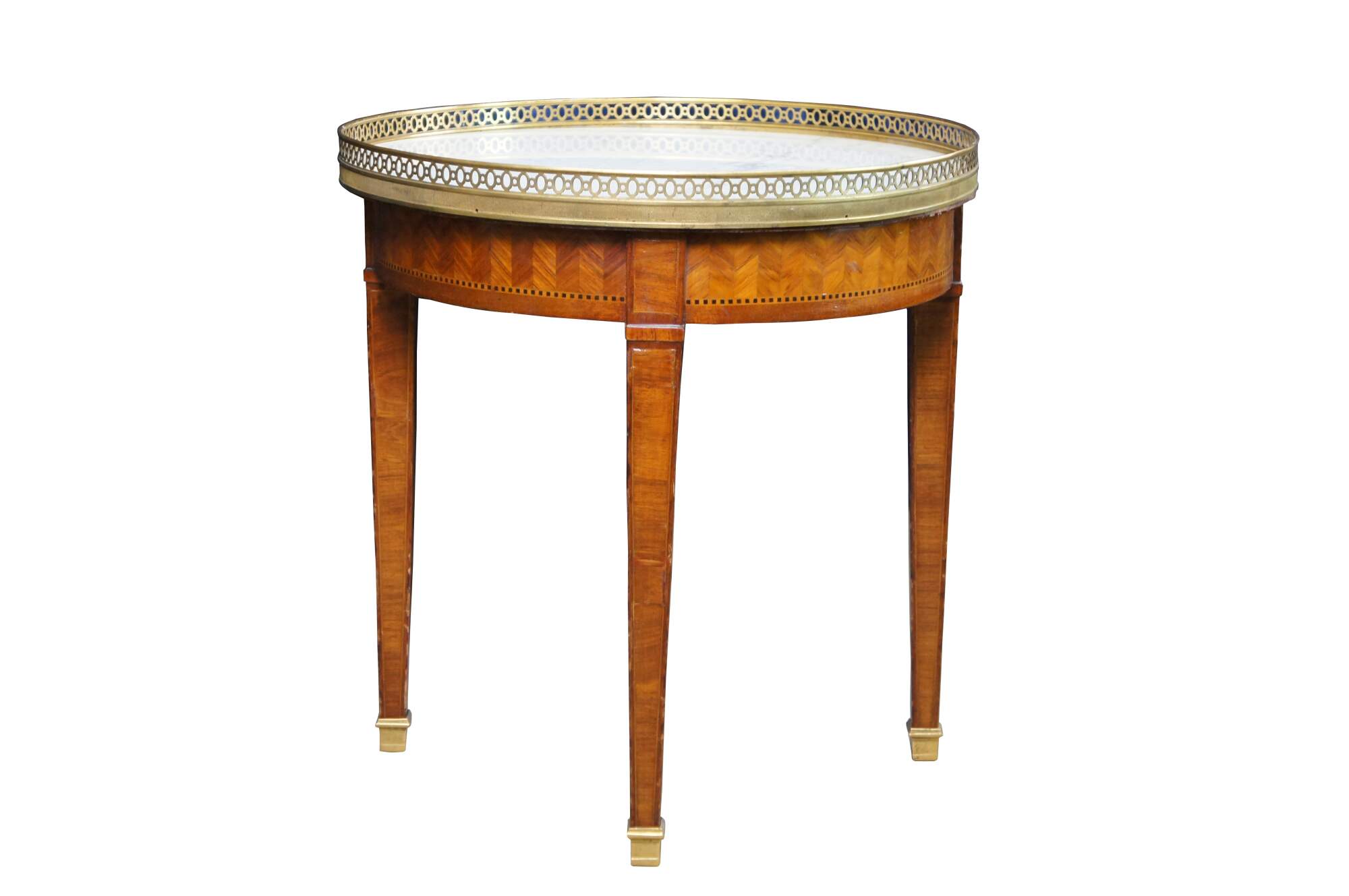 Antique early 20th century French Louis XV style plant stand or side table. Made of inlaid walnut and ebonized geometric banding with a chevron parquetry design featuring round form with marble top encased by pierced / reticulated gallery over one drawer with tapered legs and brass capped feet.