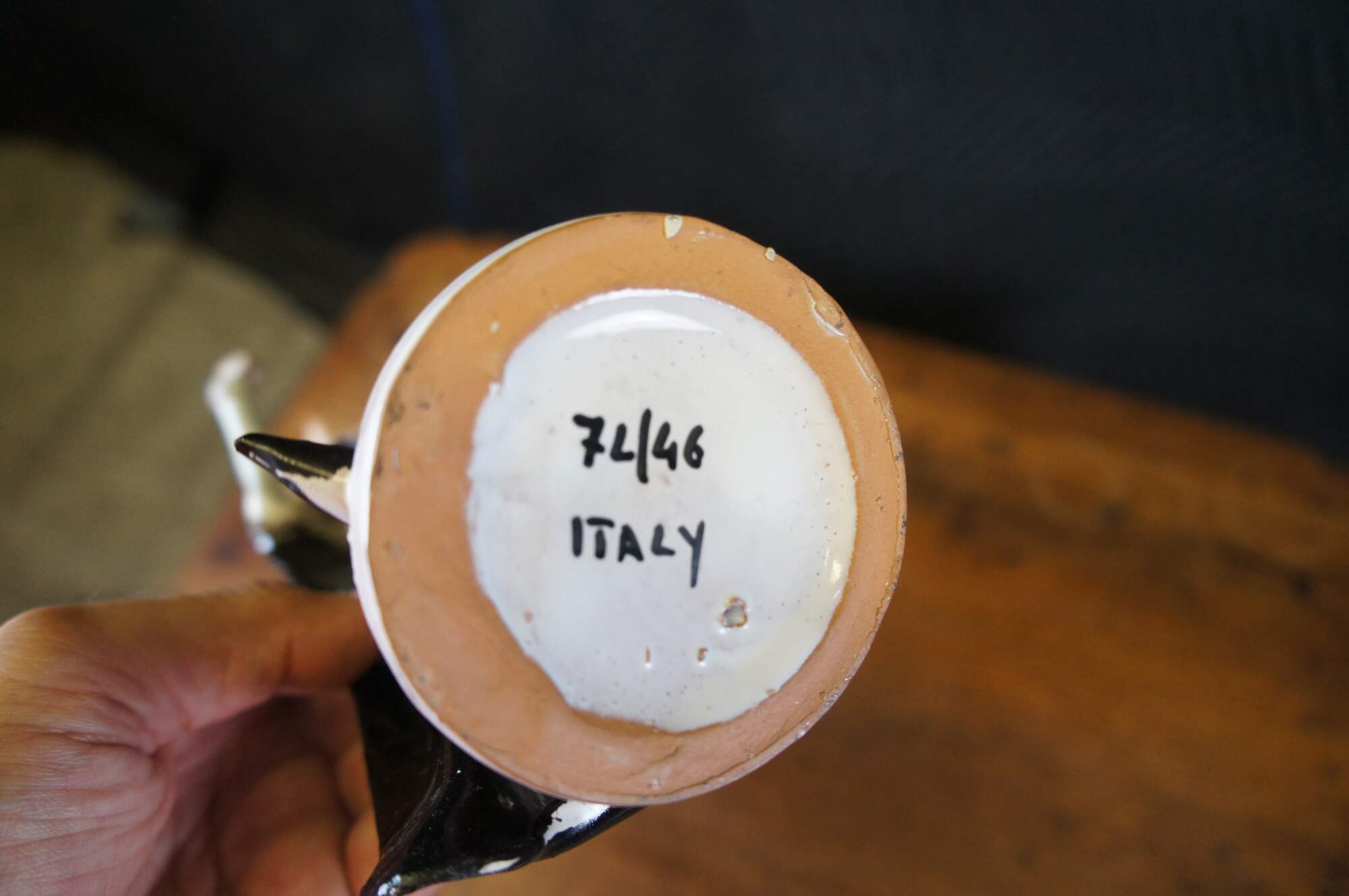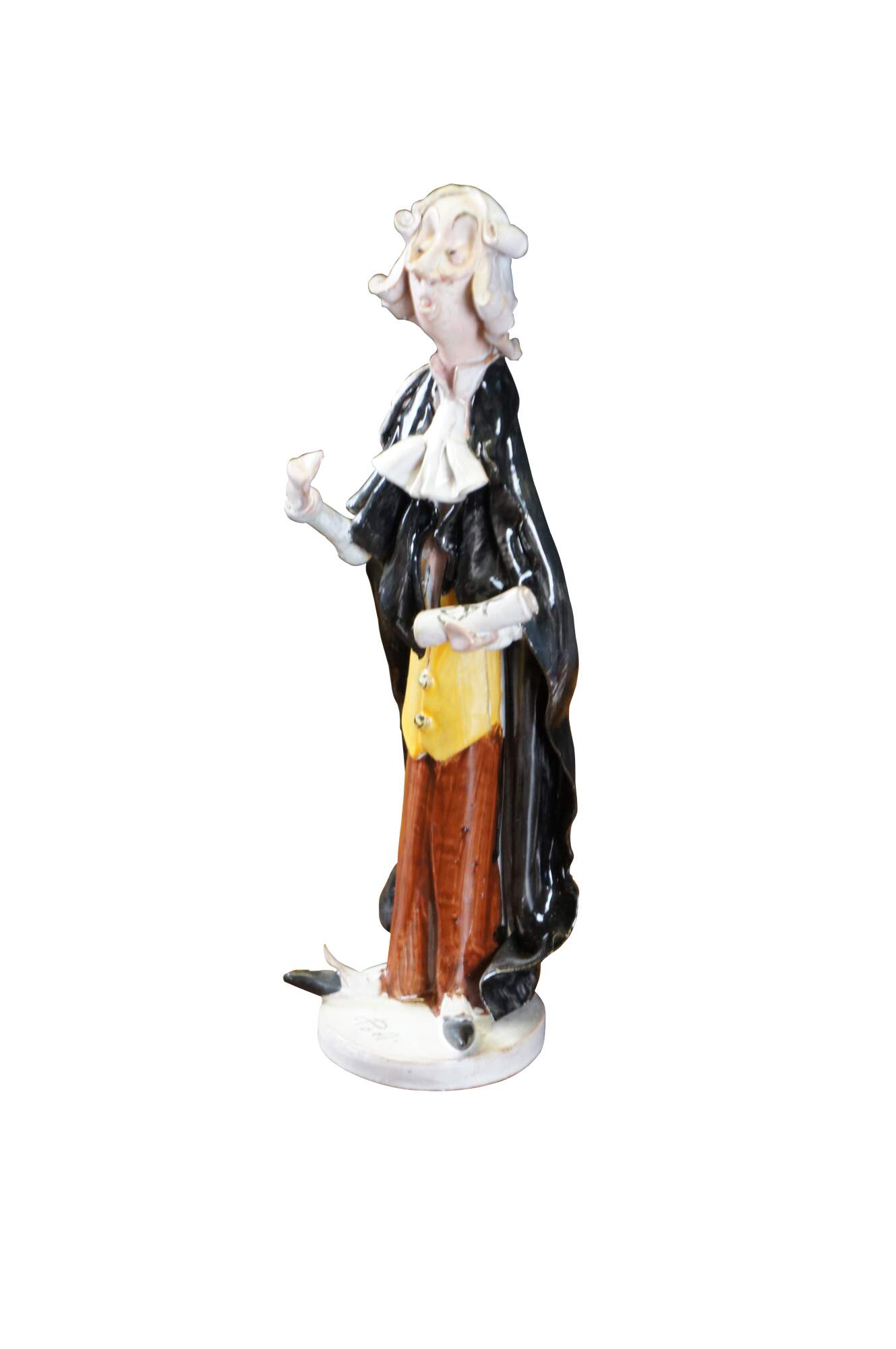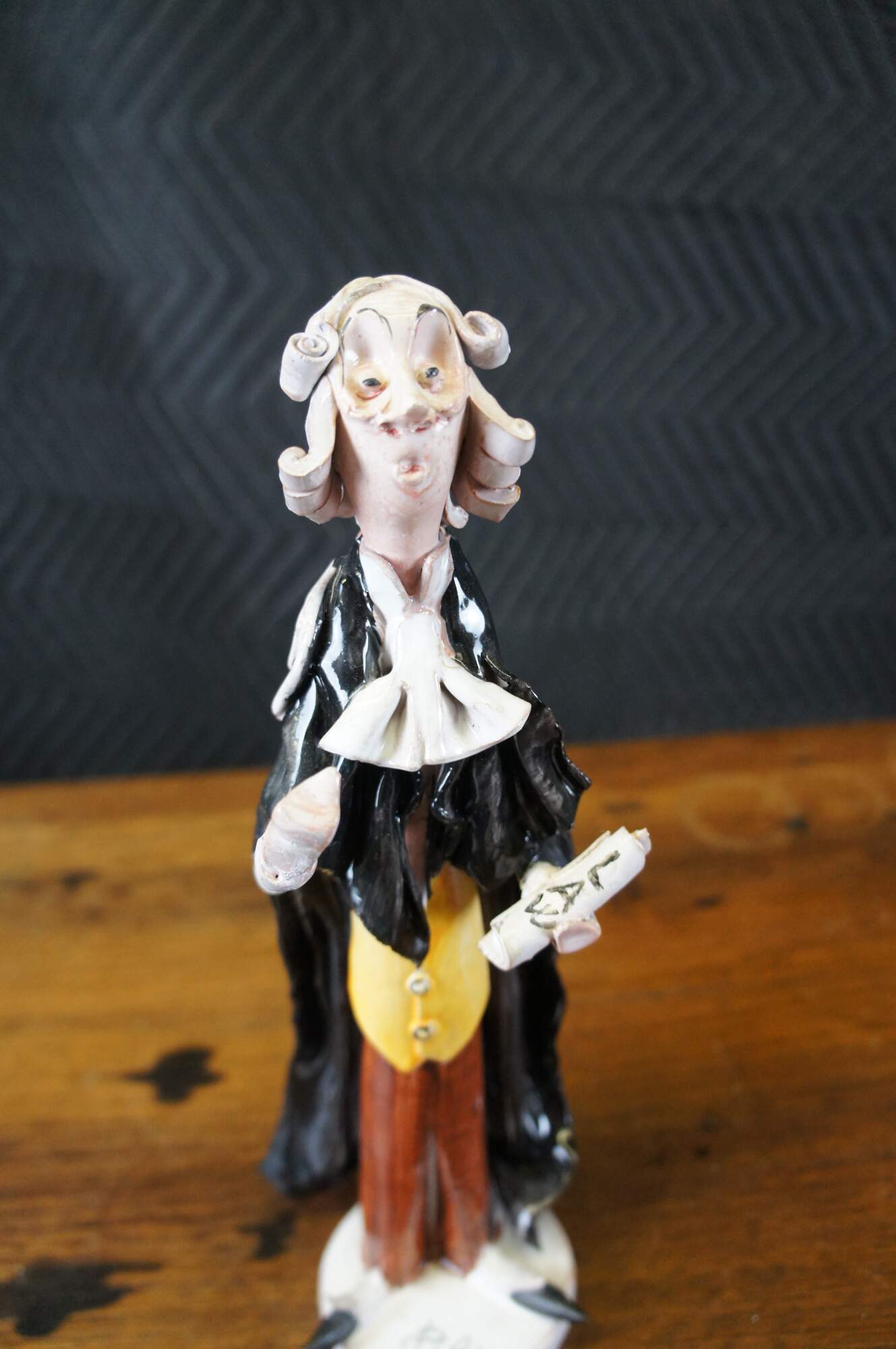 Scat by Poli Cesare, a whimsical Italian art pottery figurine featuring a lawyer / barrister / judge in full dress, holding a scroll that reads Law.