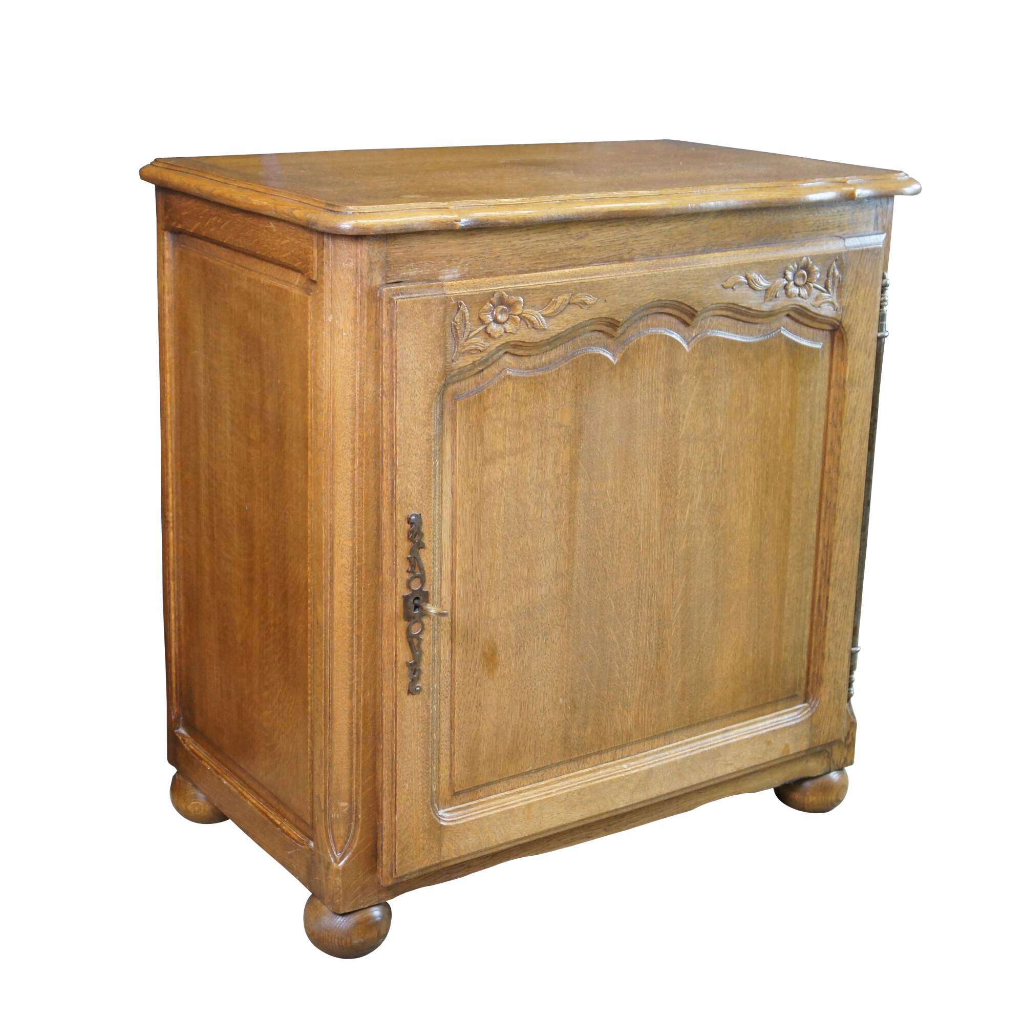 Antique French Provincial country or farmhouse Confiturier / jam console / cabinet / cupboard / buffet. Made of oak featuring Louis XIII styling with scalloped top and floral carved door with long hinged hardware. The cabinets interior was modified by to includes a drawer with multiple shelves and files / cubbies.