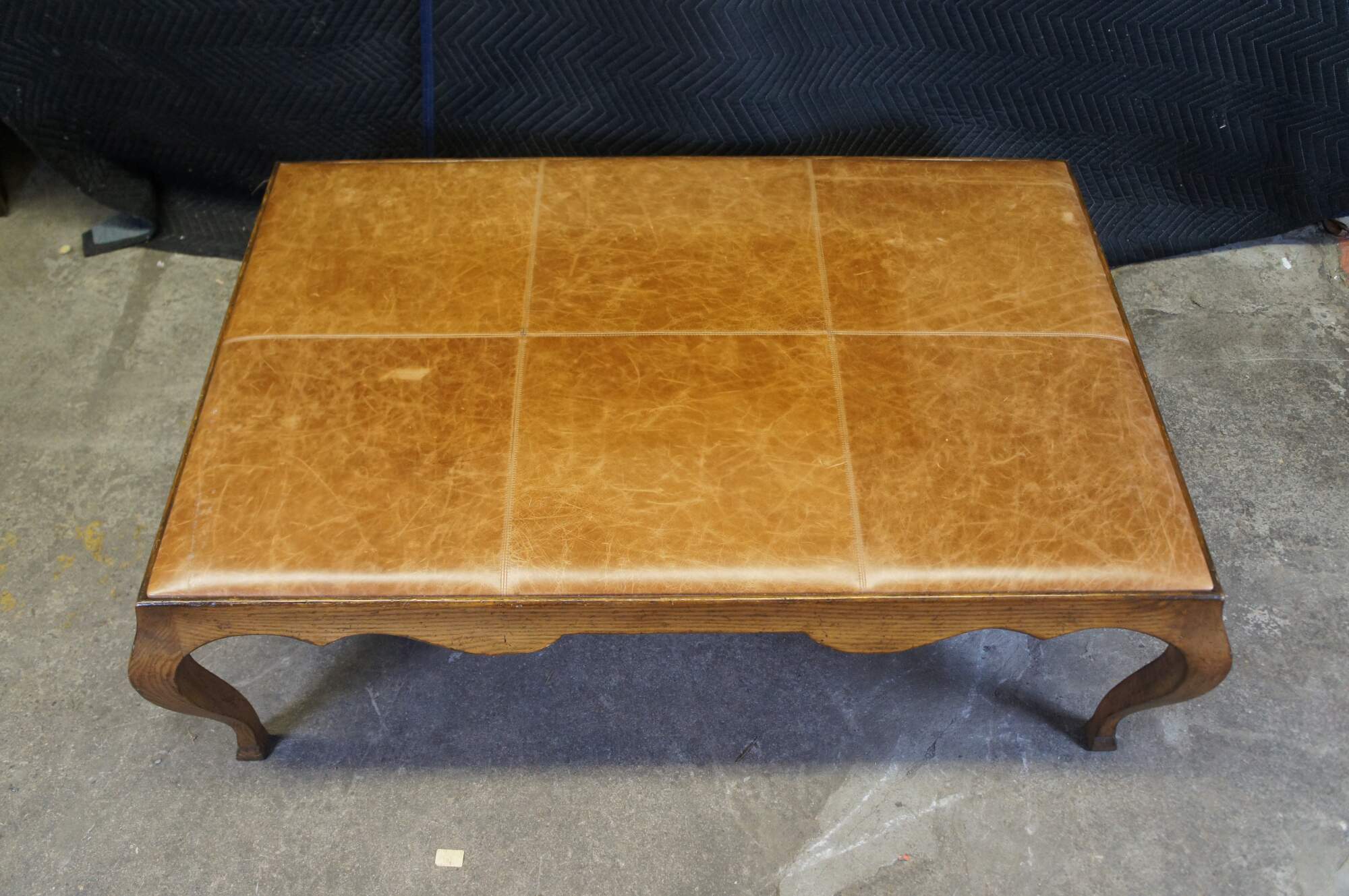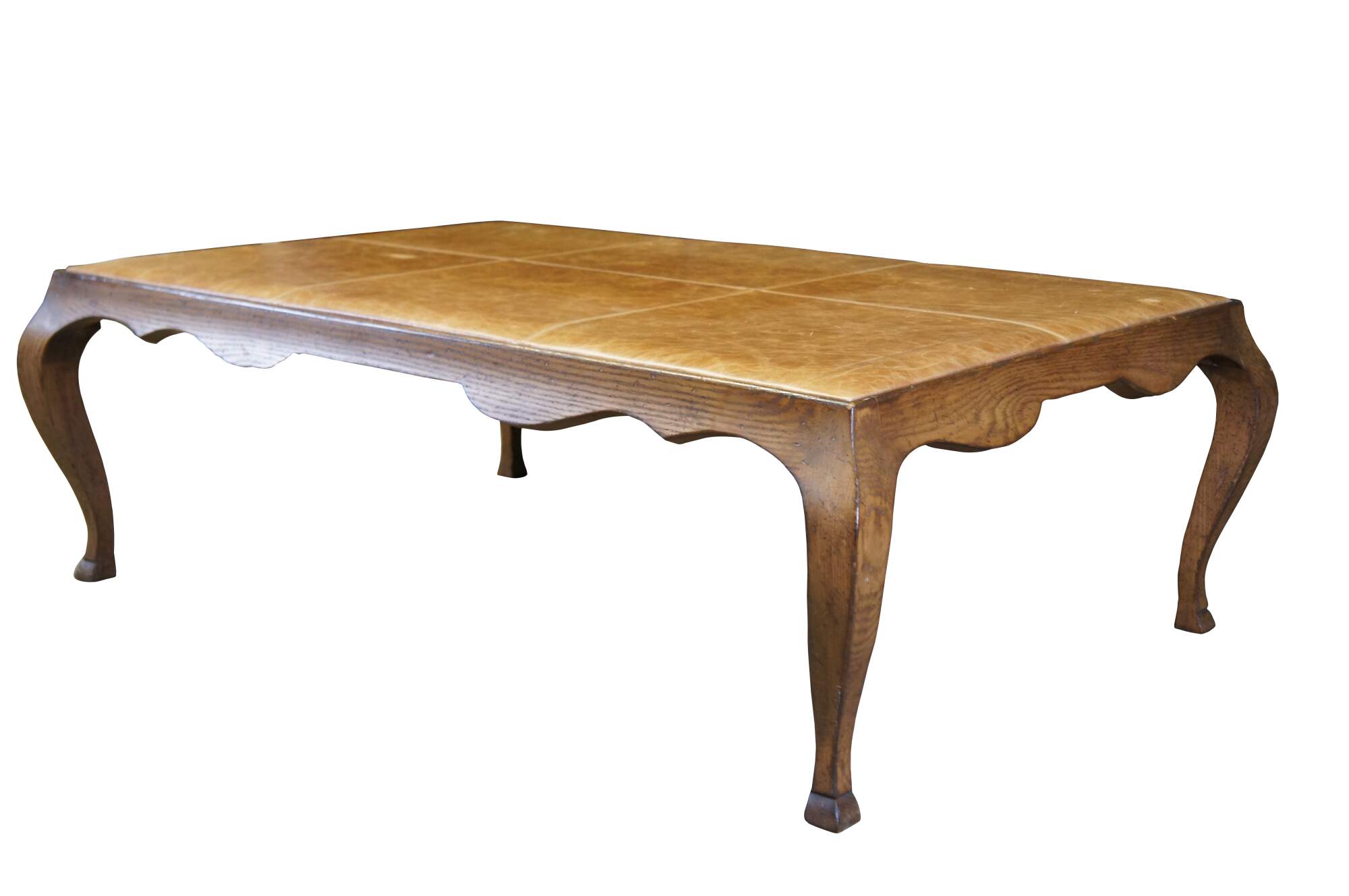 A very large and impressive antique French country / farmhouse coffee / cocktail table or footstool / ottoman. Made of oak featuring rectangular form with leather top, serpentine skirt and cabriole legs.
