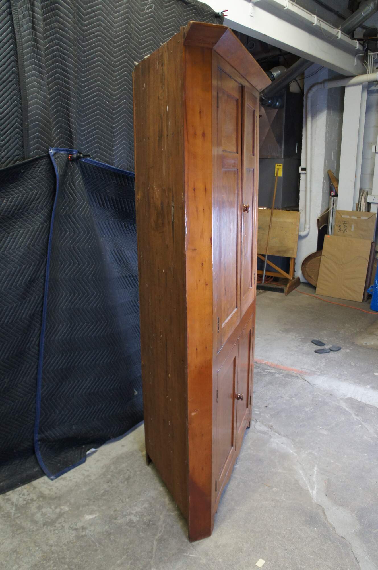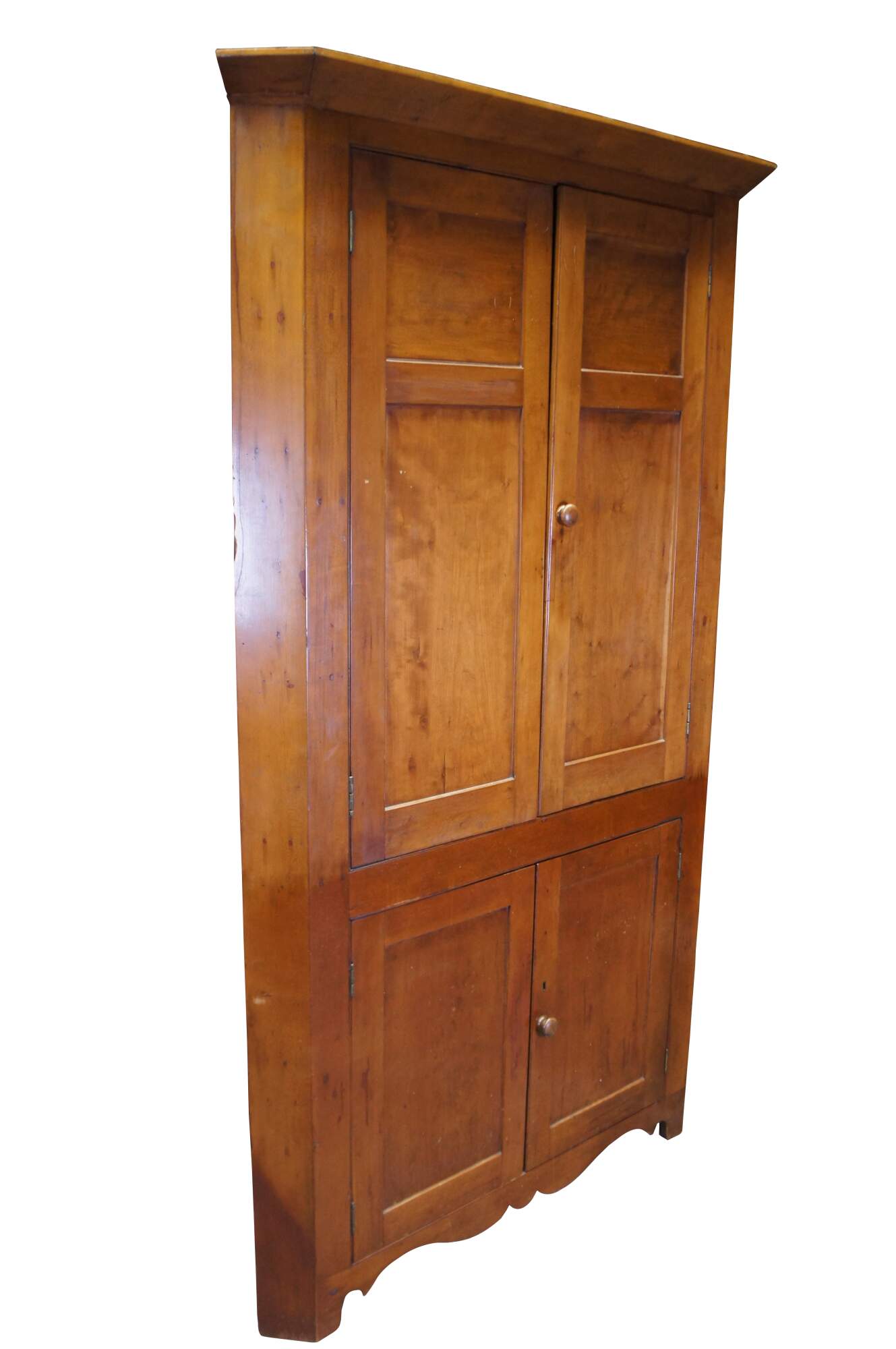 Antique primitive American china cabinet / corner cupboard. Made from cherry wood featuring triangular form with paneled doors that op to multiple storage shelves, some with plate grooves.