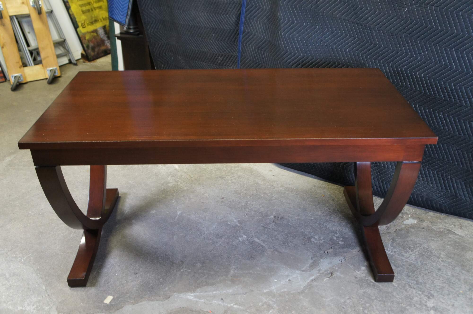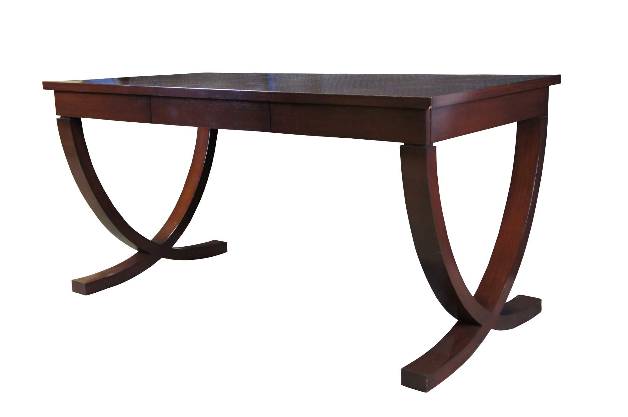 Vintage writing desk in the style of Michael Vanderbyl for Decca / Bolier & Co. Made from rich mahogany veneers, having a rectangular form with three fitted drawers and raised on modern curule x form legs.