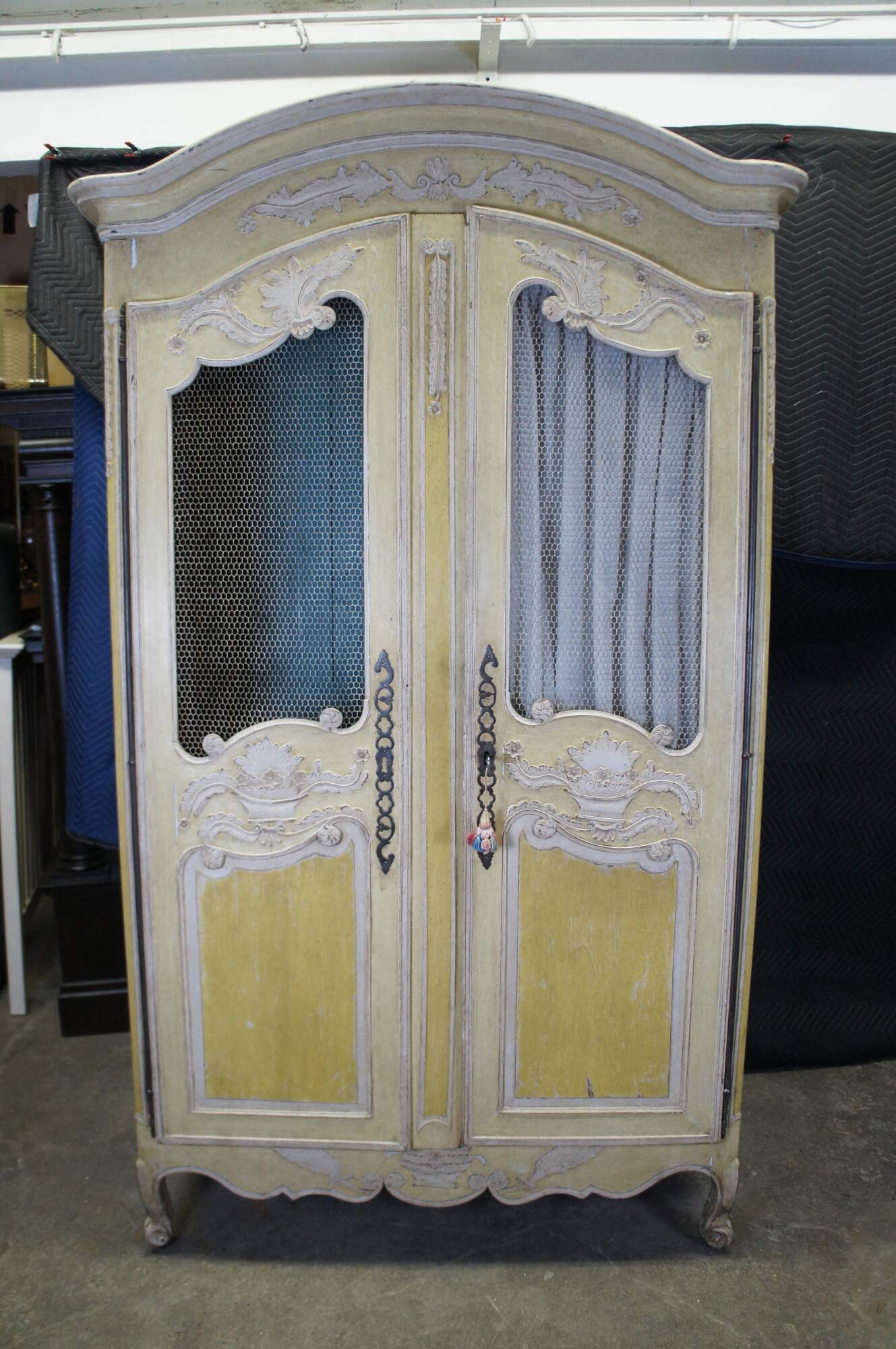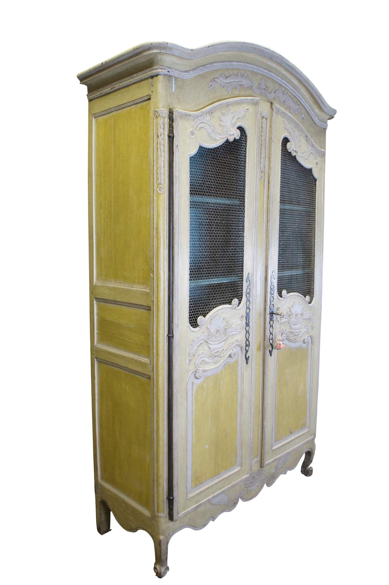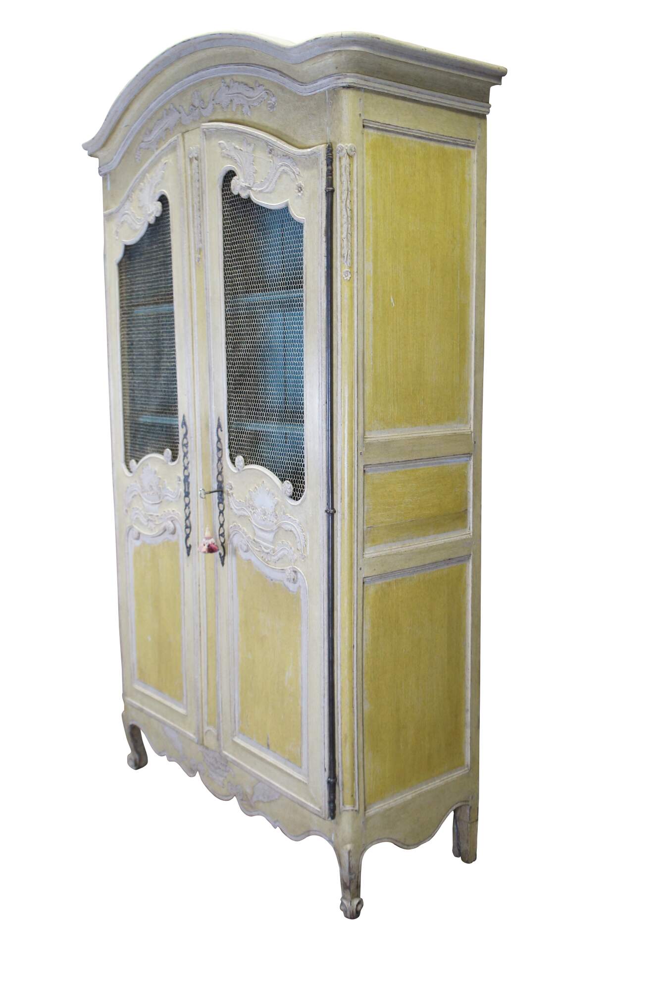 Antique late 18th Century French armoire. Featuring a blend of Country French and Provincial styling with floral and acanthus accents, chicken wire drape doors with long iron hinge, and cabriole legs. Opens to blue painted interior with four shelves and optional linen drapes to cover doors.
