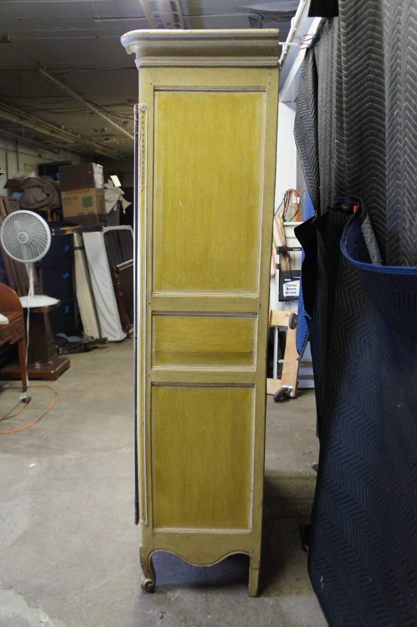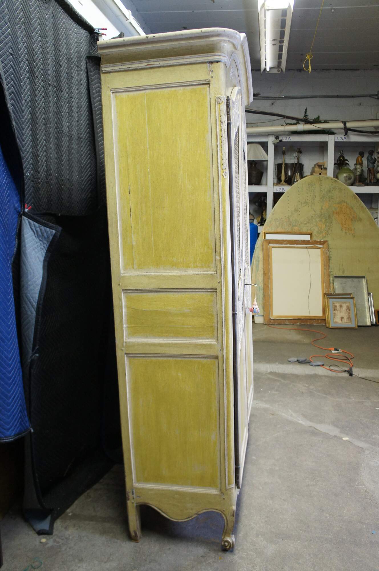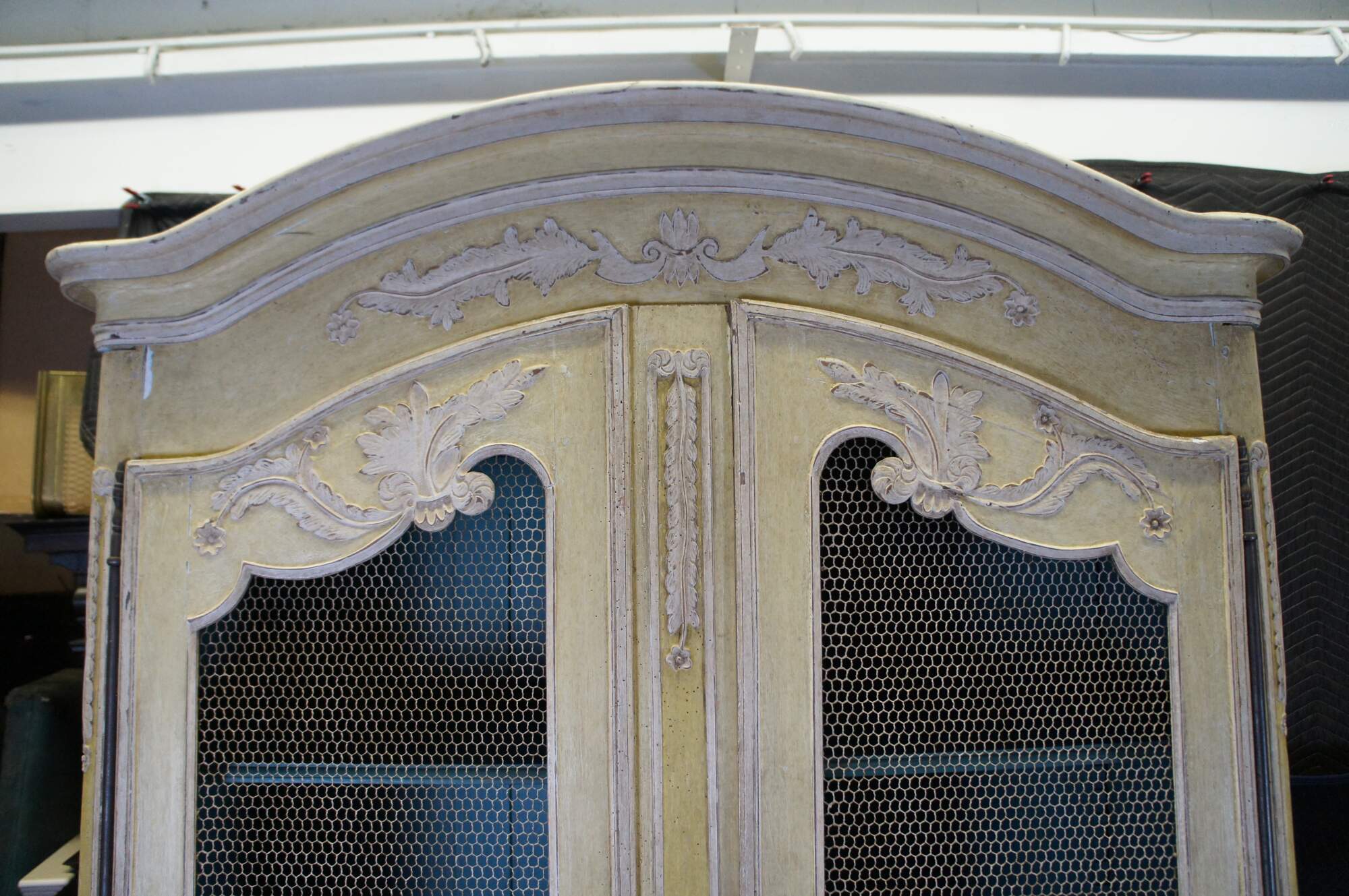 Antique late 18th Century French armoire. Featuring a blend of Country French and Provincial styling with floral and acanthus accents, chicken wire drape doors with long iron hinge, and cabriole legs. Opens to blue painted interior with four shelves and optional linen drapes to cover doors.