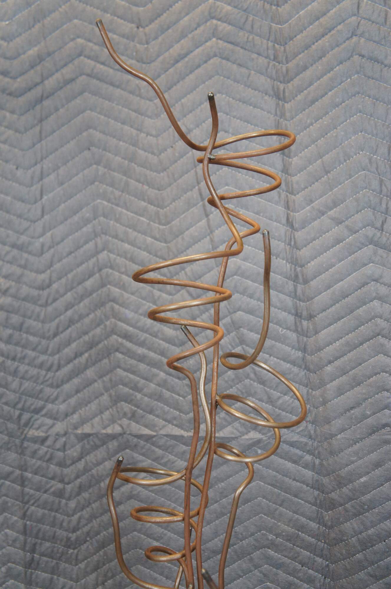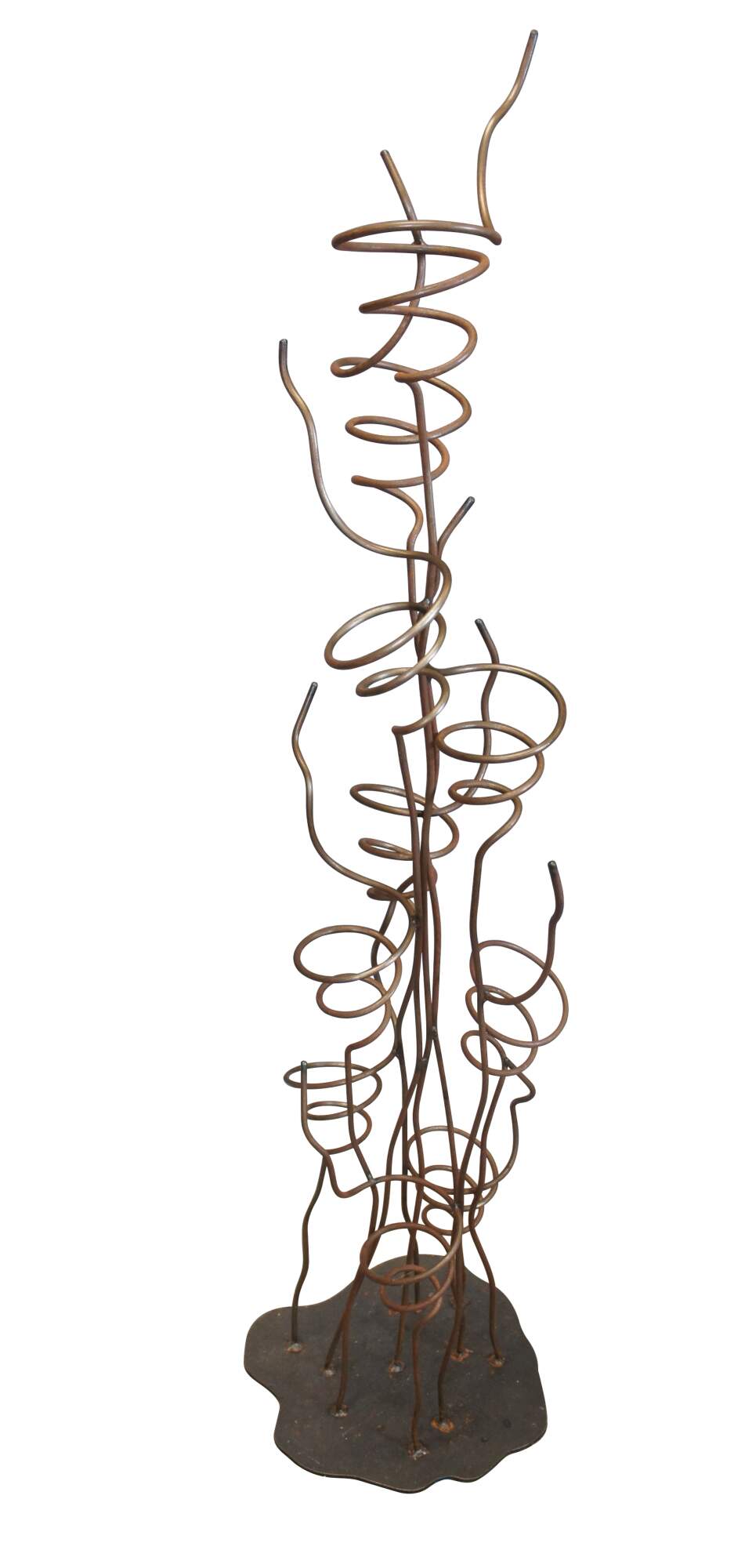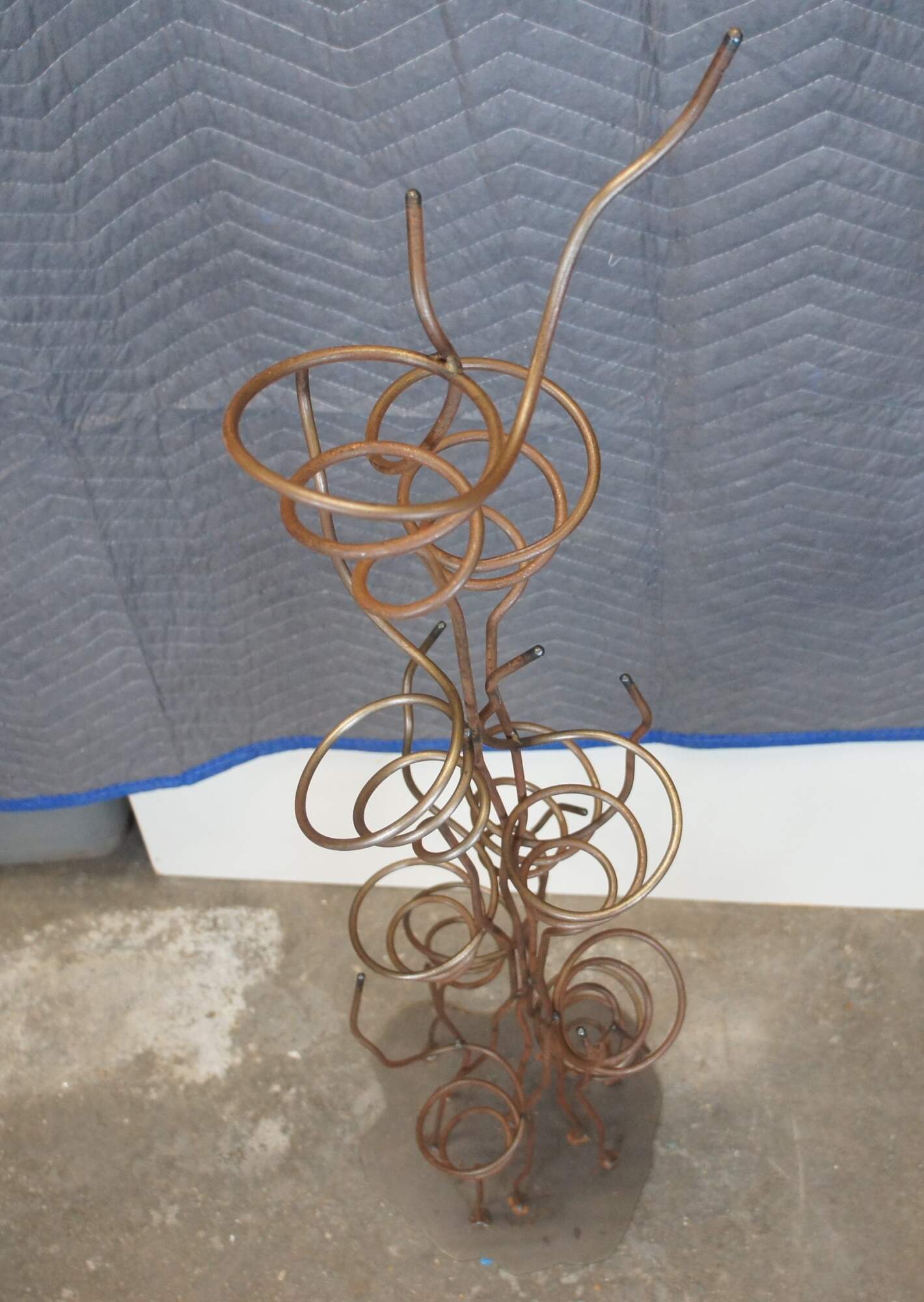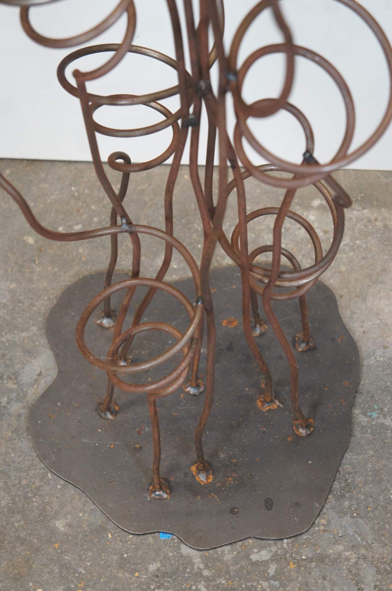 Mid to Late 20th century abstract Brutalist / post modern sculpture / wine tree display rack. Made of wrought iron featuring a freeform base that supports 10 independent twisted iron bottle holders.