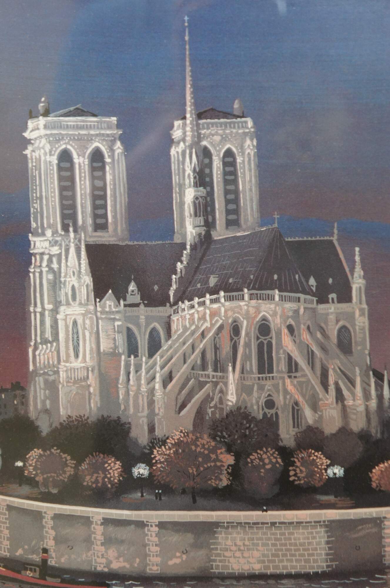 Late 20th century lithograph poster print titled "Le Chevet de Notre Dame la Nuit" (Our Lady's Bedside at Night) by Michel Delacroix. Depicts a nighttime view of the Cathedral of Notre Dame in Paris seen from Ile Saint-Louis. Genesis Galleries Inc, Certificate of Authenticity - Registration No. 08277. Brown and gray layered may; gilt frame with rounded bevel.