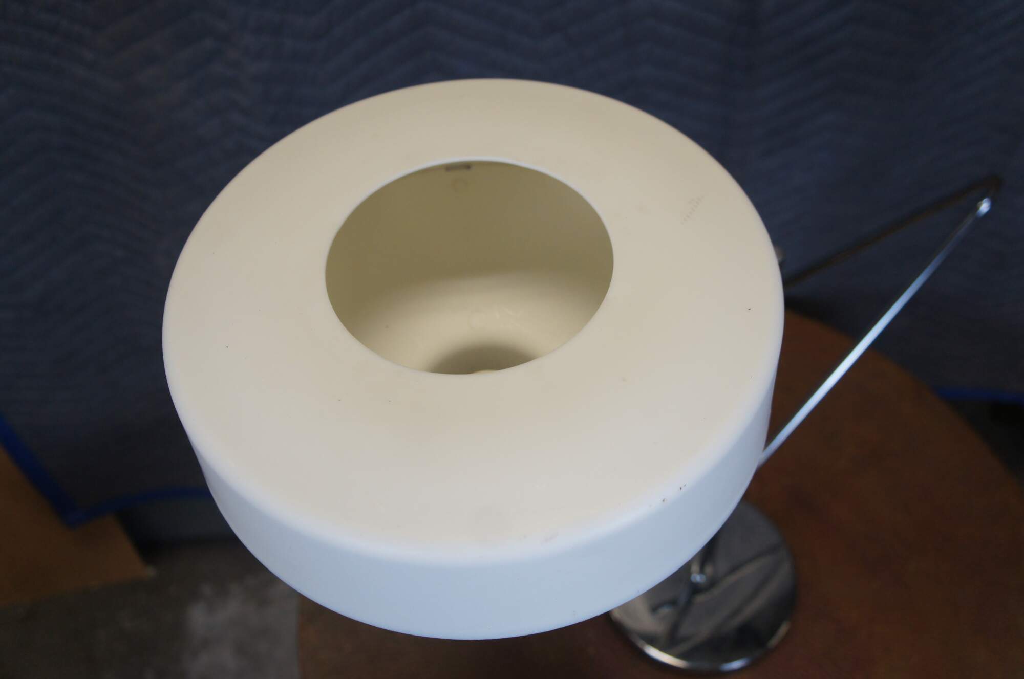 Late 20th century modernist style table lamp designed by Thomas O'Brien. Round base with geometric / triangular tube body, leading to a tub shaped white plastic shade.