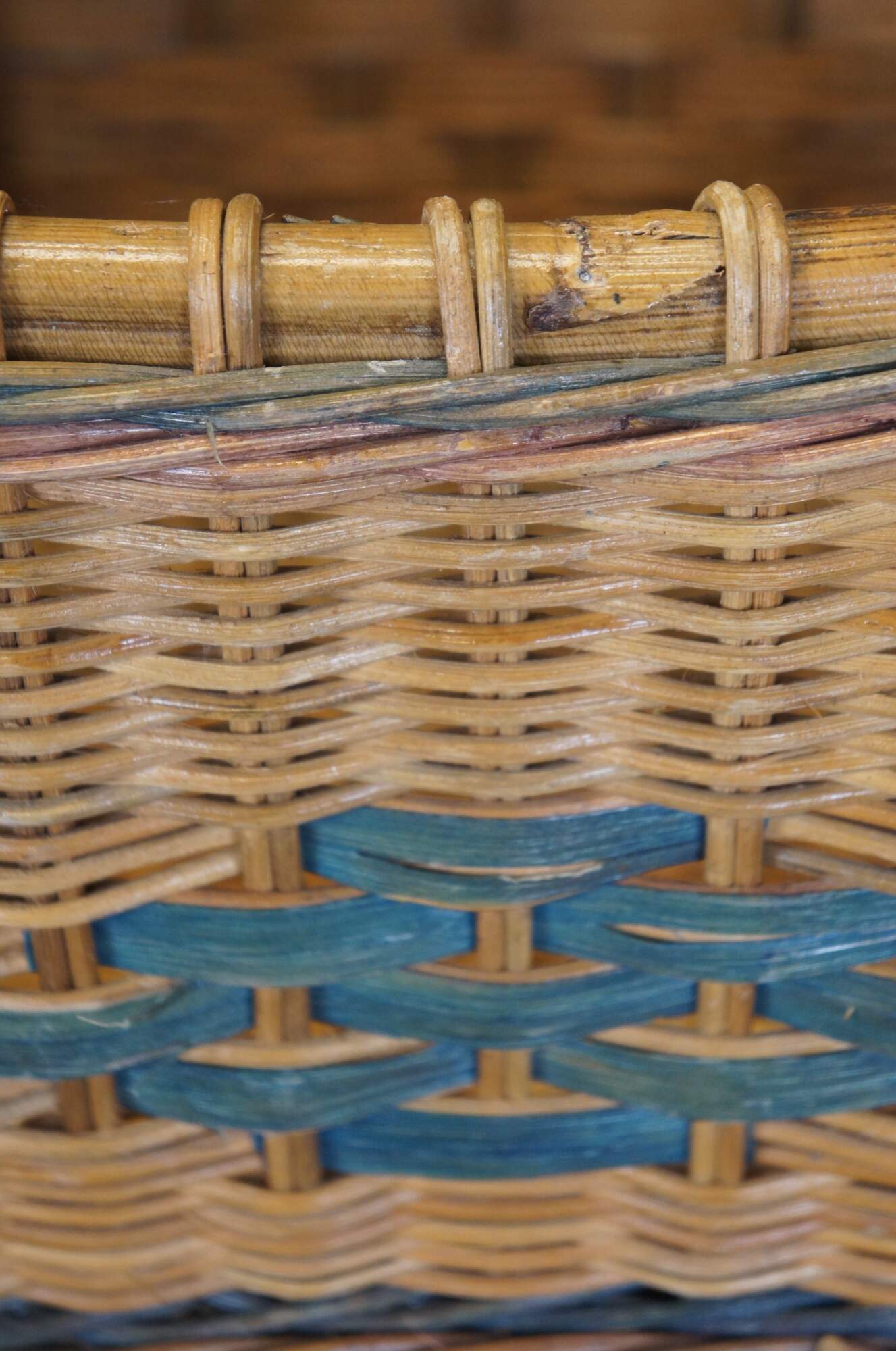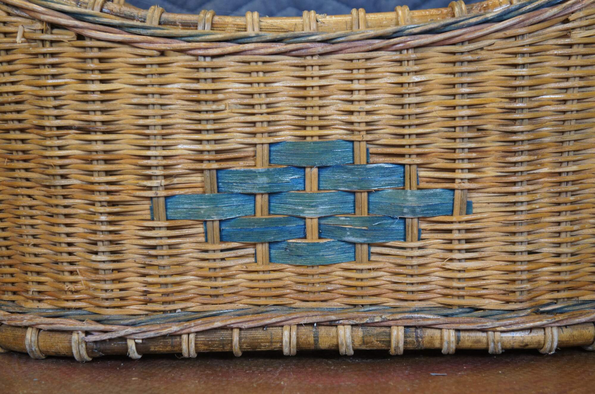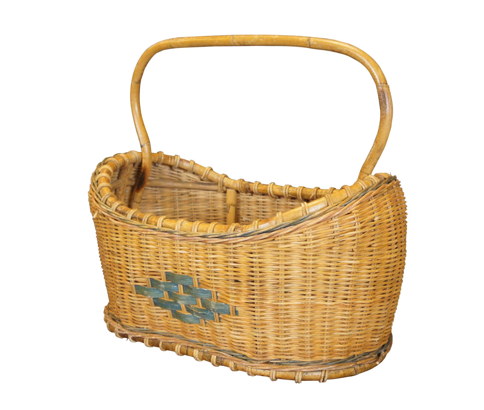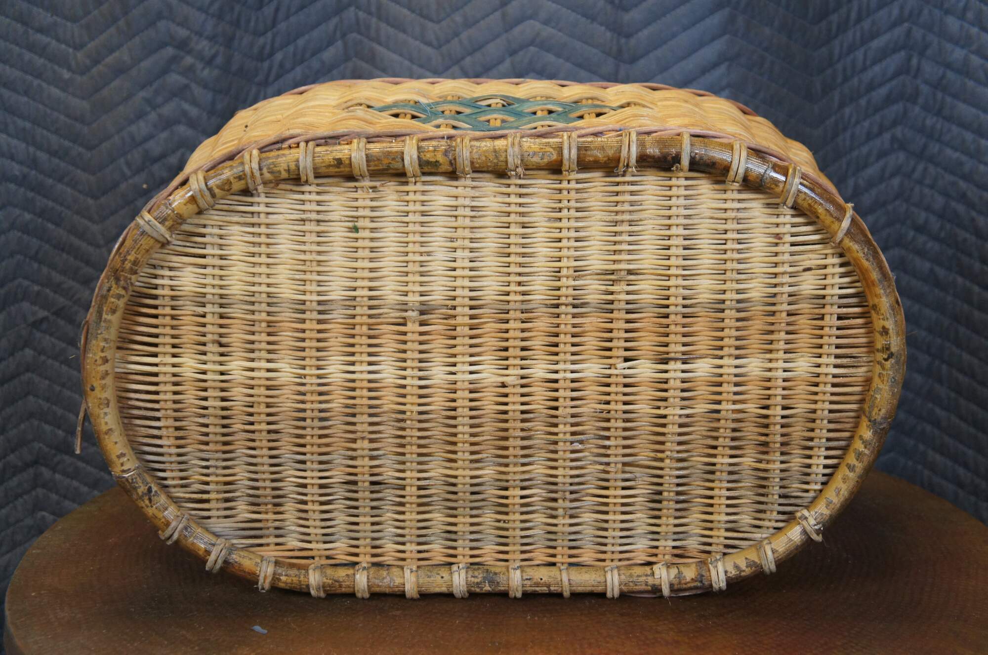 Extra large vintage woven wicker country farmhouse basket featuring an oval shape with boat shaped top edge, green diamond motif on the sides, pink and green twisted trim, and a bent bamboo handle.