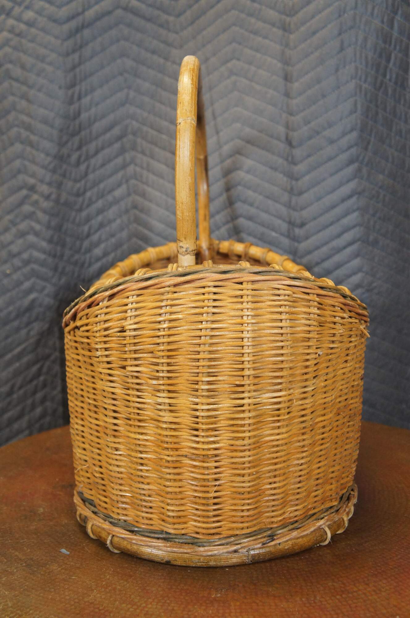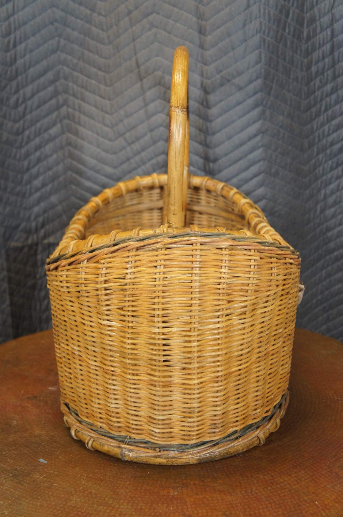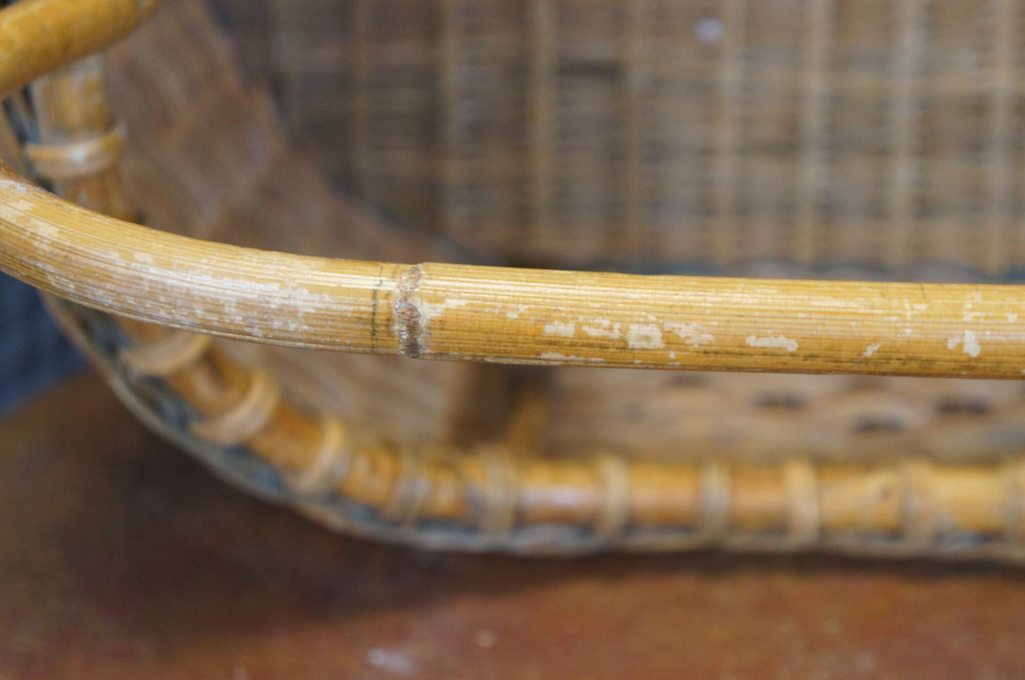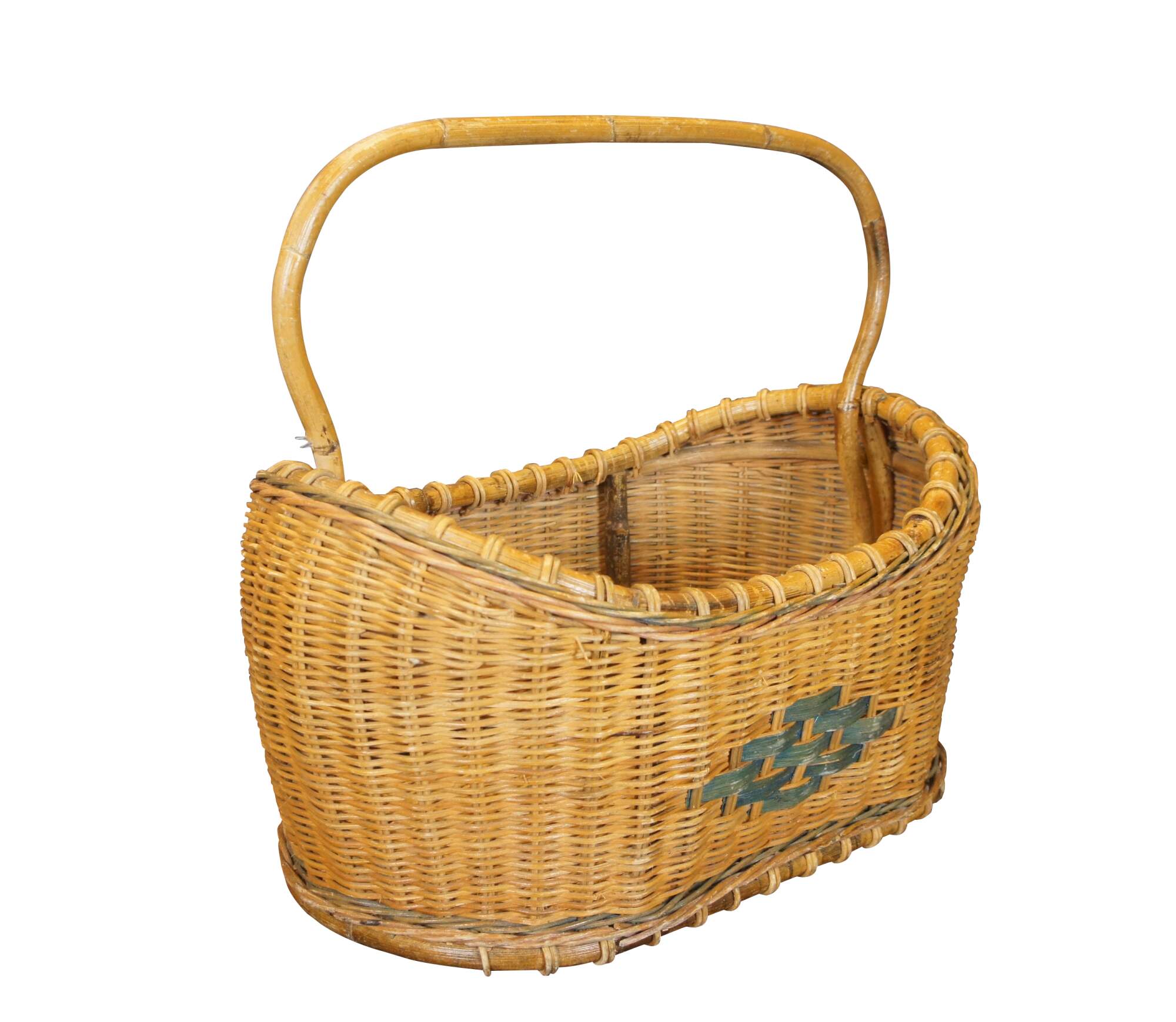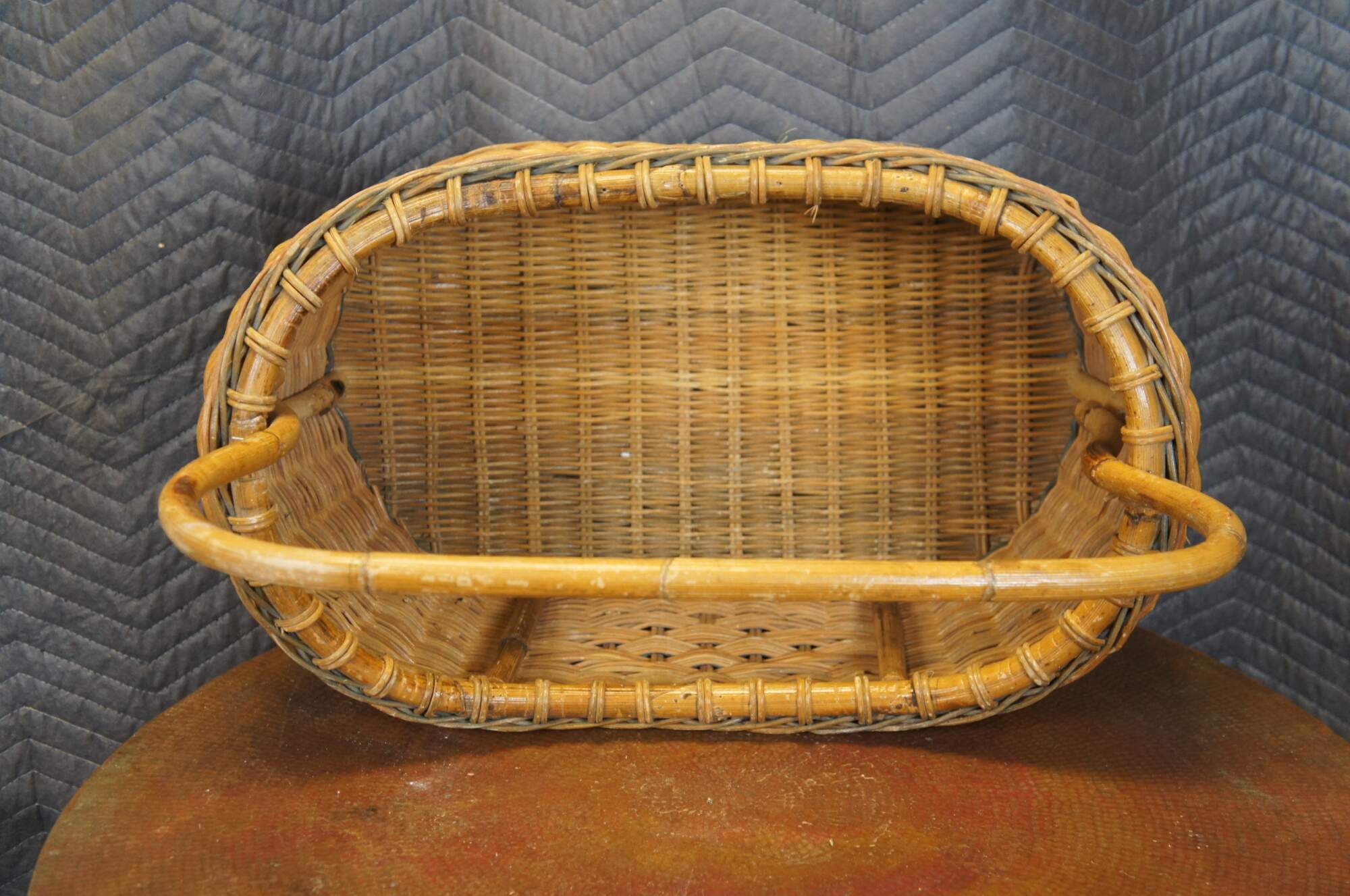 Extra large vintage woven wicker country farmhouse basket featuring an oval shape with boat shaped top edge, green diamond motif on the sides, pink and green twisted trim, and a bent bamboo handle.