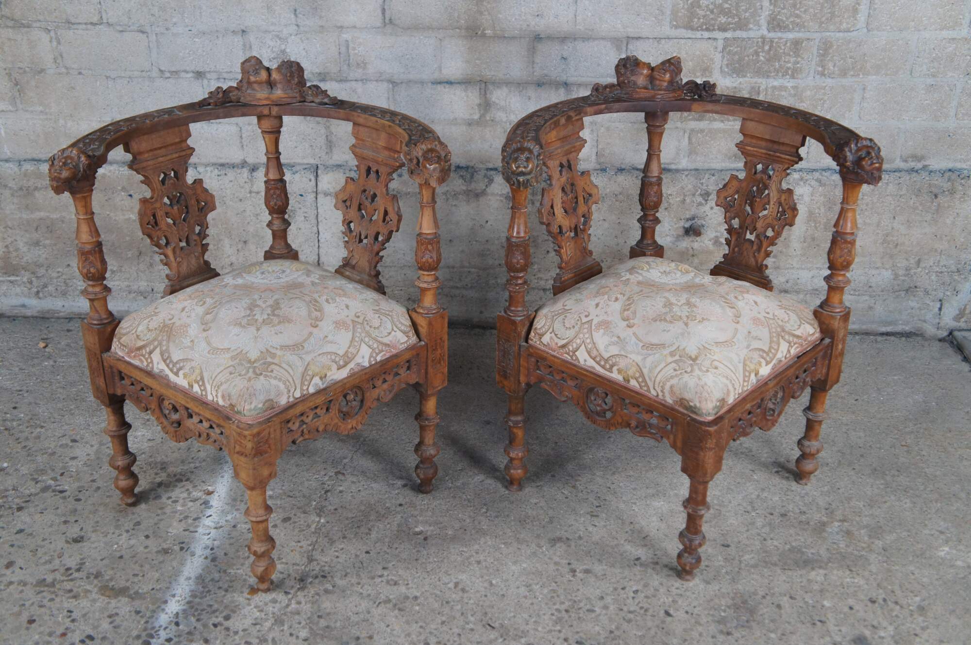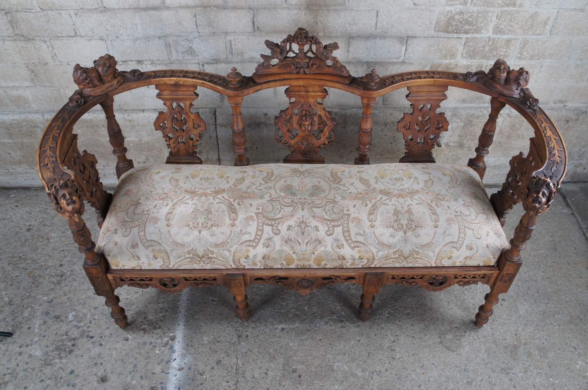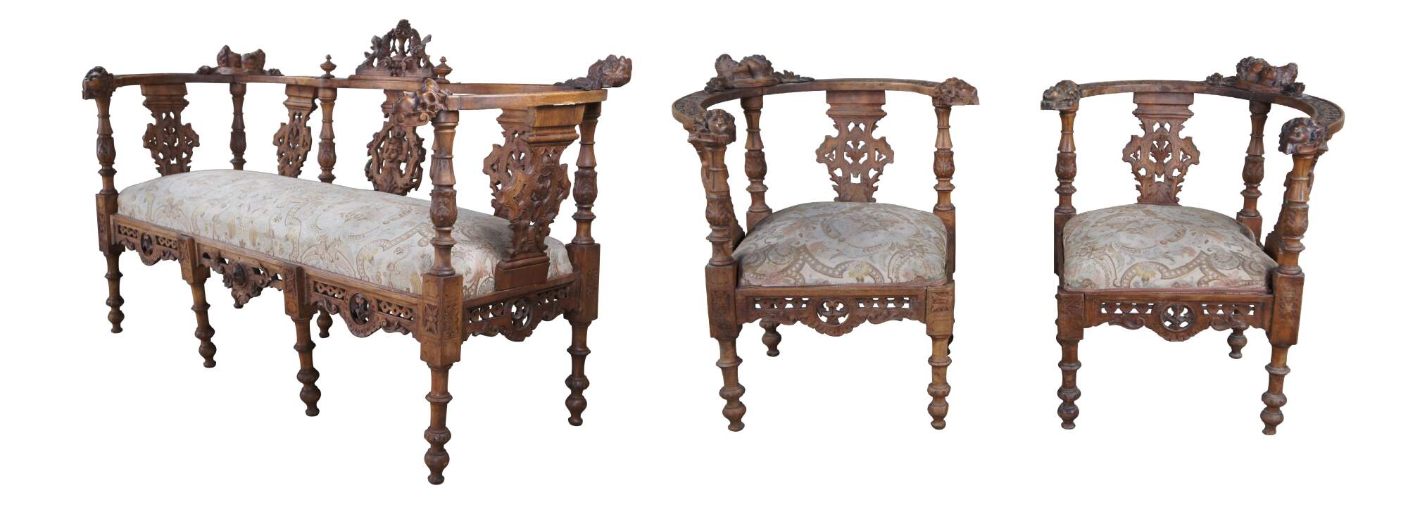 Set of 7 pieces of antique Italian Neo-Renaissance furniture, circa 1870s, including 2 side chairs, 2 corner chairs, 2 arm chairs, and a parlor settee / loveseat. Made of walnut featuring Neoclassical styling with high relief figural carvings of cherubs / puttis, Northwind faces, doves / birds, acanthus / floral and reticulated / pierced accents. The chairs showcase a nice upholstered brocade seat over contoured and reticulated aprons. Legs are turned with arrow feet.