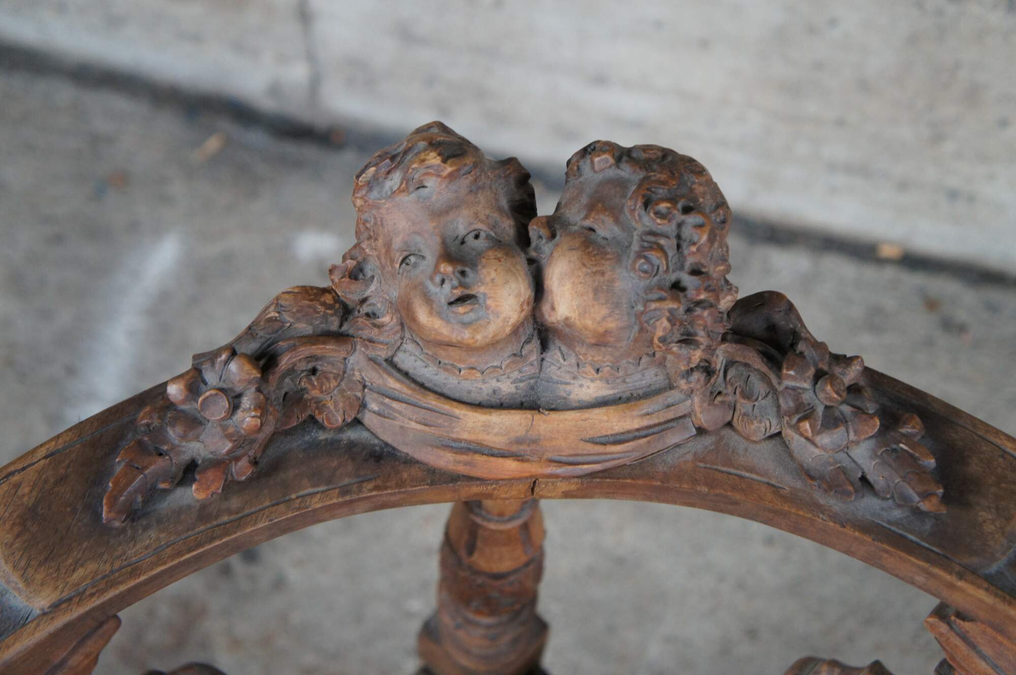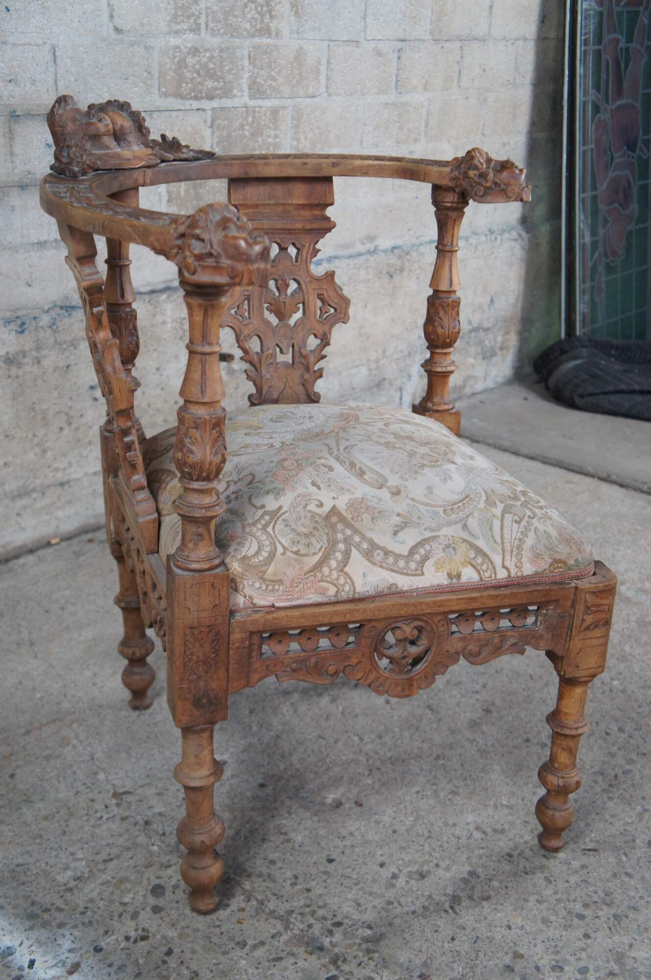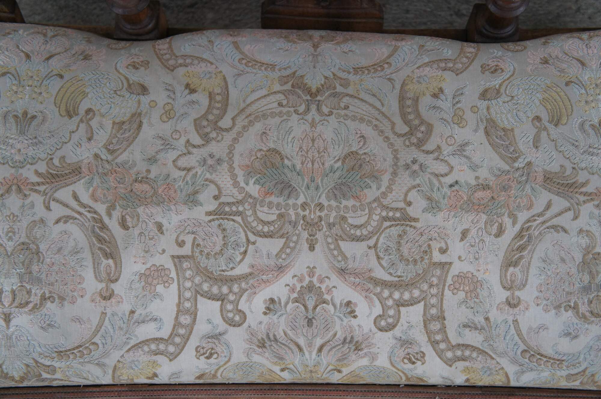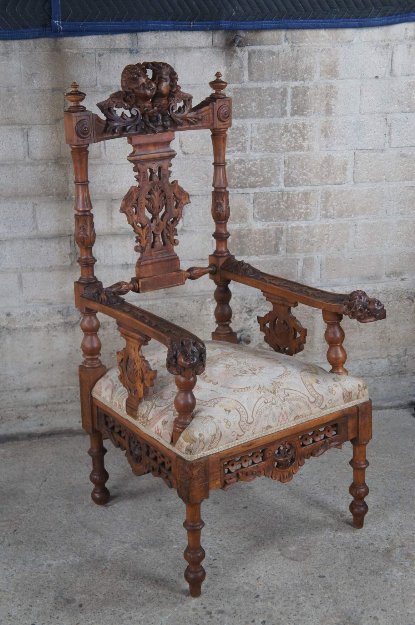 Set of 7 pieces of antique Italian Neo-Renaissance furniture, circa 1870s, including 2 side chairs, 2 corner chairs, 2 arm chairs, and a parlor settee / loveseat. Made of walnut featuring Neoclassical styling with high relief figural carvings of cherubs / puttis, Northwind faces, doves / birds, acanthus / floral and reticulated / pierced accents. The chairs showcase a nice upholstered brocade seat over contoured and reticulated aprons. Legs are turned with arrow feet.
