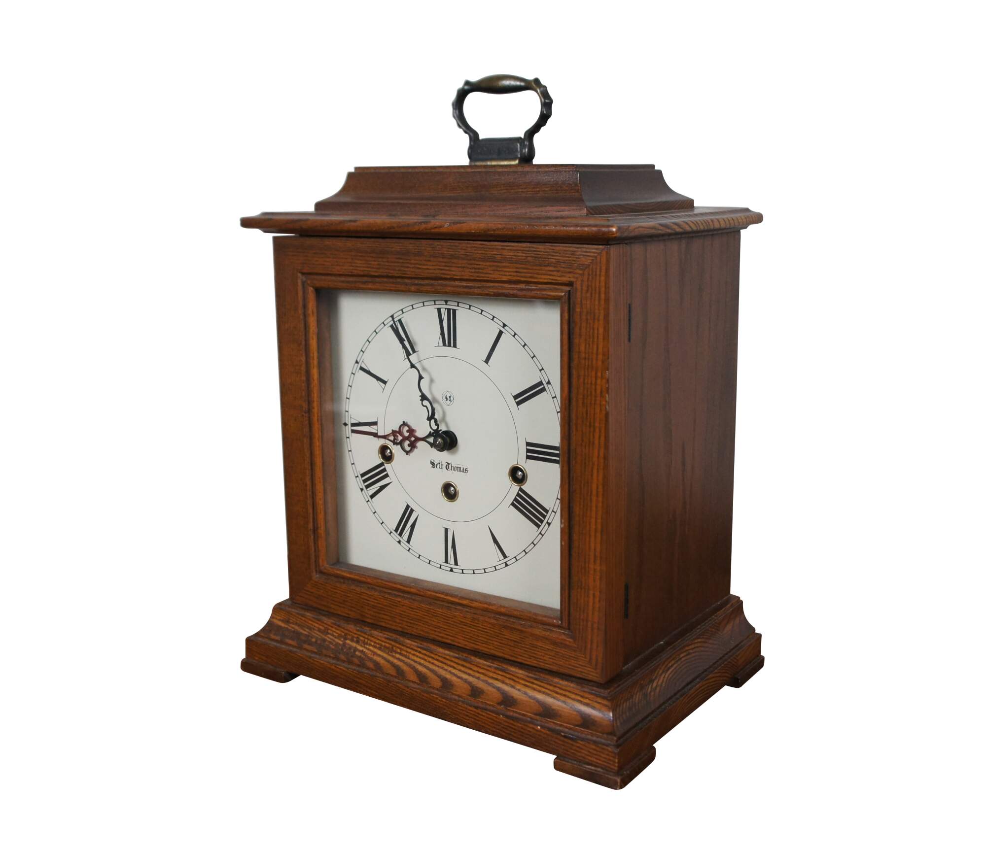 Vintage 1976 Seth Thomas Heirlooms of Tomorrow collection 8-day, key wound, mantel clock with Westminster chimes. Rectangular hardwood case with brass handle at the top. White face with black Roman numerals and scrollwork hands. Cat #: 1308 - Name: Document - Model: 1308-000. Movement made in Germany - A403-001 - Two Jewels - 7606. Includes original tag/instructions and key.