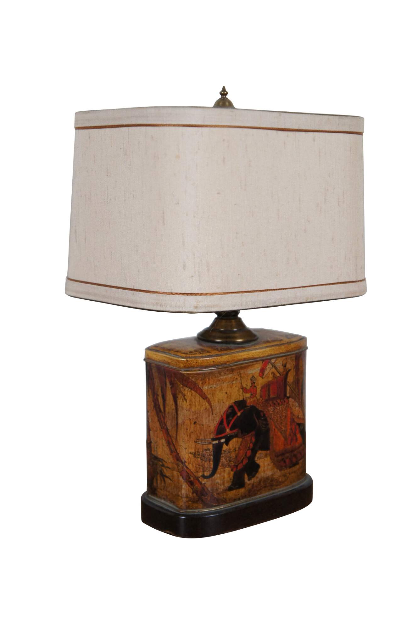 Late 20th century Frederick Cooper Wildwood table lamp featuring a wooden base, rectangular tin tea caddy painted with a British Colonial scene of figures riding a howdah on an Indian elephant, and a fixed L shaped harp. Includes gold trimmed, white linen shade and top shaped brass finial.