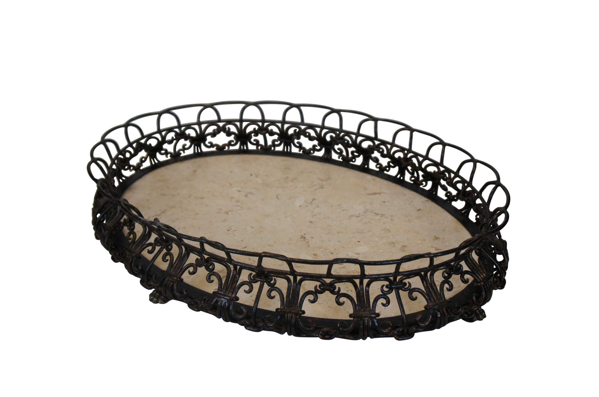 Late 20th century bar serving tray by Maitland Smith - features an oval base of white and beige tavertine marble, surrounded by a flared wrought iron gallery of fleur de lis, standing on four lion's paw feet. Sticker on base. Hand Made in Philippines.