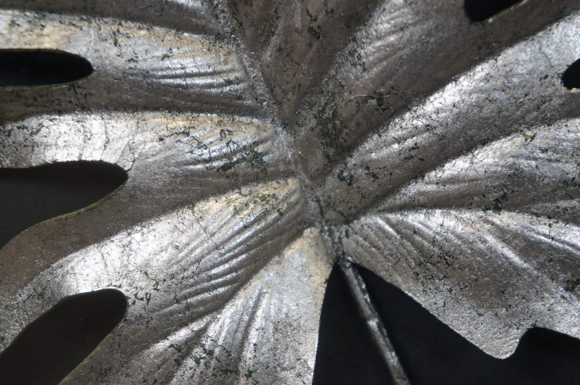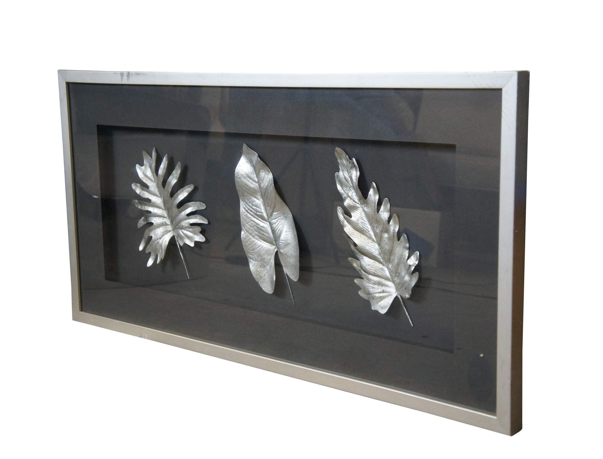 Modern shadowbox wall art by Grace Feyock for Uttermost depicting a trio of silver toned meatl leaves mounted in a black matted shadowbox with a plain brushed silver frame. 10053.