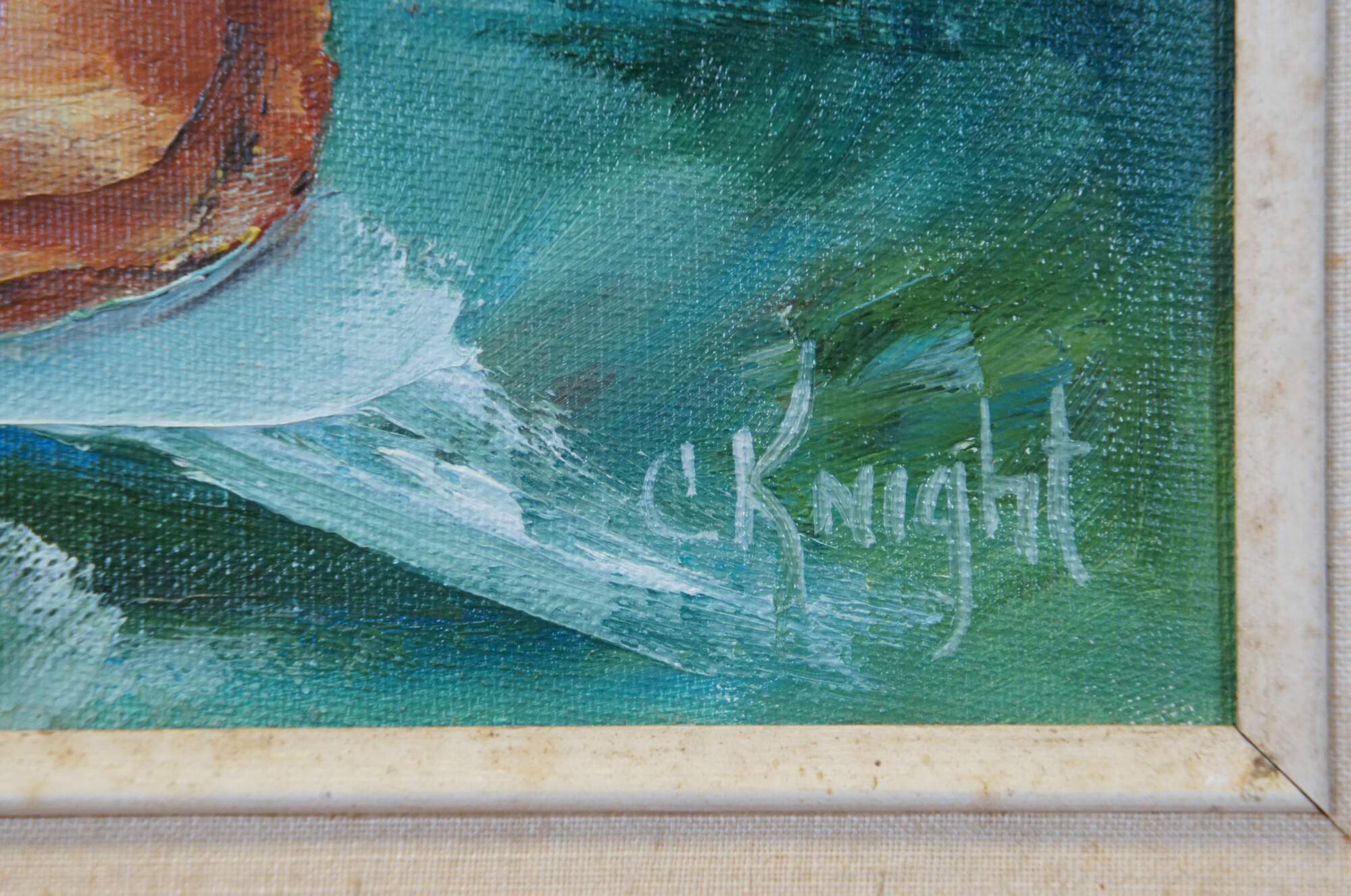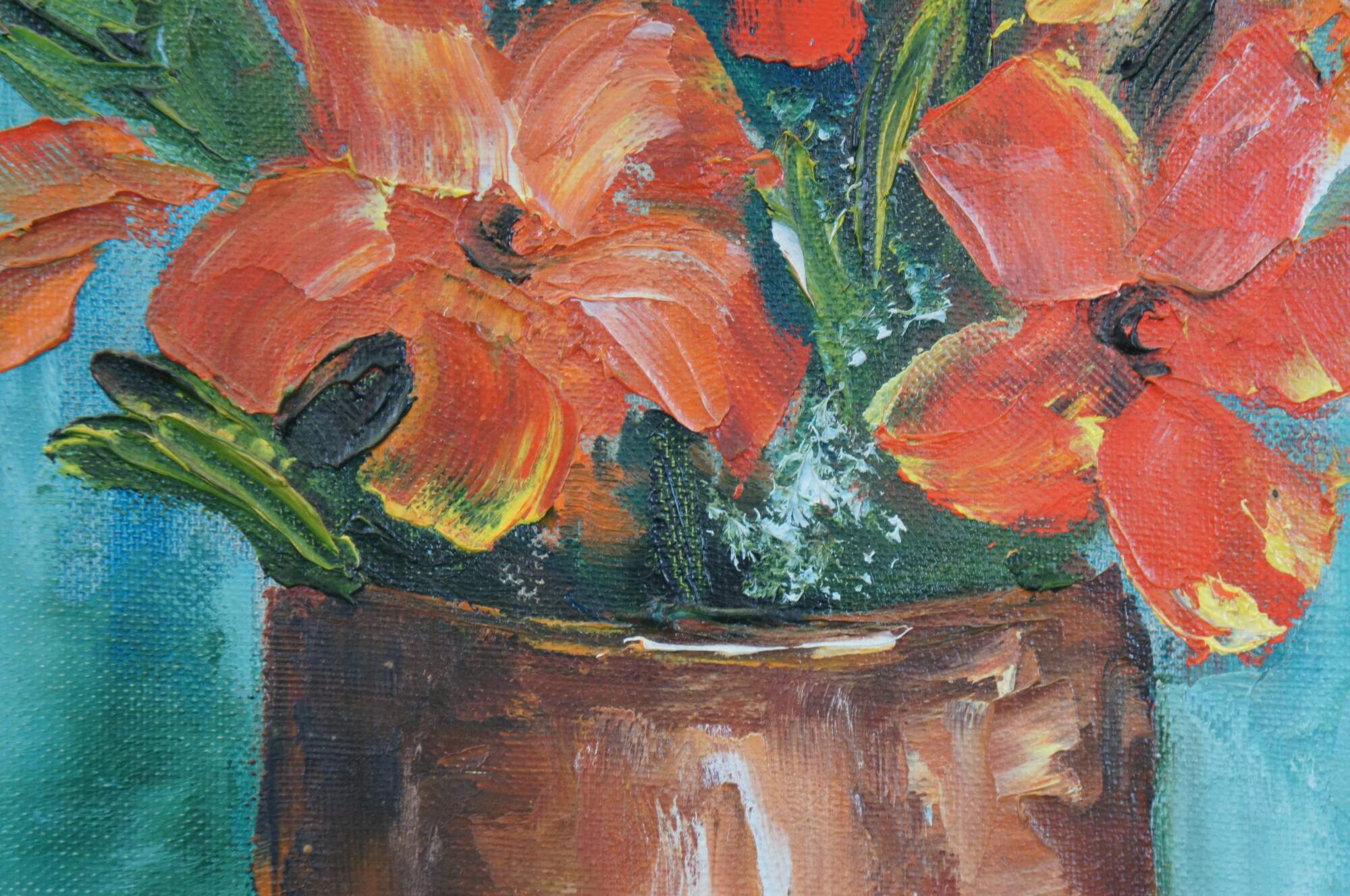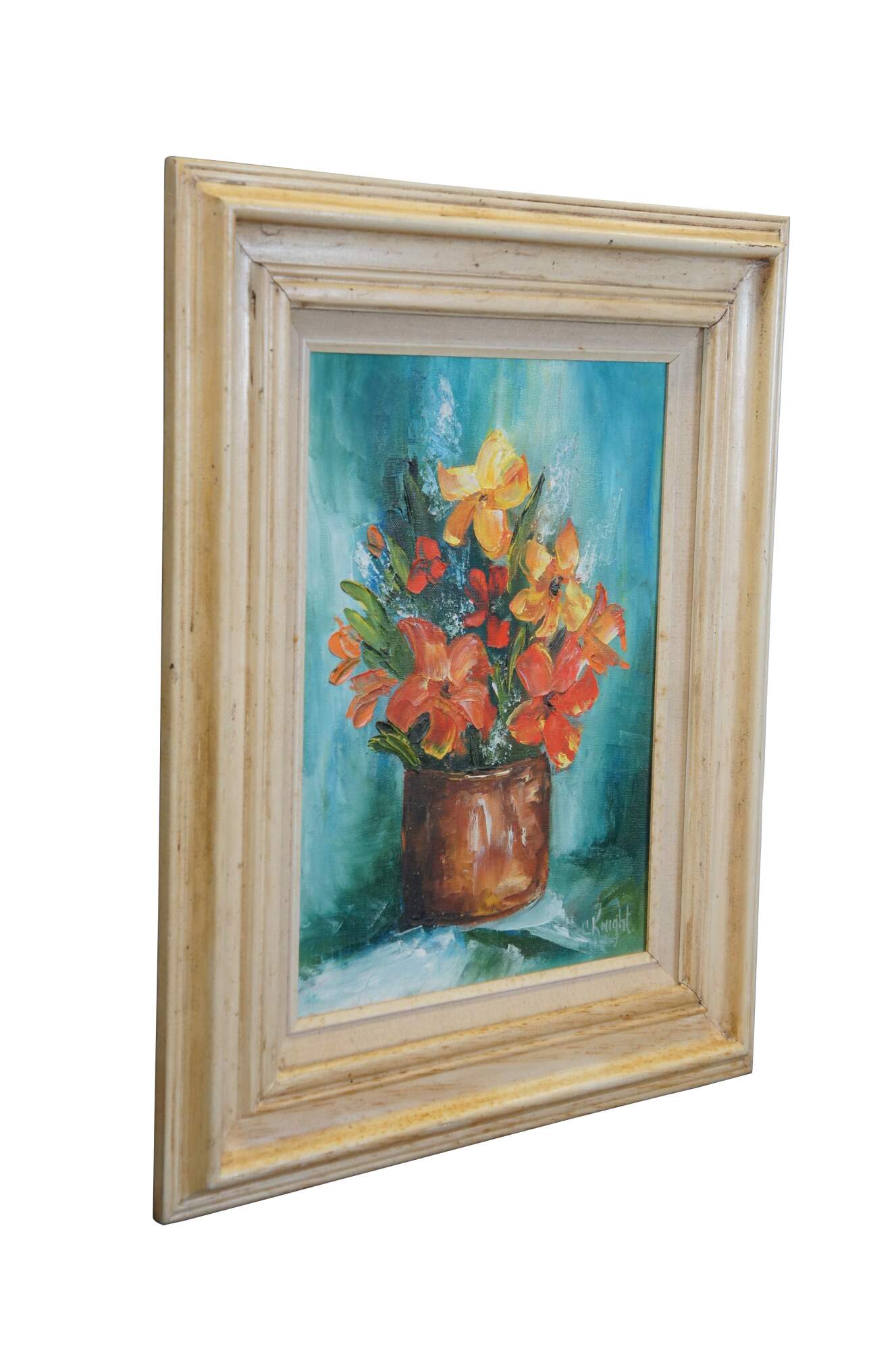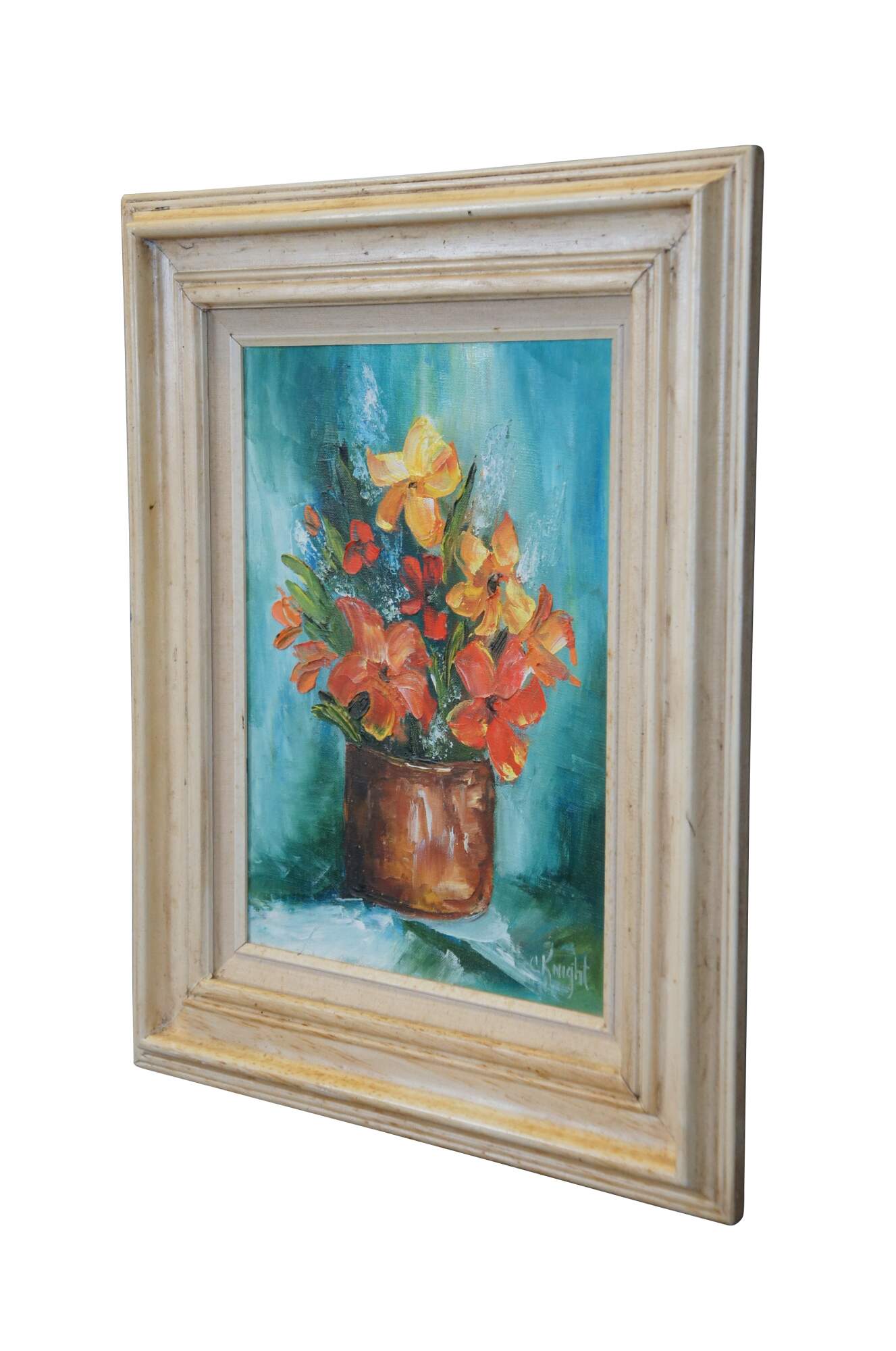 Vintage 20th century oil on canvas board still life painting depicting a small bouquet of orange flowers in a copper pot / vase on a blue background. Signed C. Knight in lower right corner. Beveled pickled oak/off white painted frame with white linen border.
