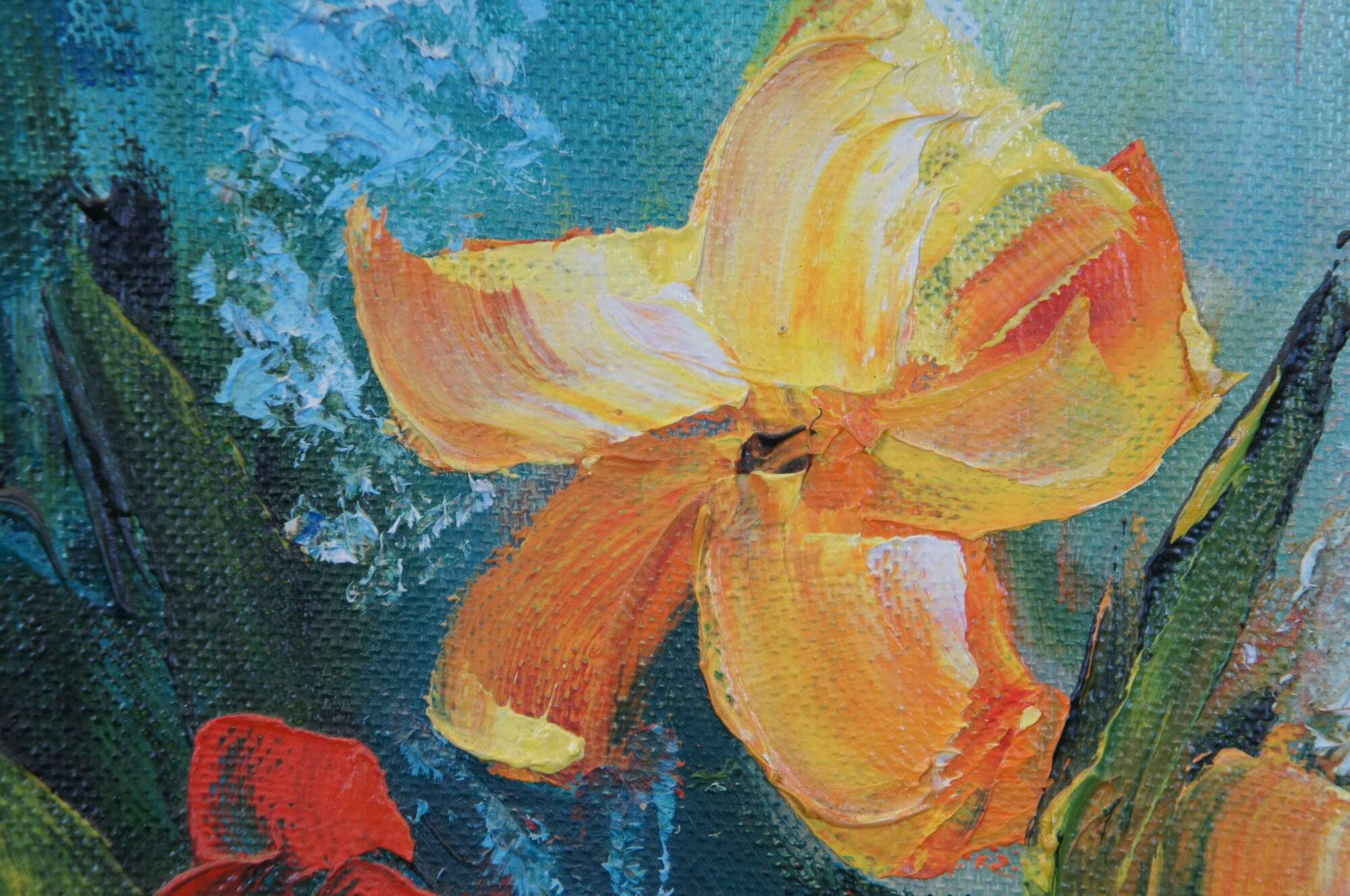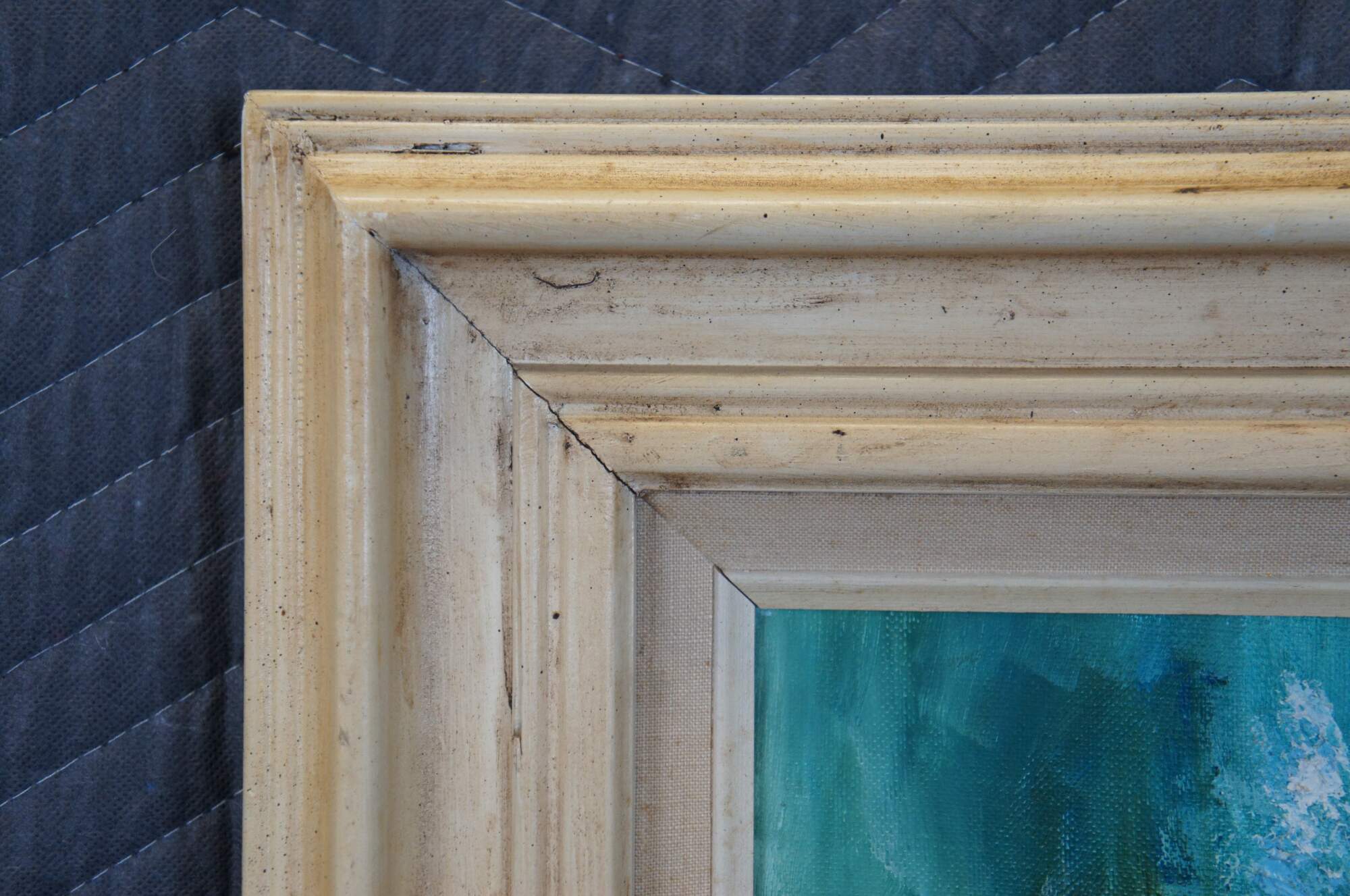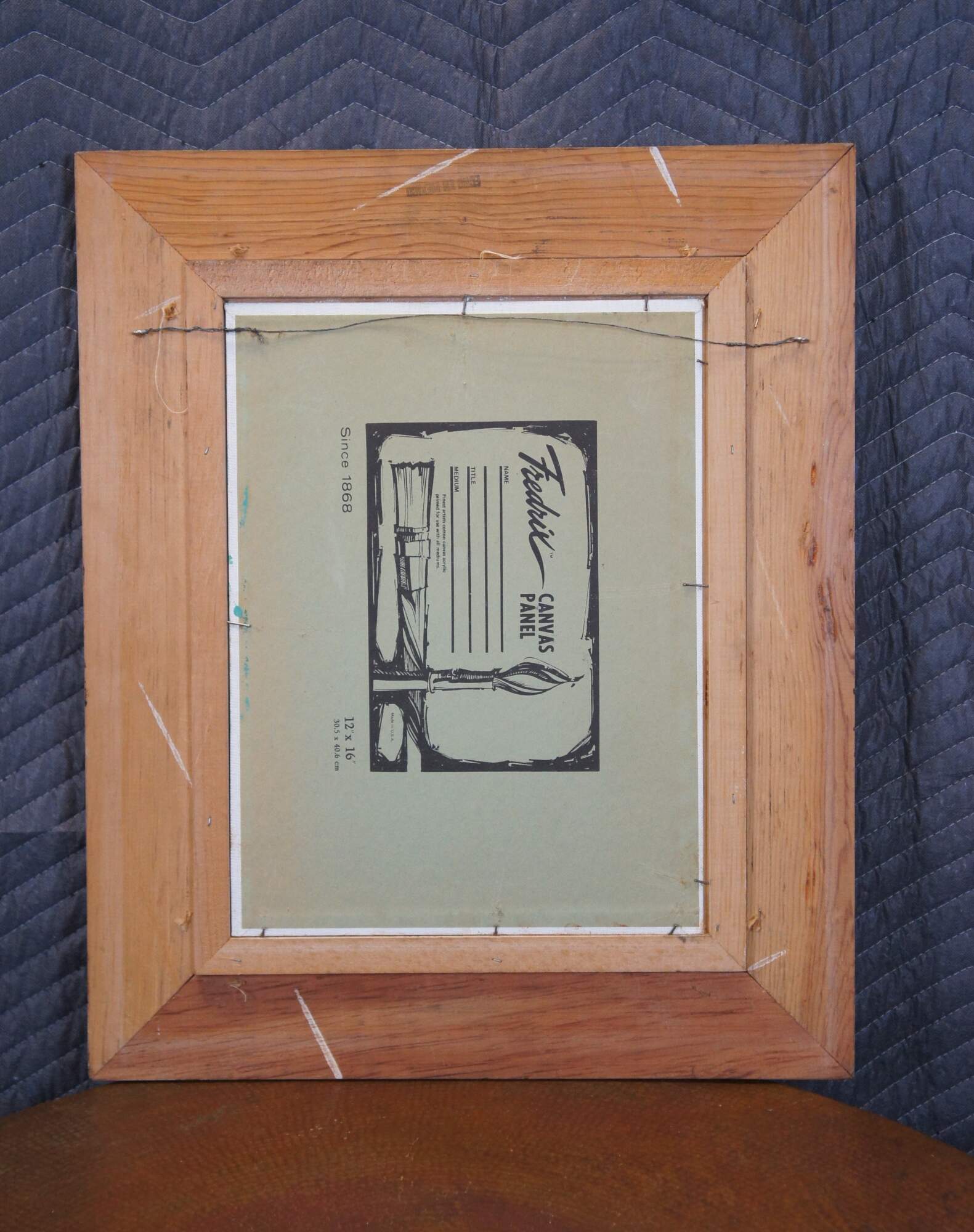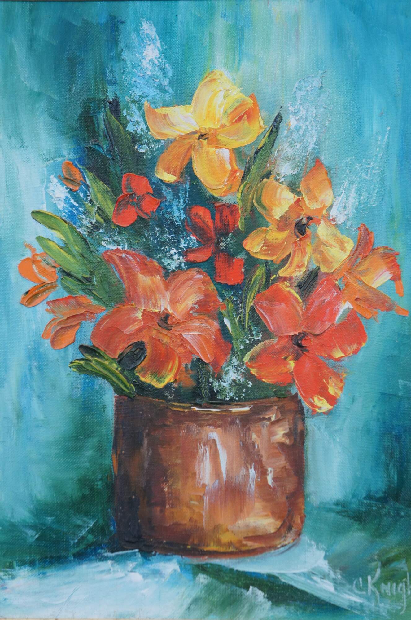 Vintage 20th century oil on canvas board still life painting depicting a small bouquet of orange flowers in a copper pot / vase on a blue background. Signed C. Knight in lower right corner. Beveled pickled oak/off white painted frame with white linen border.