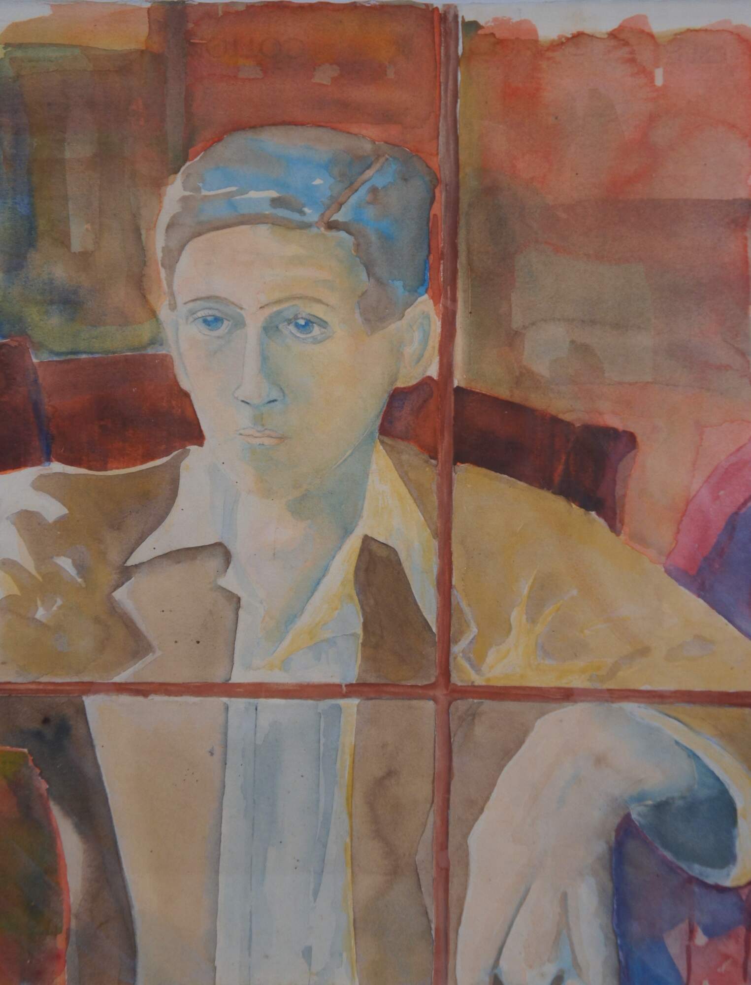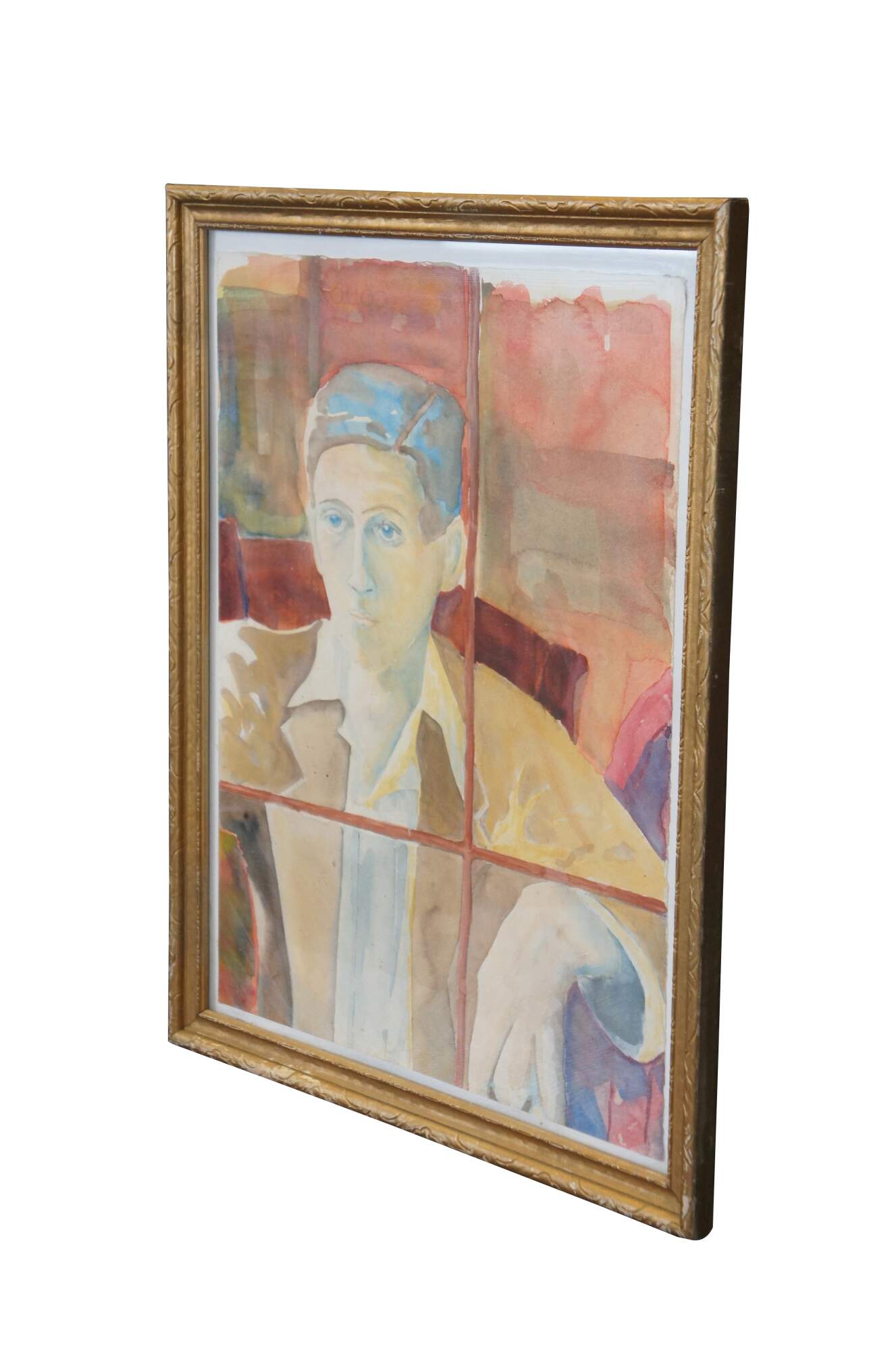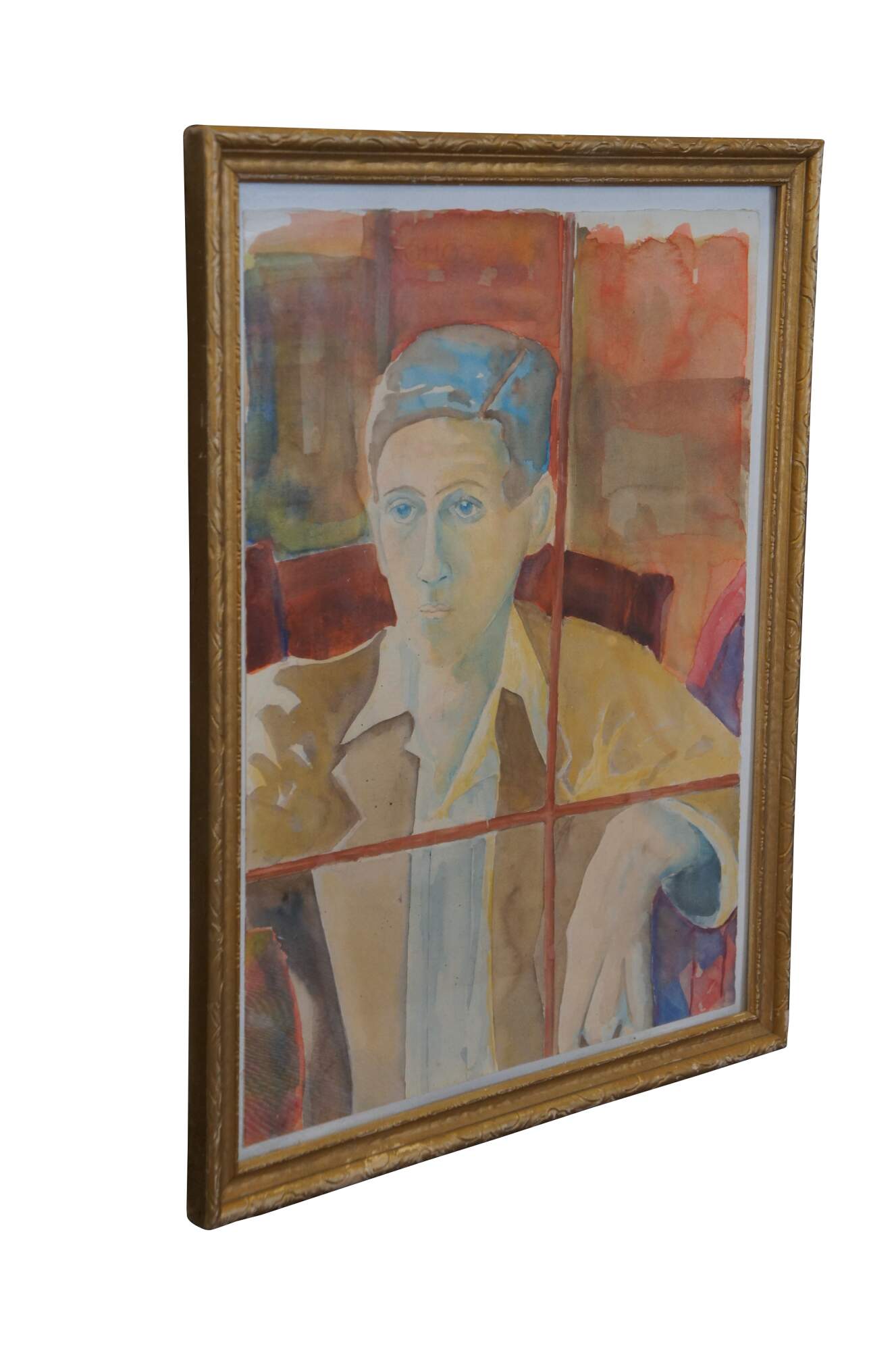Vintage 20th century watercolor on paper portrait painting of a man seated in an armchair behind a window. Beveled giltwood frame with lightly carved edge.