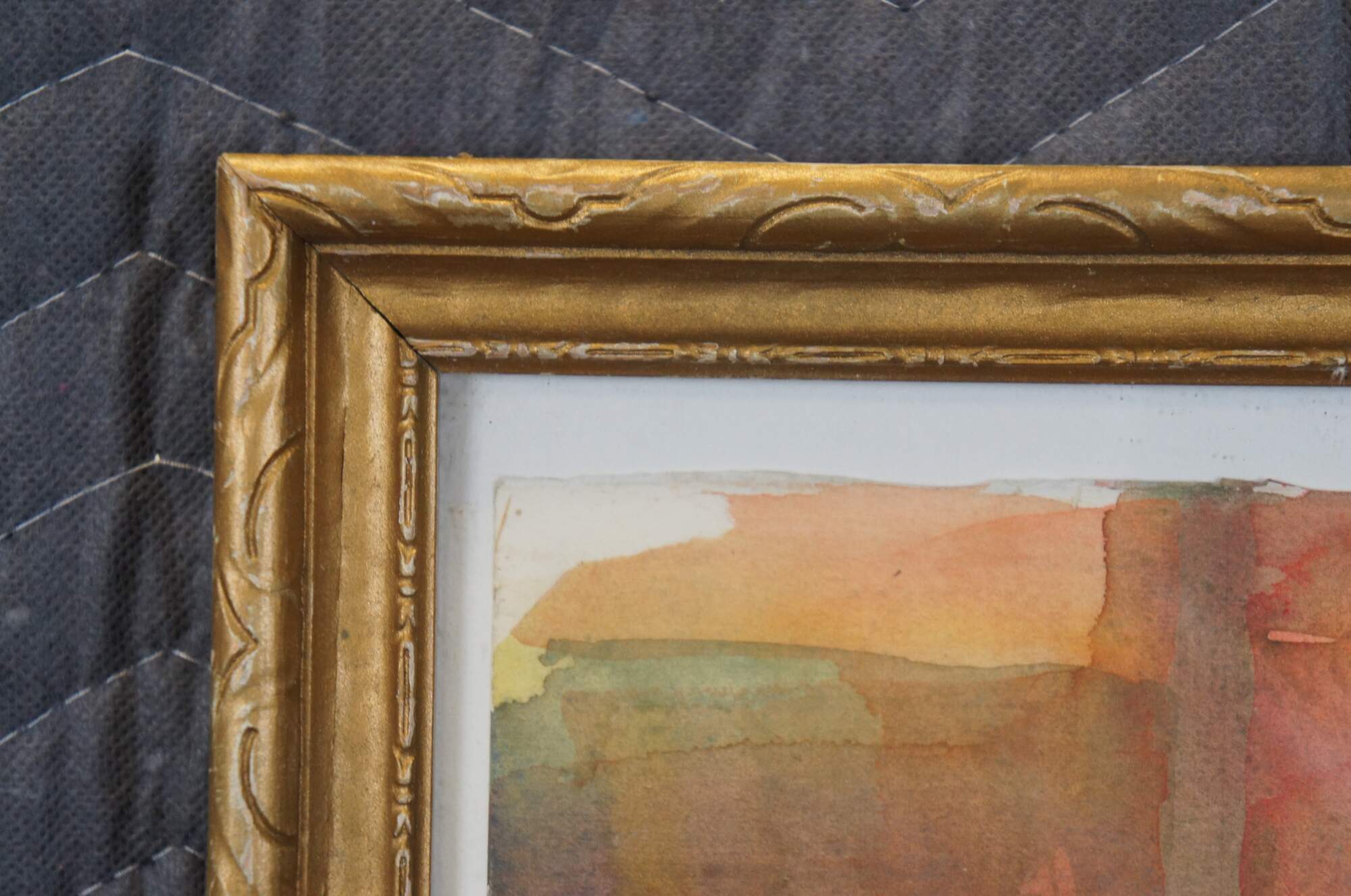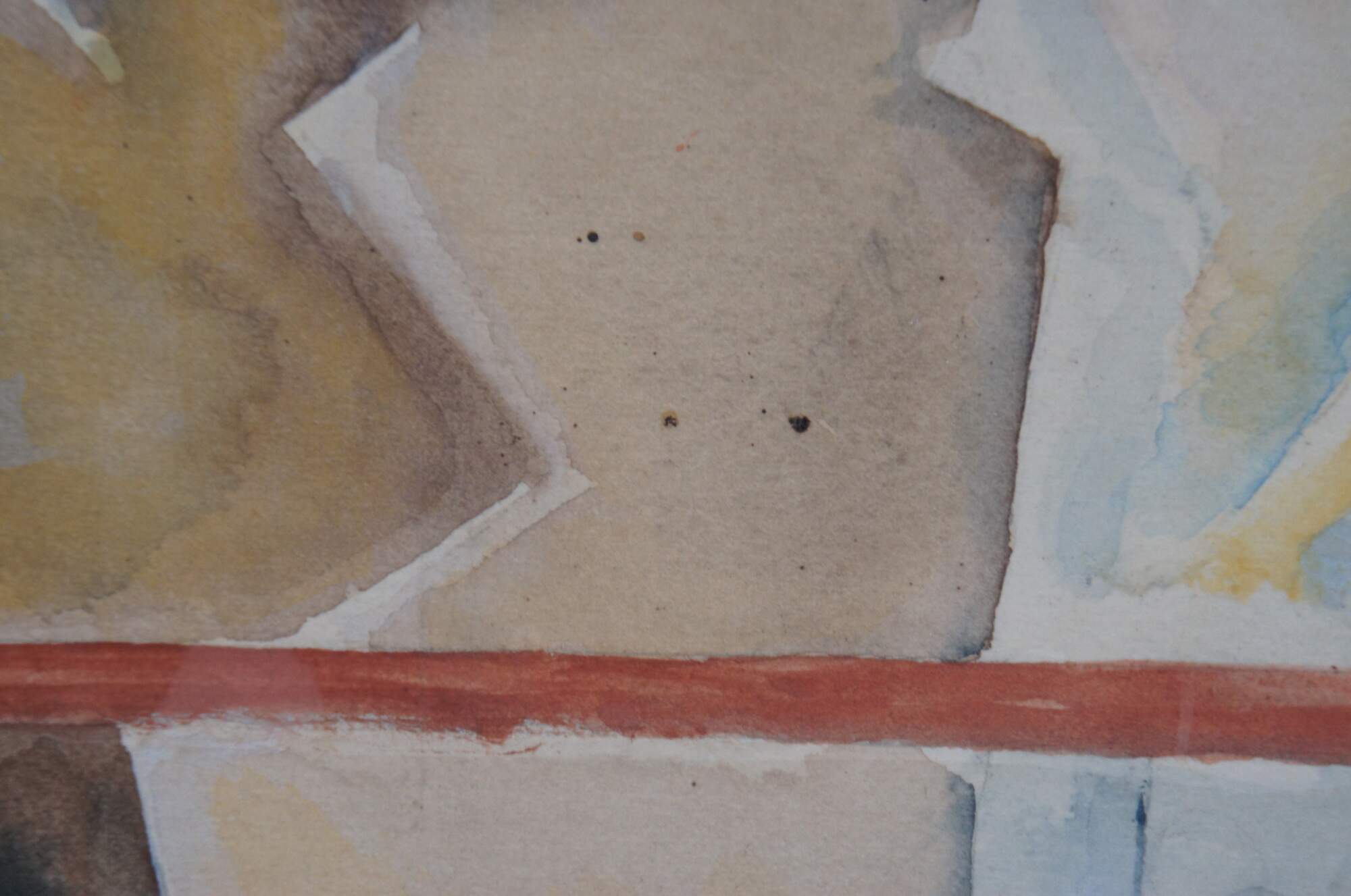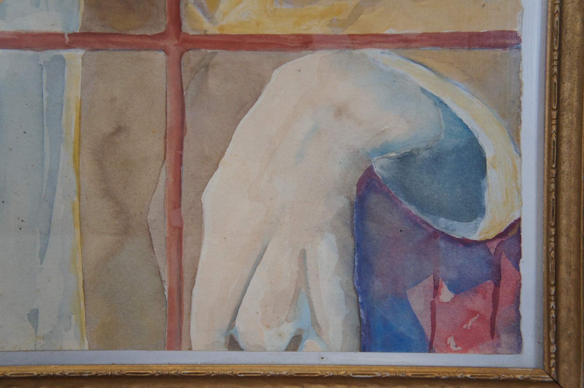 Vintage 20th century watercolor on paper portrait painting of a man seated in an armchair behind a window. Beveled giltwood frame with lightly carved edge.