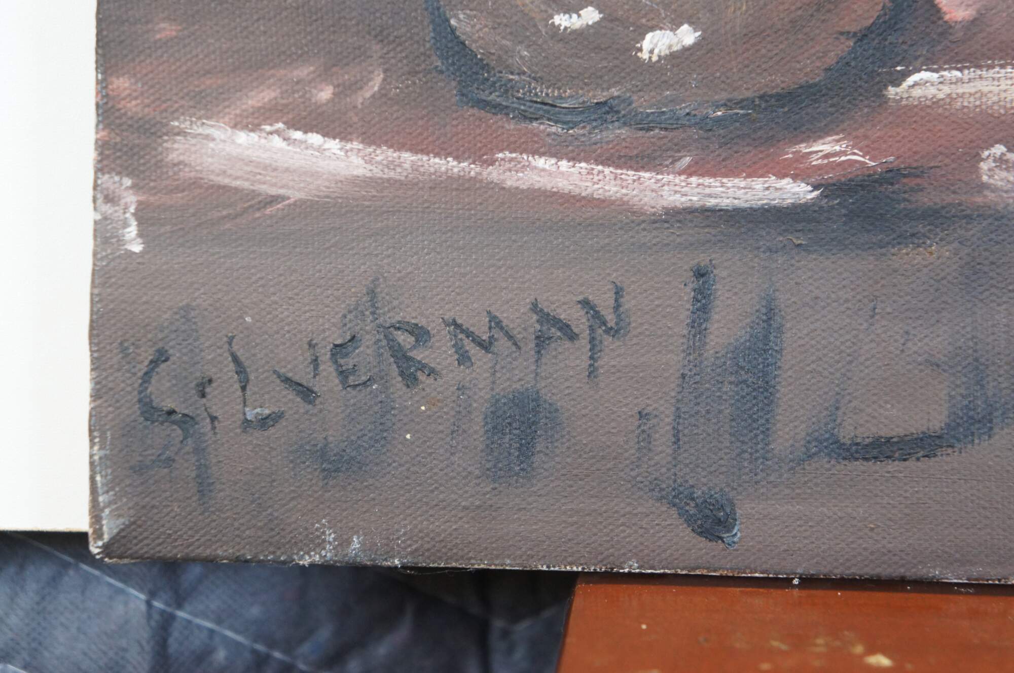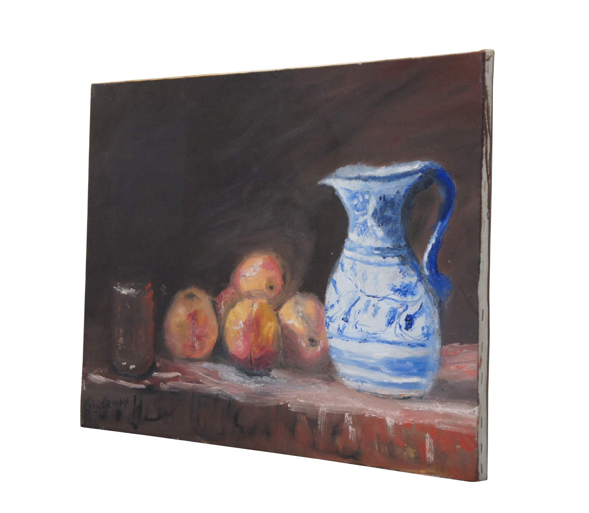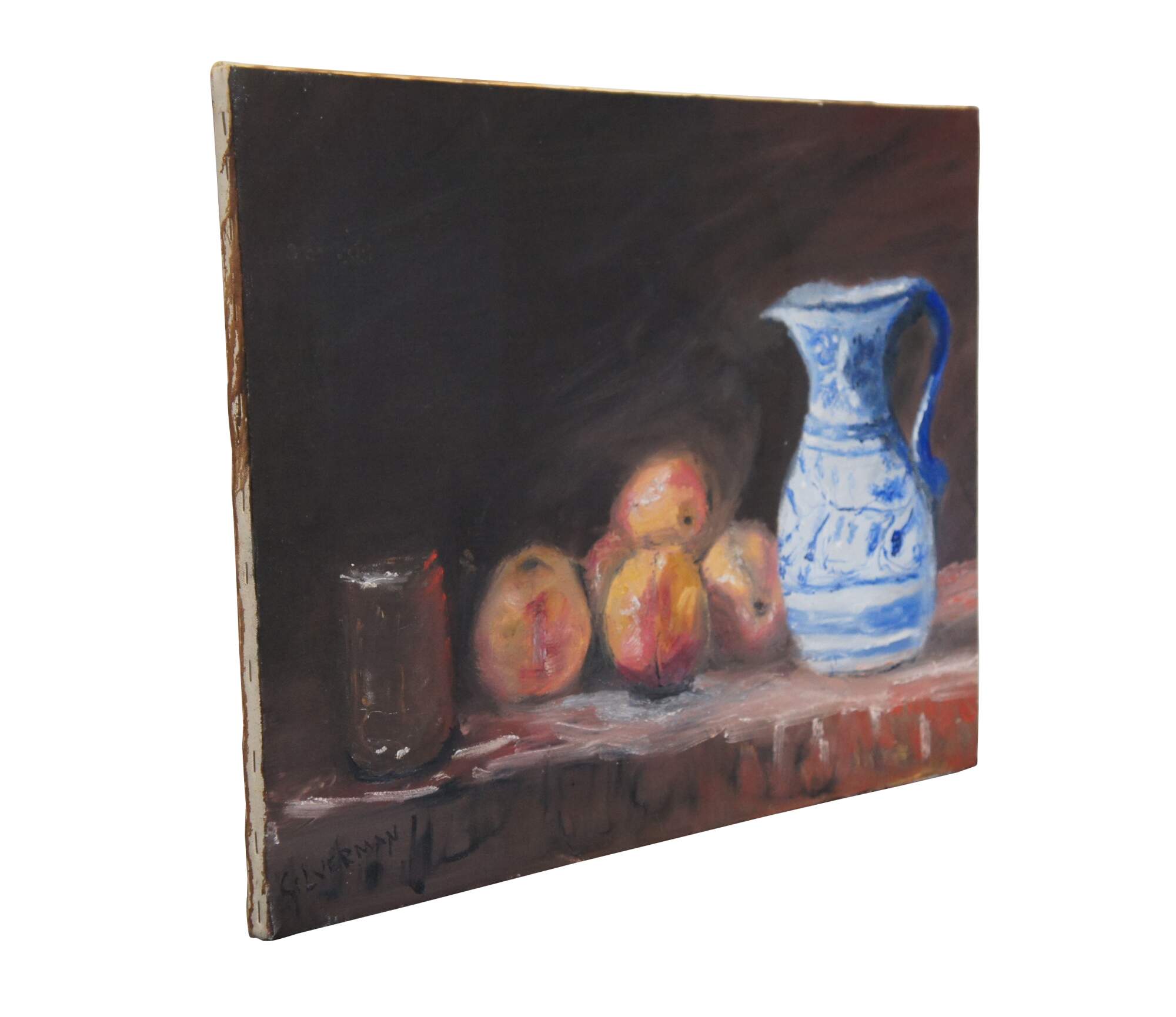 Vintage 20th century still life oil on canvas painting depicting a blue and white porcelain pitcher beside a pile of apples / peaches and a drinking glass. Signed Silverman in lower left corner.