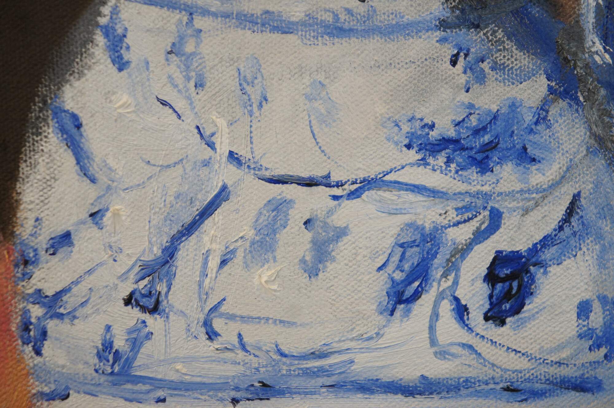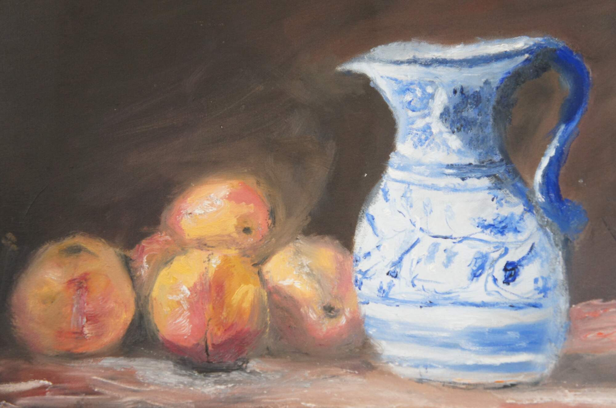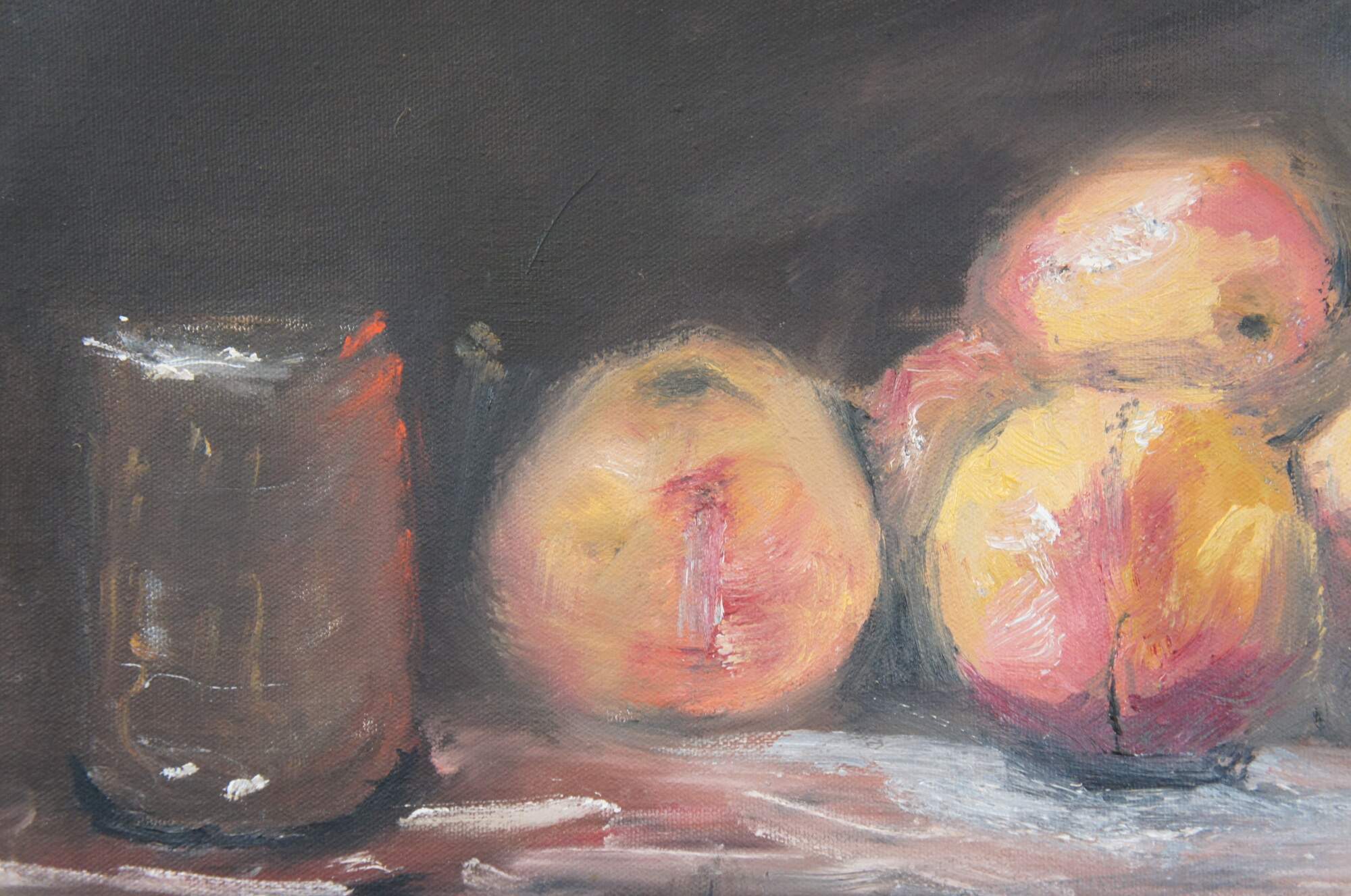 Vintage 20th century still life oil on canvas painting depicting a blue and white porcelain pitcher beside a pile of apples / peaches and a drinking glass. Signed Silverman in lower left corner.