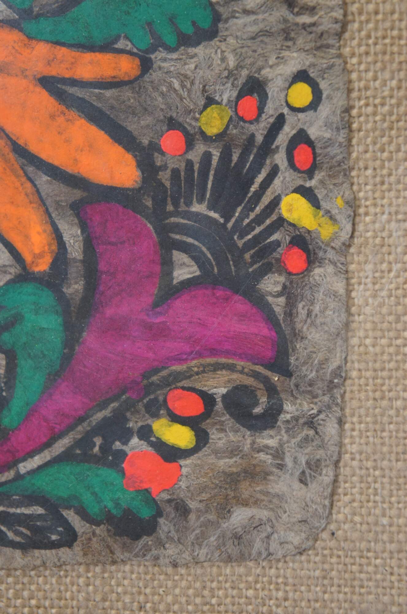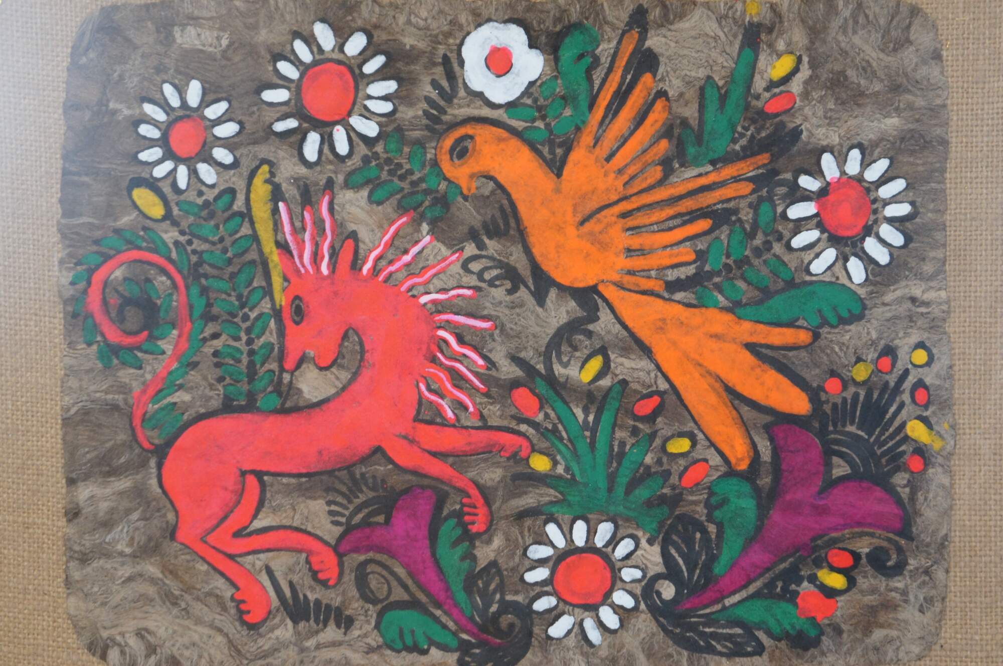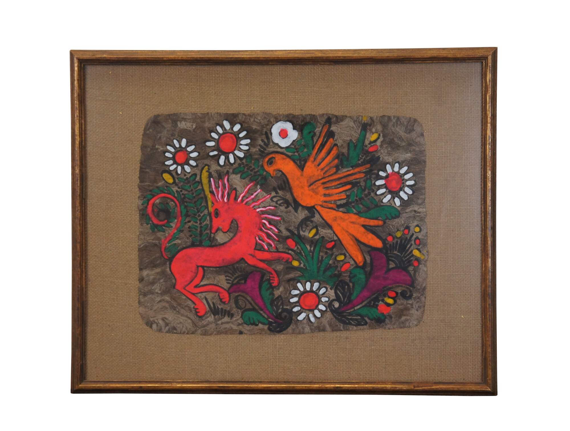 Pair of 1967 brightly colored Mexican folk art paintings on amate bark paper / parchment, depicting a variety of flowers and animals / birds / unicorn. Raised bevel giltwood frame; burlap mat. Dated on back of frame.
