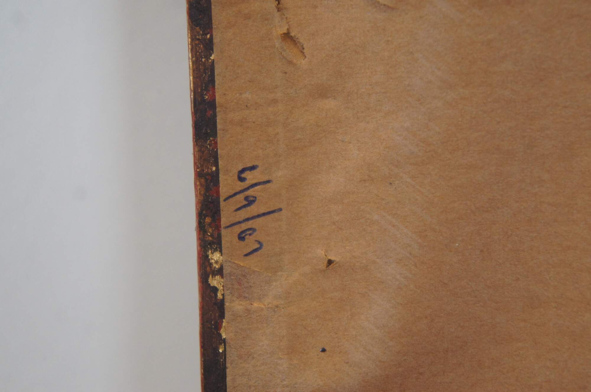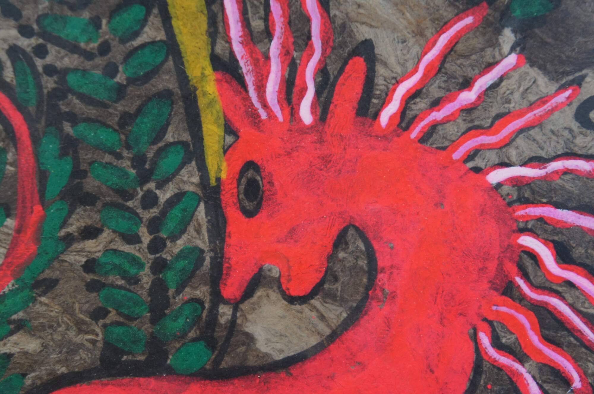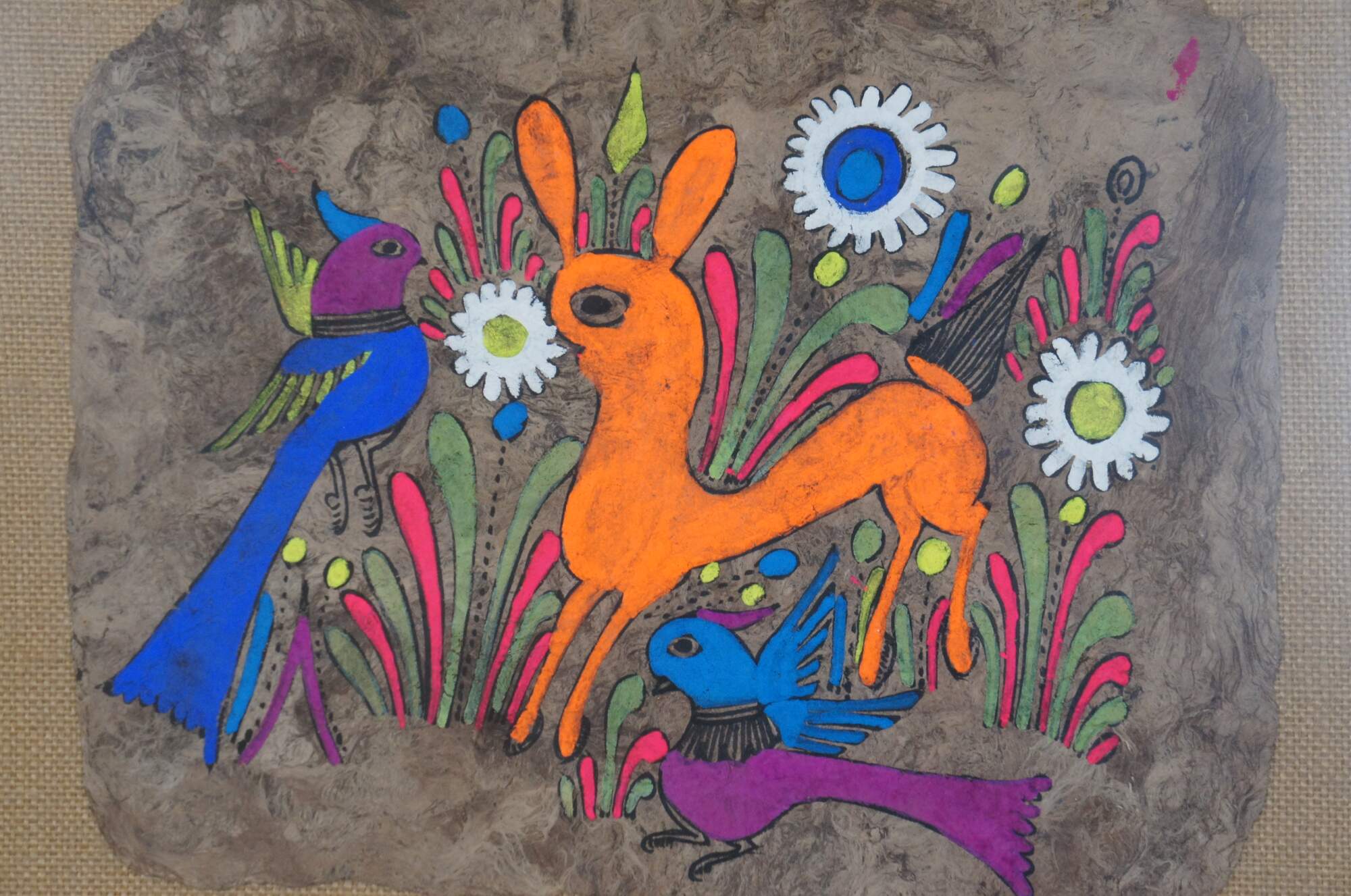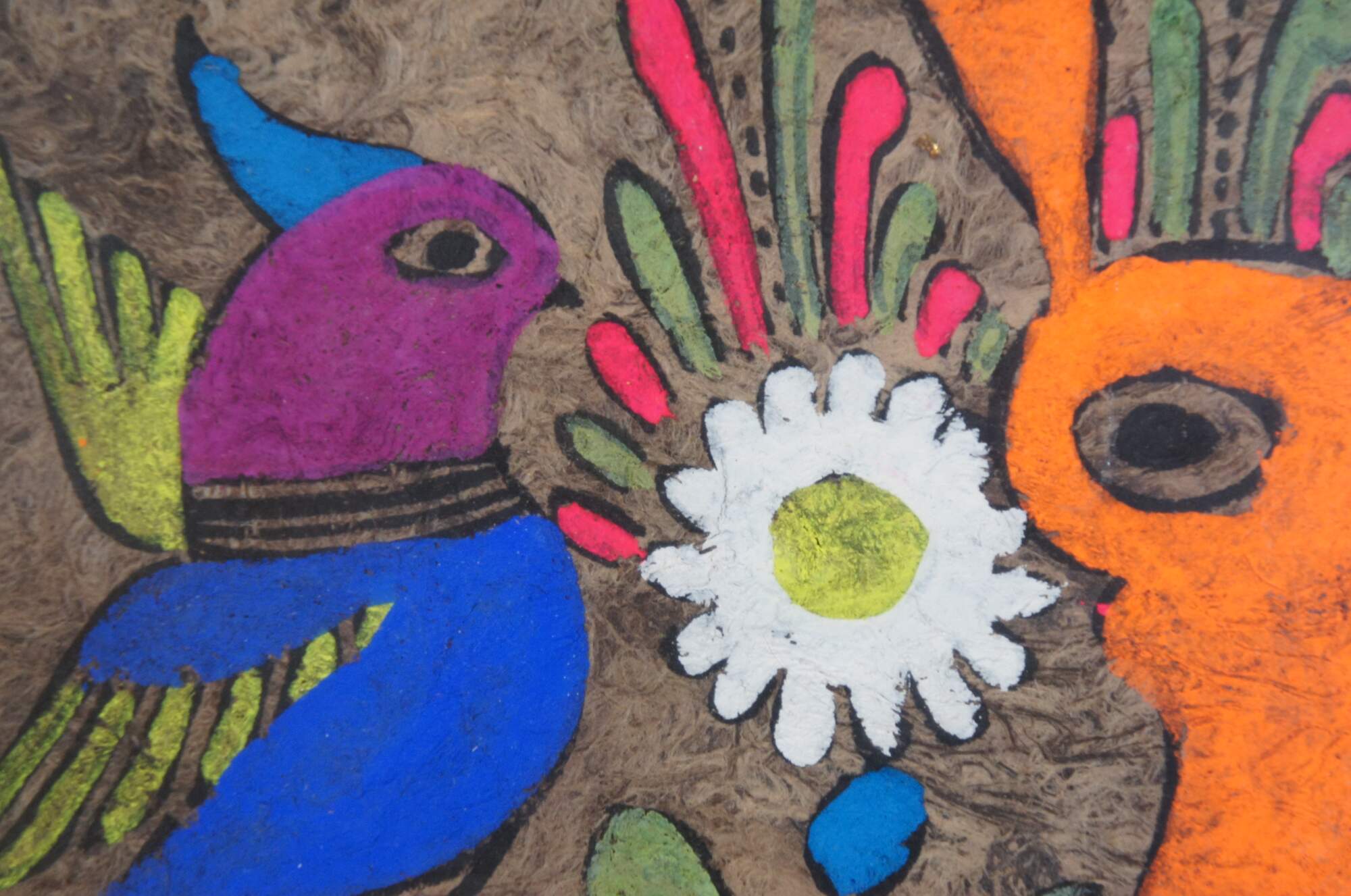 Pair of 1967 brightly colored Mexican folk art paintings on amate bark paper / parchment, depicting a variety of flowers and animals / birds / unicorn. Raised bevel giltwood frame; burlap mat. Dated on back of frame.