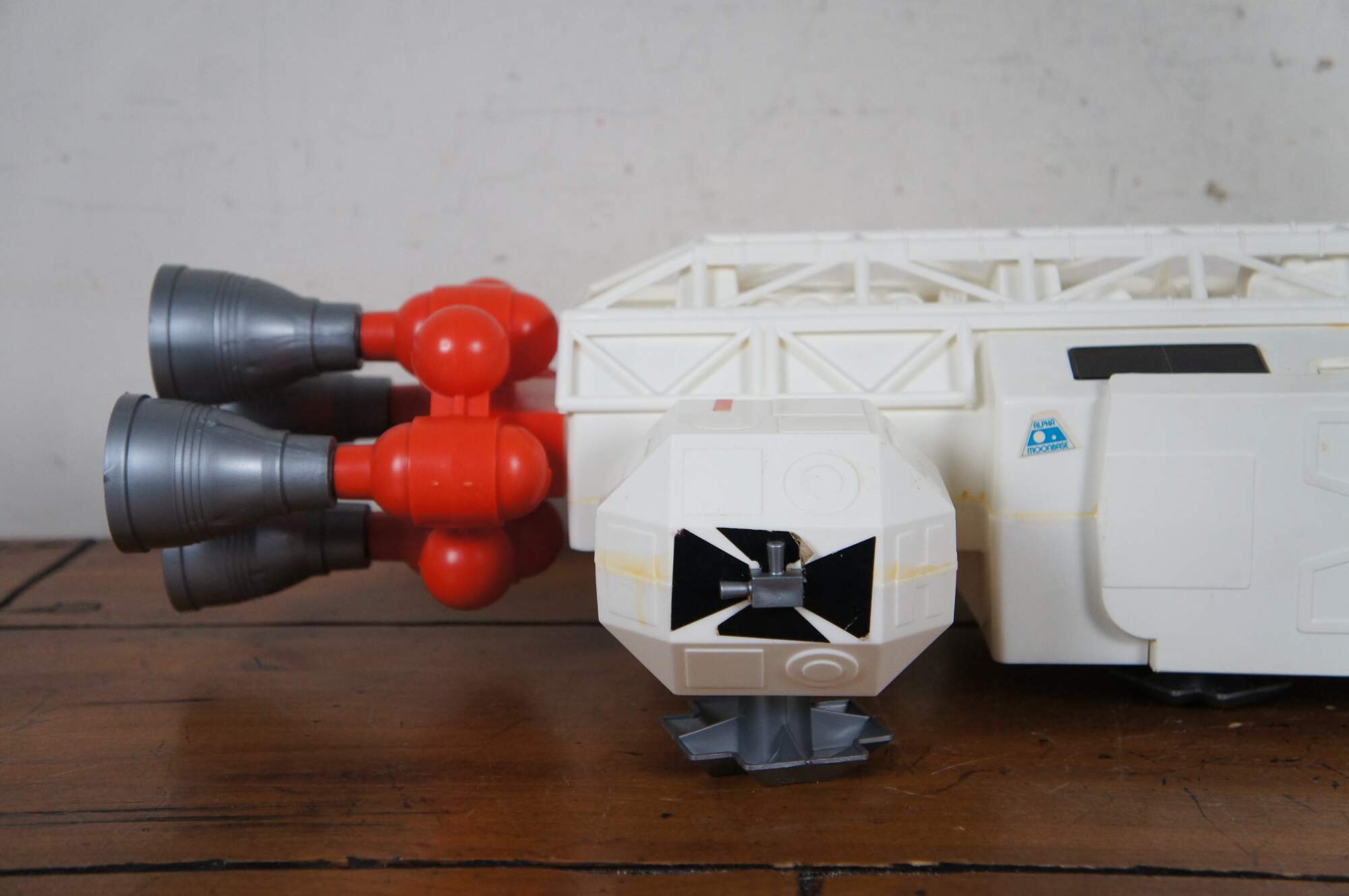 Vintage 1976 Space: 1999 Eagle 1 Spaceship with three figures (one missing helmet) and one gun accessory. Interior features crane, weapons rack (detached from floor), and two chairs. Manufactured by Mattel Inc. Made in USA. Includes original box and instructions.