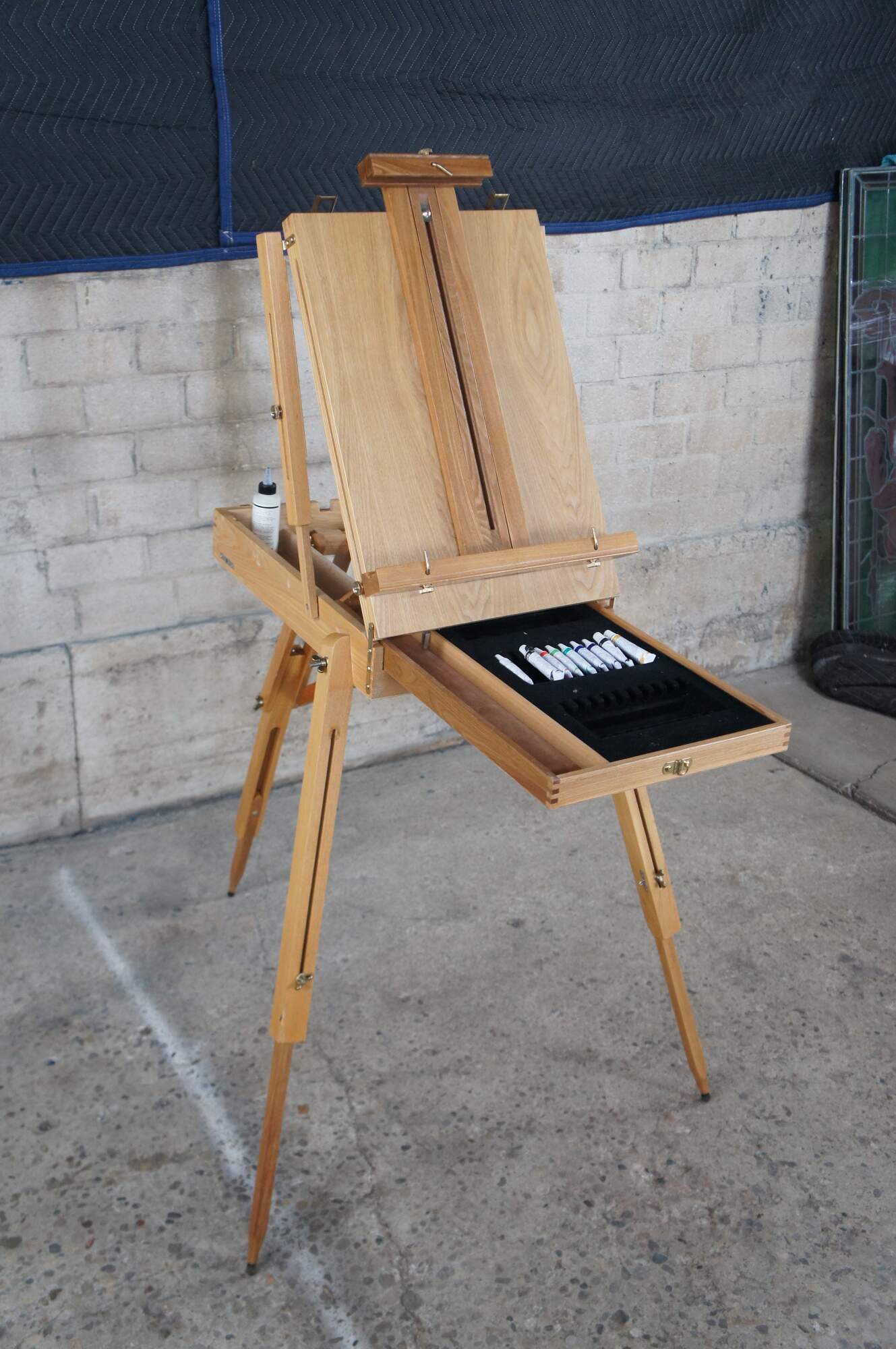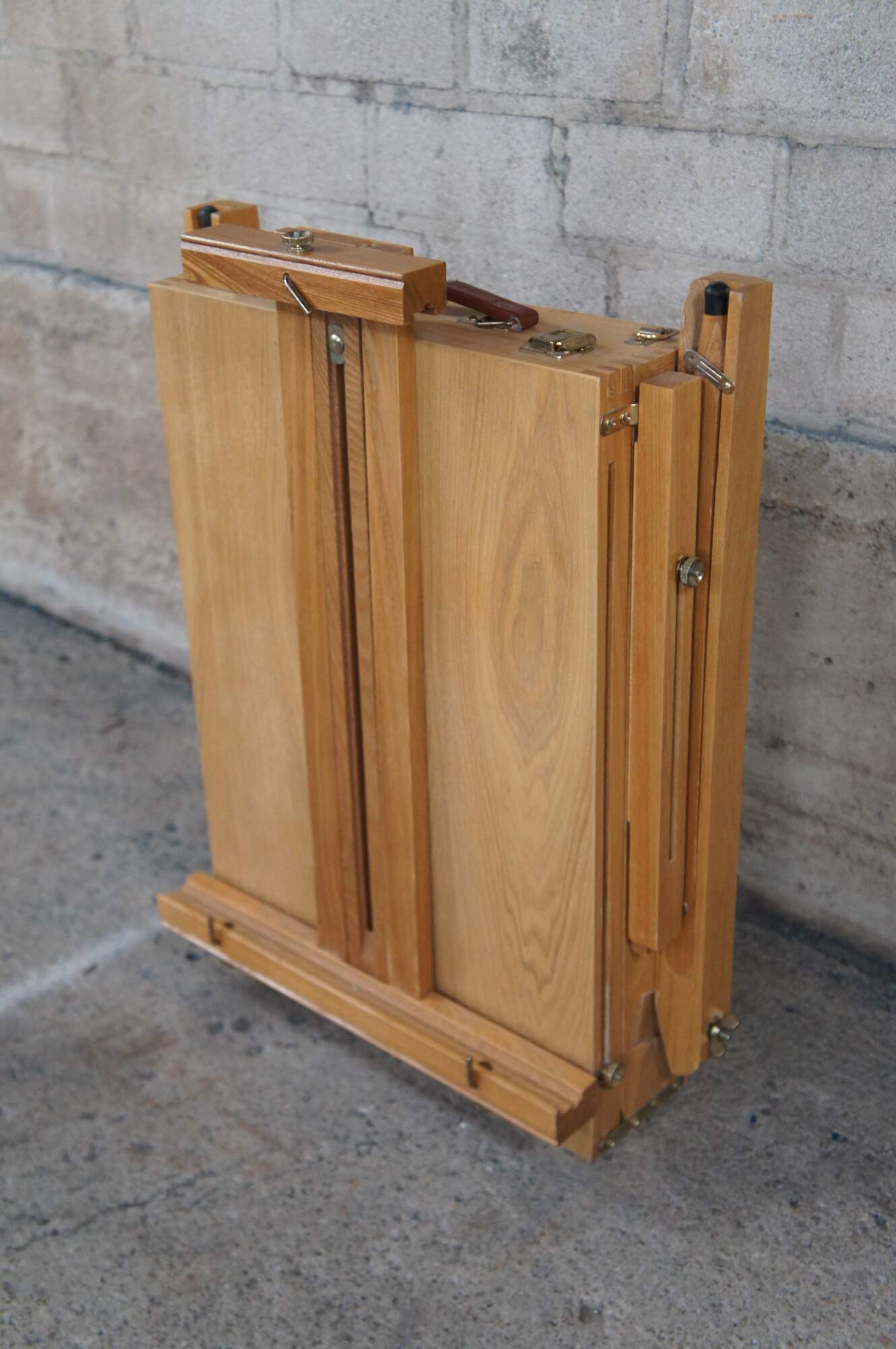 Convertable / Folding artist easel made from Beechwood. Extends from folded position for field use. Includes drawer for supplies.