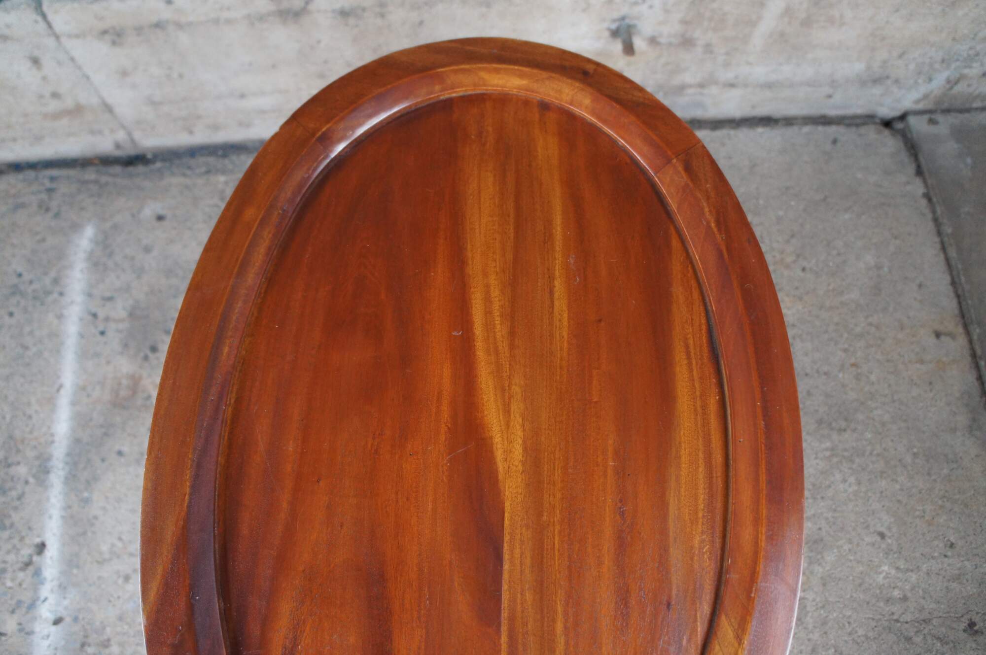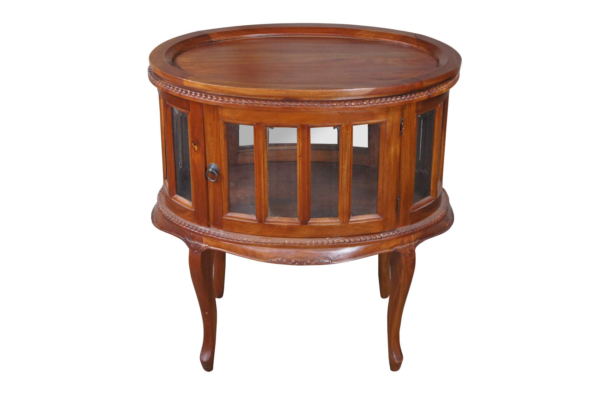 Georgian style Chocolate / Tea table or vitrine cabinet, circa last quarter 20th century. Features an oval frame and tray top over a lower two sided showcase with beveled glass. The table can be opened from each side and is accented by beaded aprons, foliate accents and contoured legs.