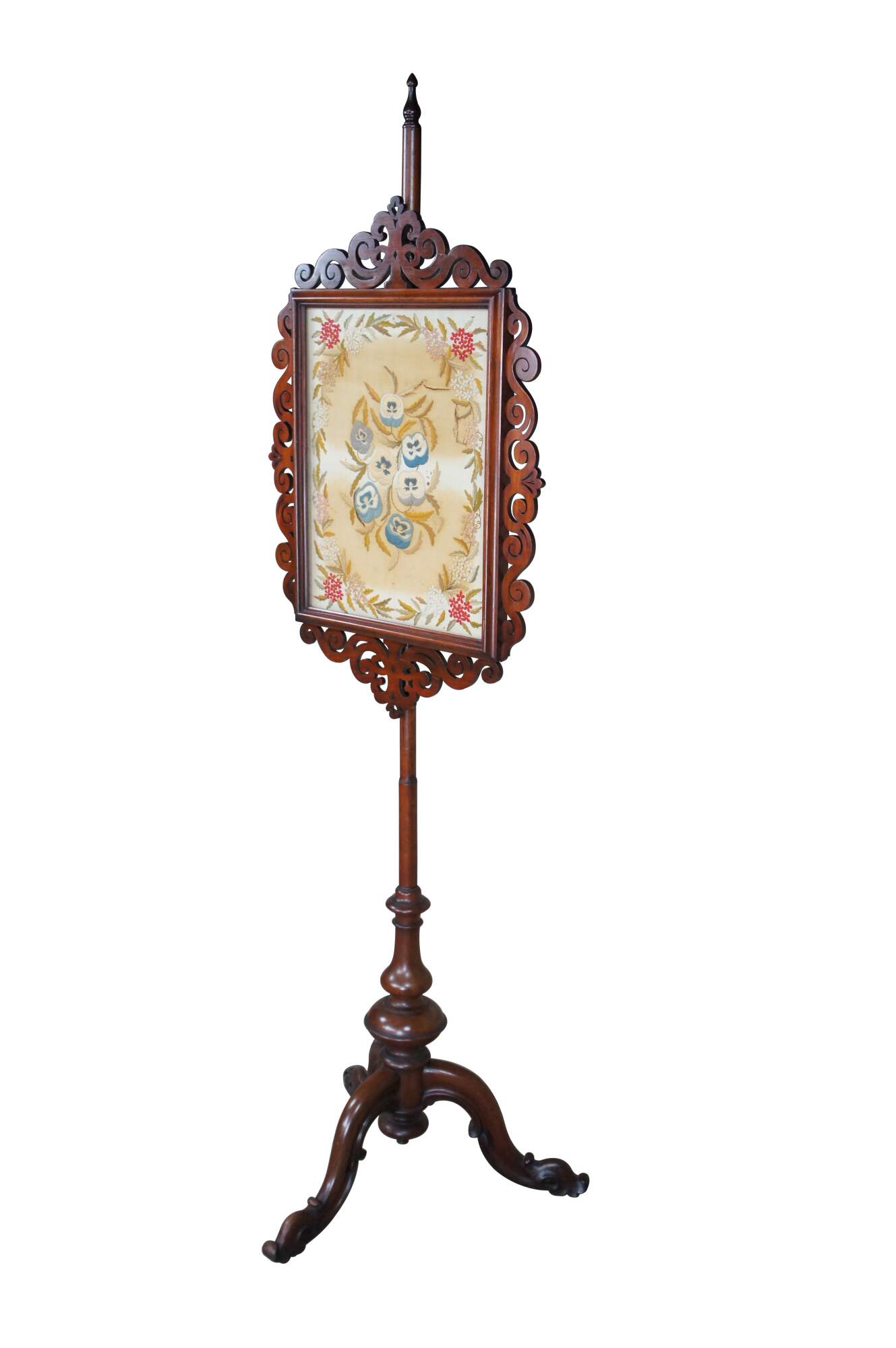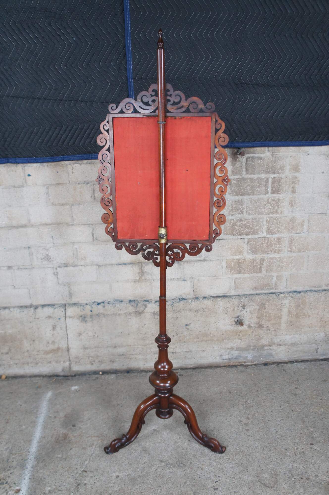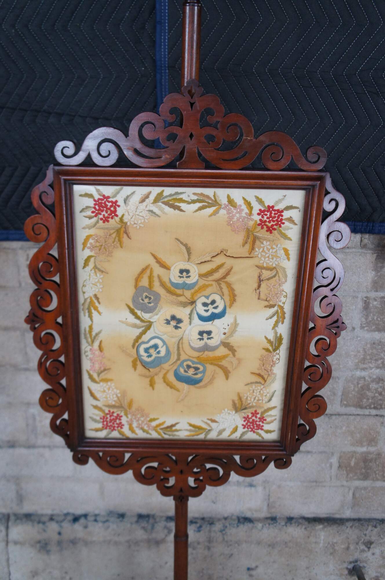 Antique English Regency / Georgian style pole or fire screen on stand. Made of mahogany featuring scrolled pierced / reticulated adjustable screen framing a floral tapestry backed with French fleur de lis. The pole features a tapered design with finial at top and bottom, and a tripod base with downswept legs and acanthus feet.