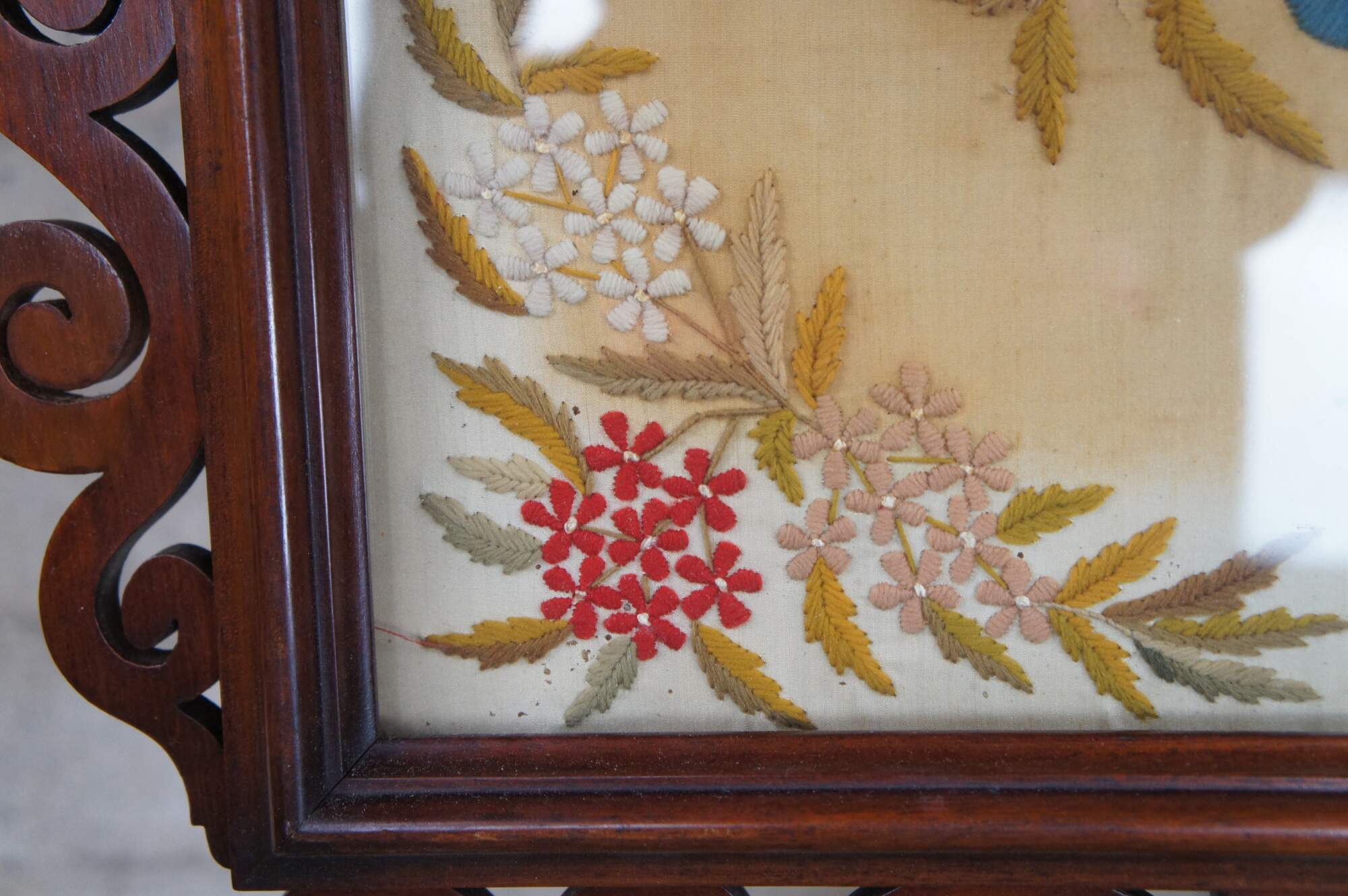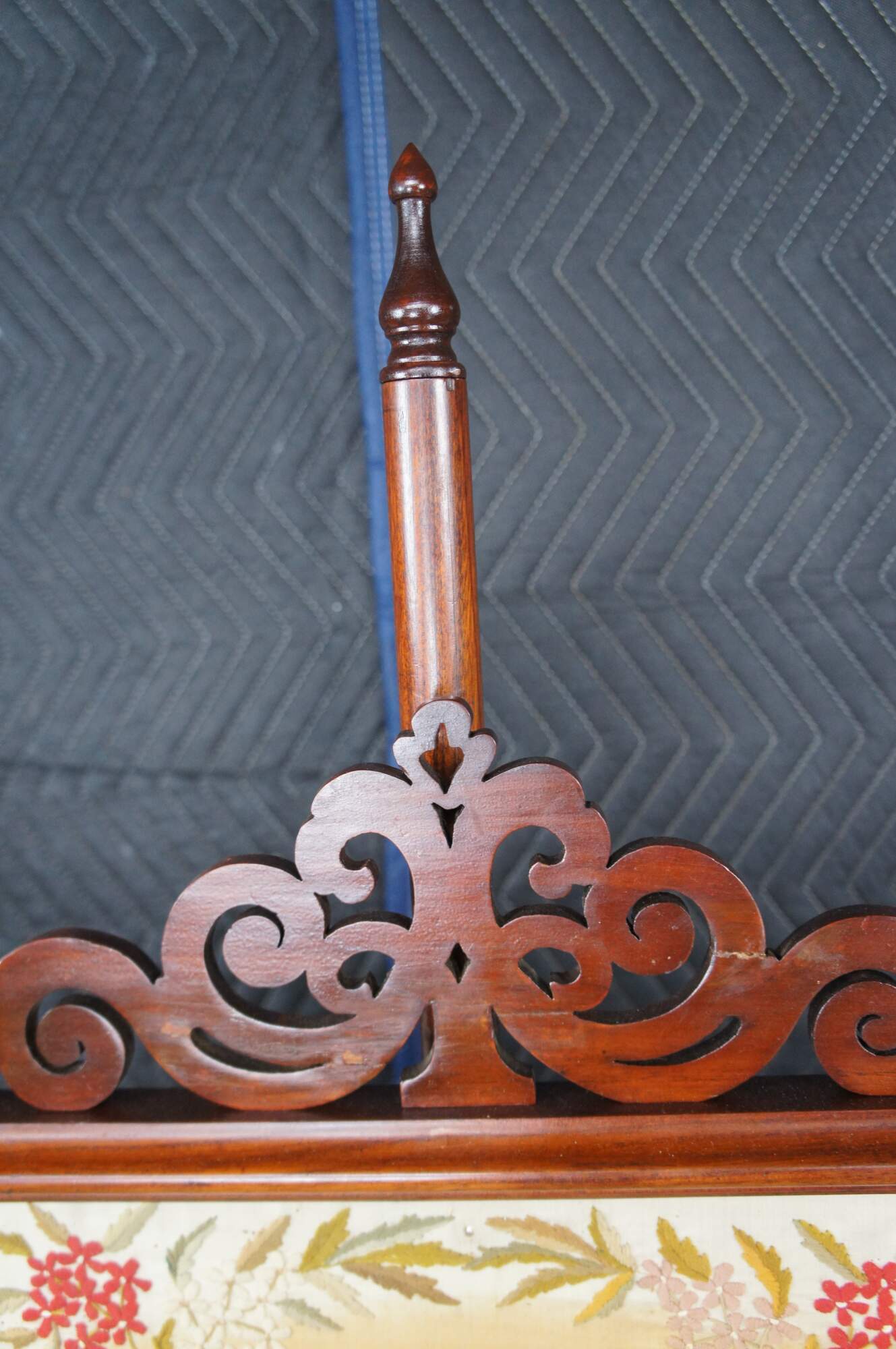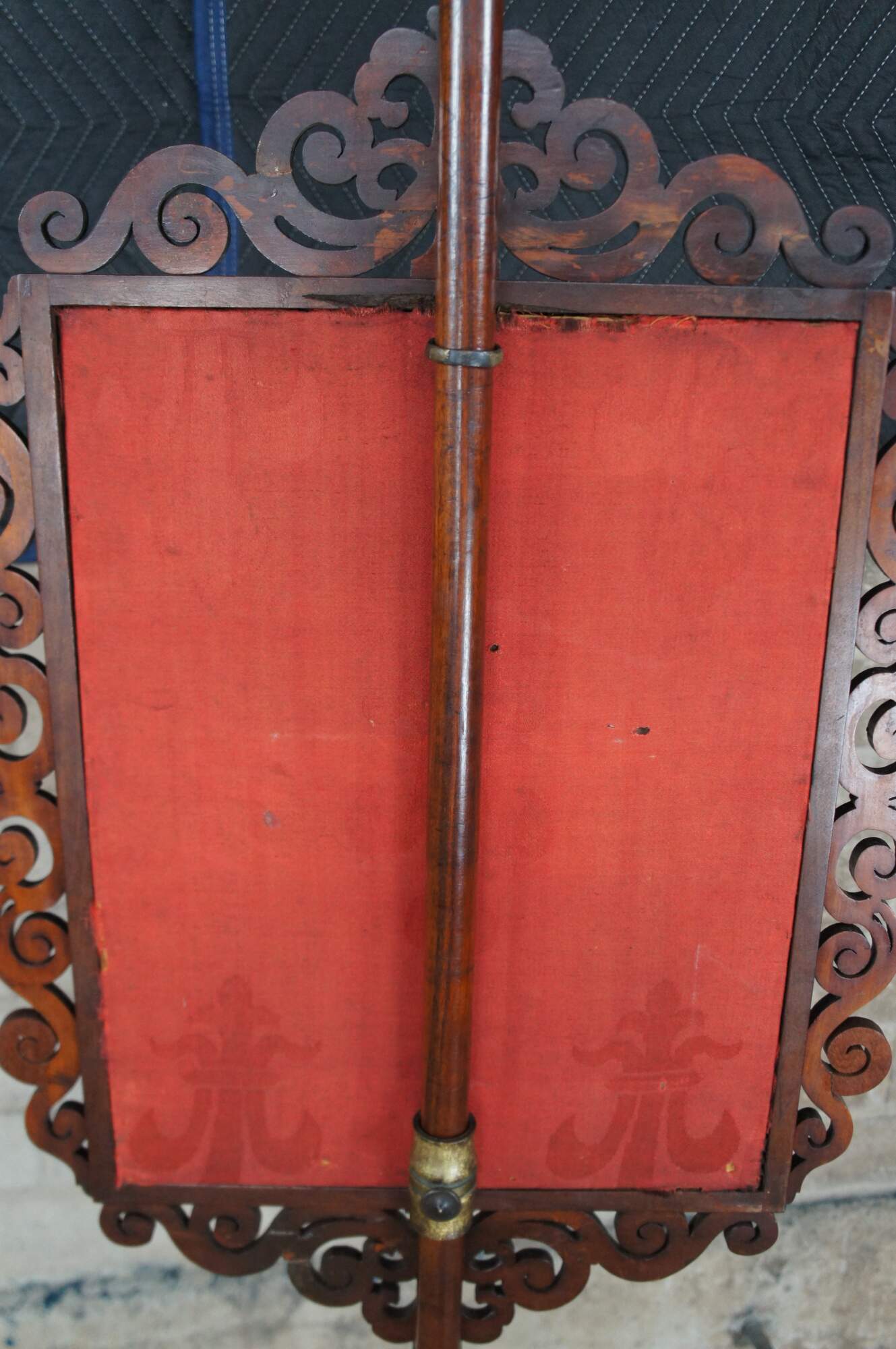 Antique English Regency / Georgian style pole or fire screen on stand. Made of mahogany featuring scrolled pierced / reticulated adjustable screen framing a floral tapestry backed with French fleur de lis. The pole features a tapered design with finial at top and bottom, and a tripod base with downswept legs and acanthus feet.
