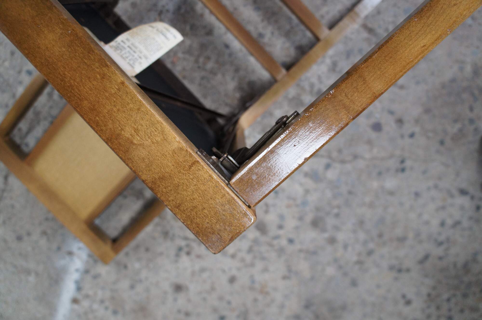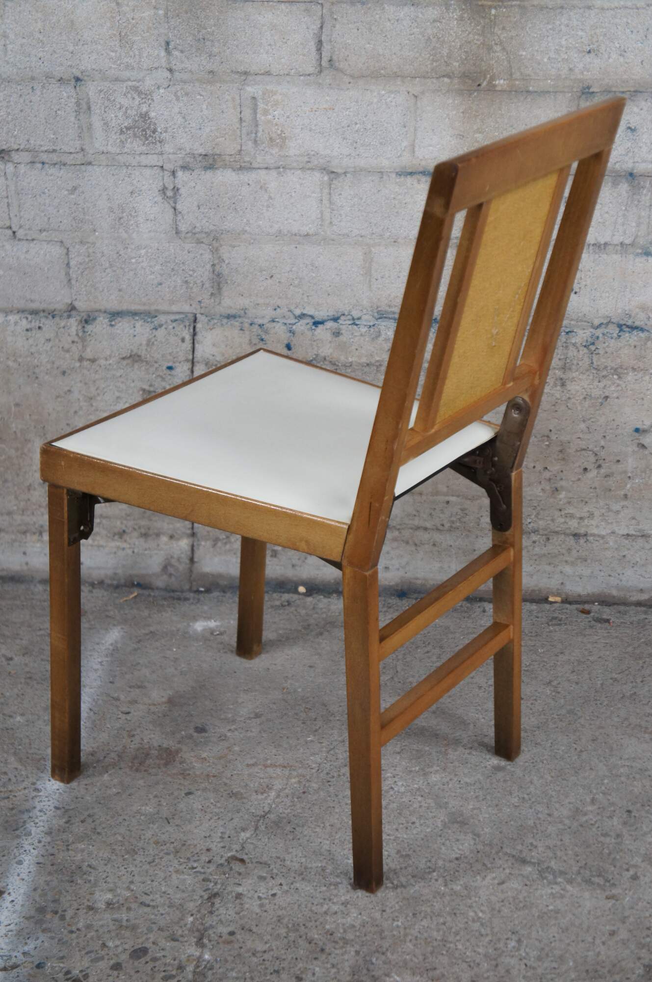 Four mid century Leg o matic folding side chairs. Made of walnut featuring woven wicker rattan backs with vinyl seat and metal hinges.