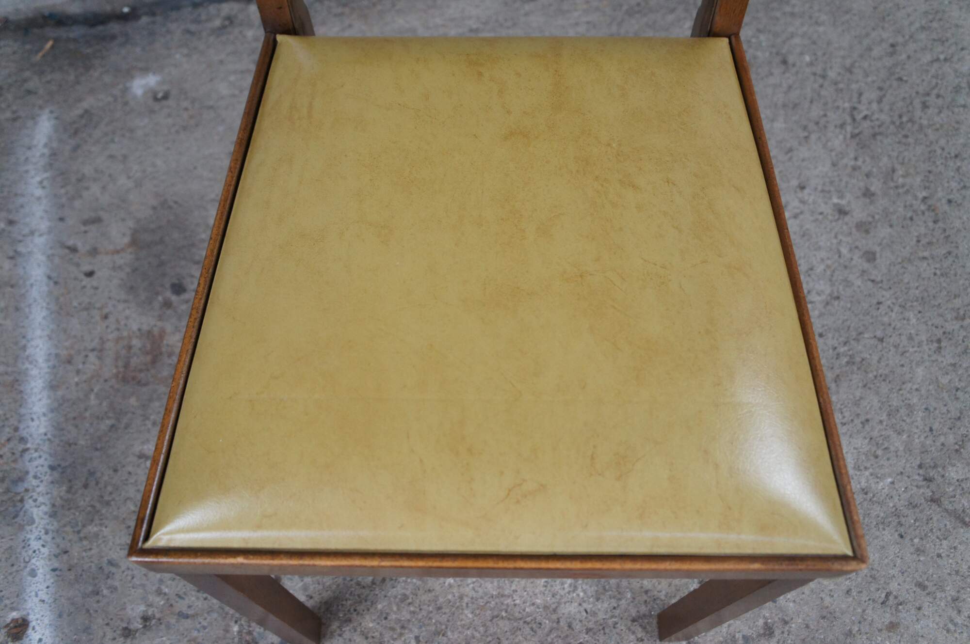 Four mid century Leg o matic folding side chairs. Made of walnut featuring woven wicker rattan backs with vinyl seat and metal hinges.