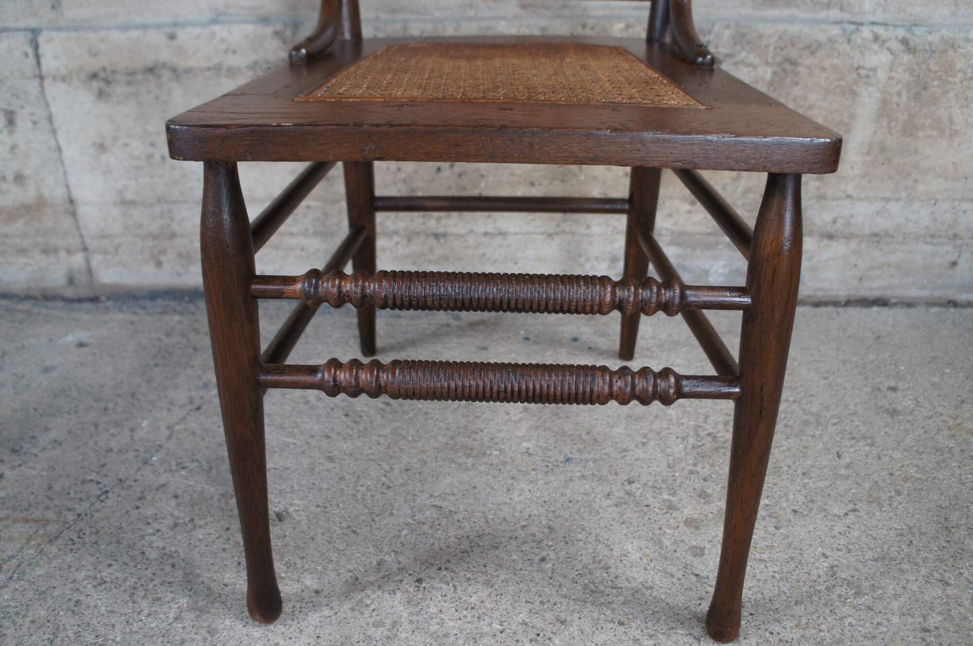 Set of four antique oak chairs with neoclassical pressbacks. Features ribbed spindle backs, cane seat and slendor legs connected by matching stretchers.