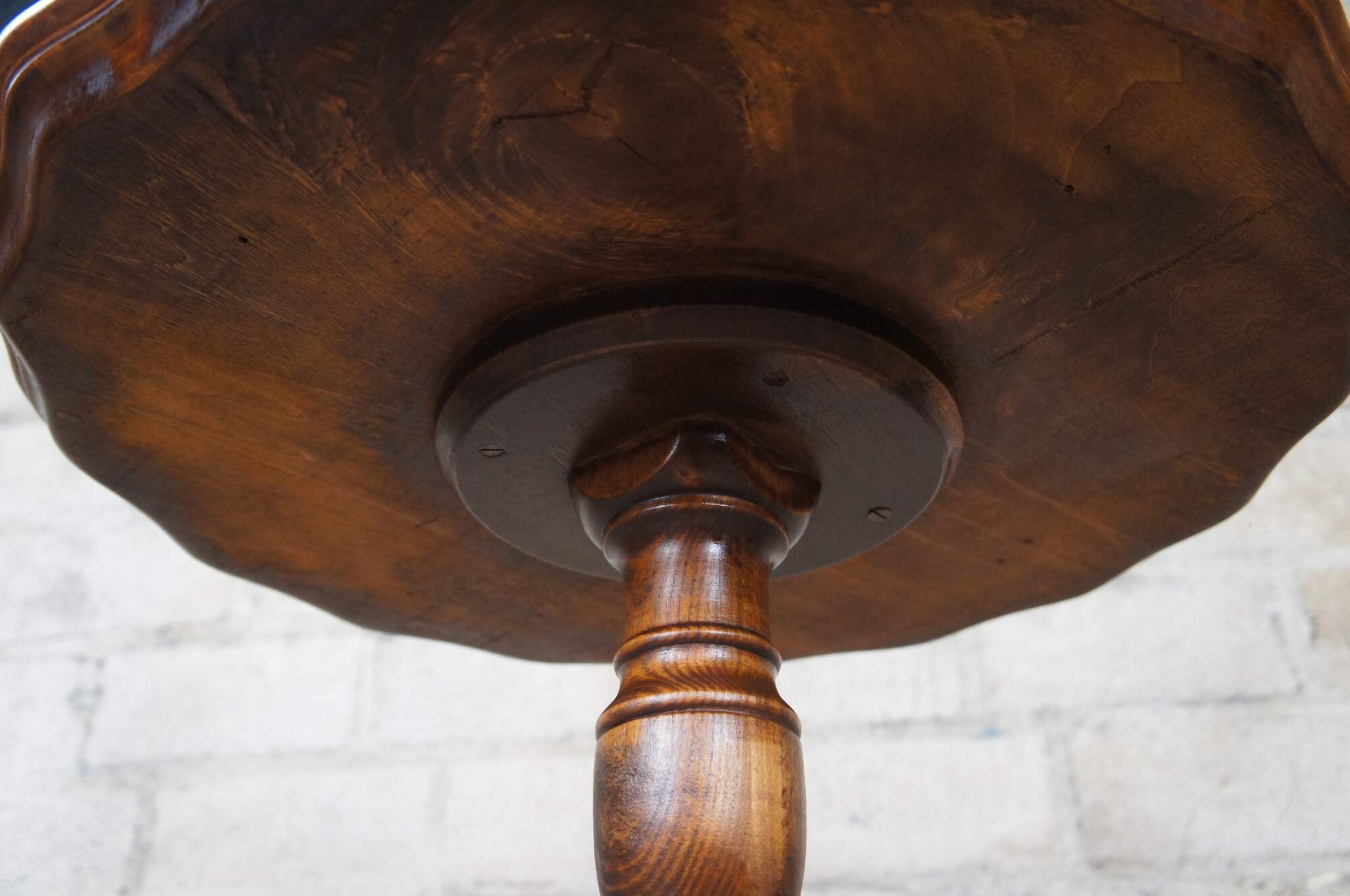 Vintage / Mid century two tier English Walnut dumbwaiter side table featuring serpentine pie crust edge with turned supports and Duncan Phyfe tripod style pedestal base with fluted and flared saber leggs and brass capped feet.
