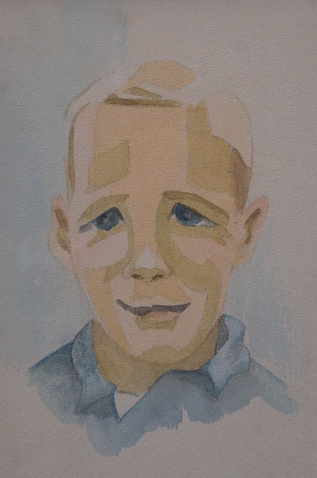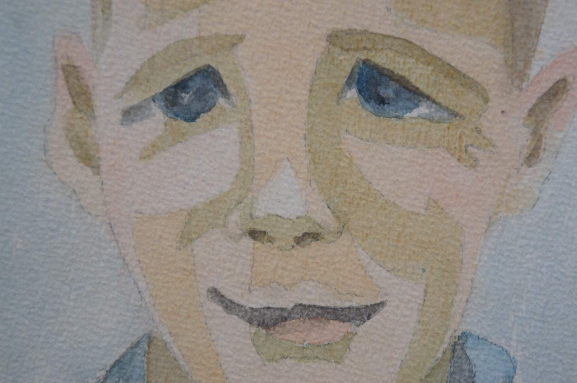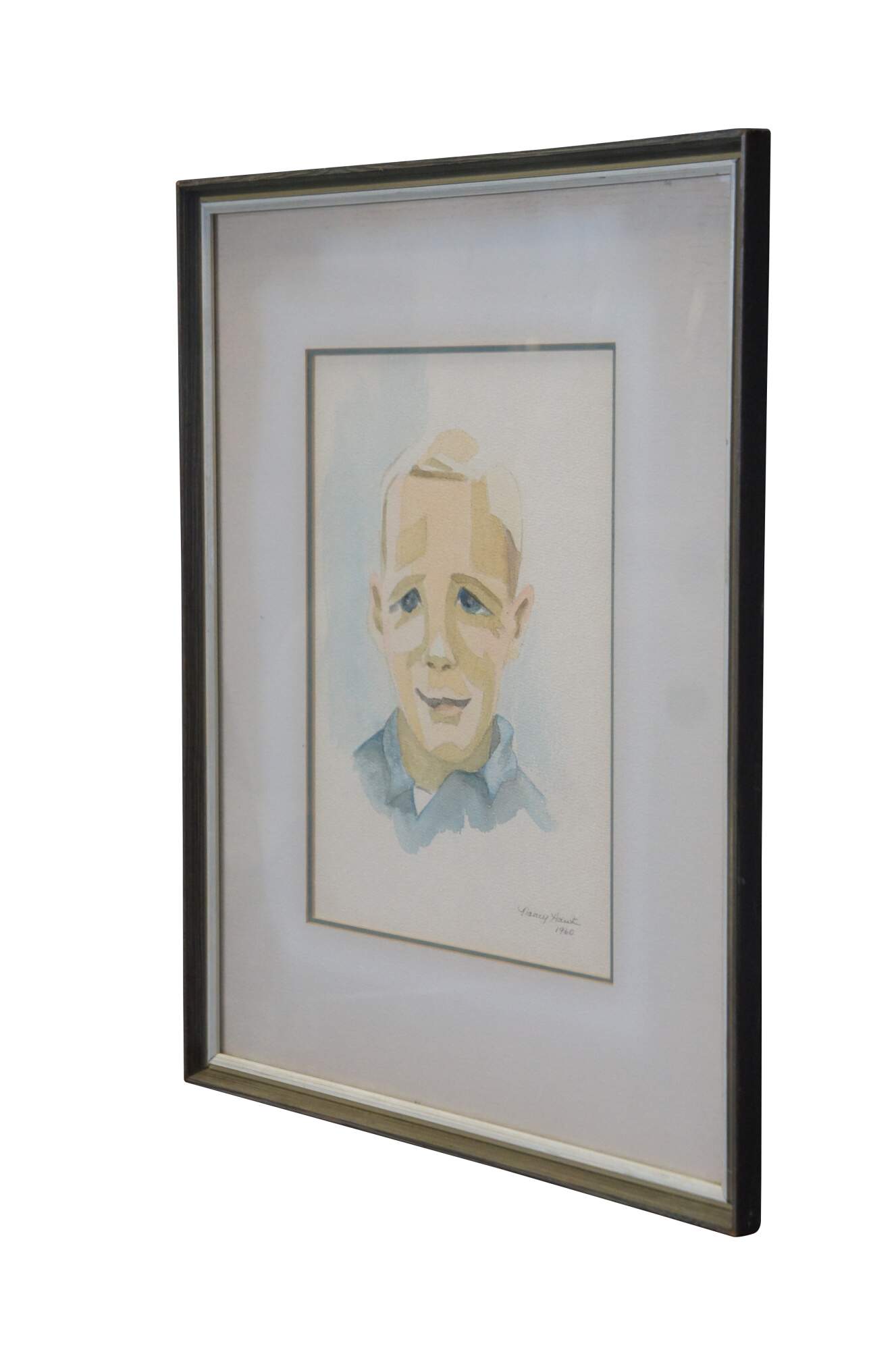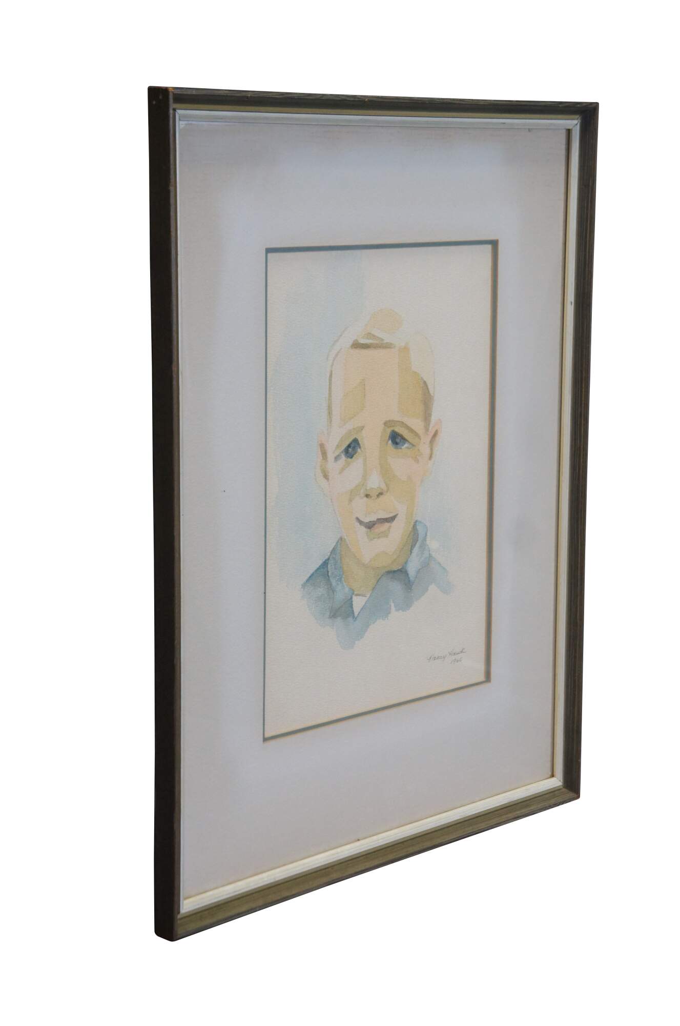 Vintage 1960 watercolor on paper portrait painting of a blond boy in a blue shirt, with large blue eyes. Pencil signed Nancy Hauck (Hauk?) and dated in lower right corner. Weathered beveled wood frame with white painted border; green and white layered mat.
