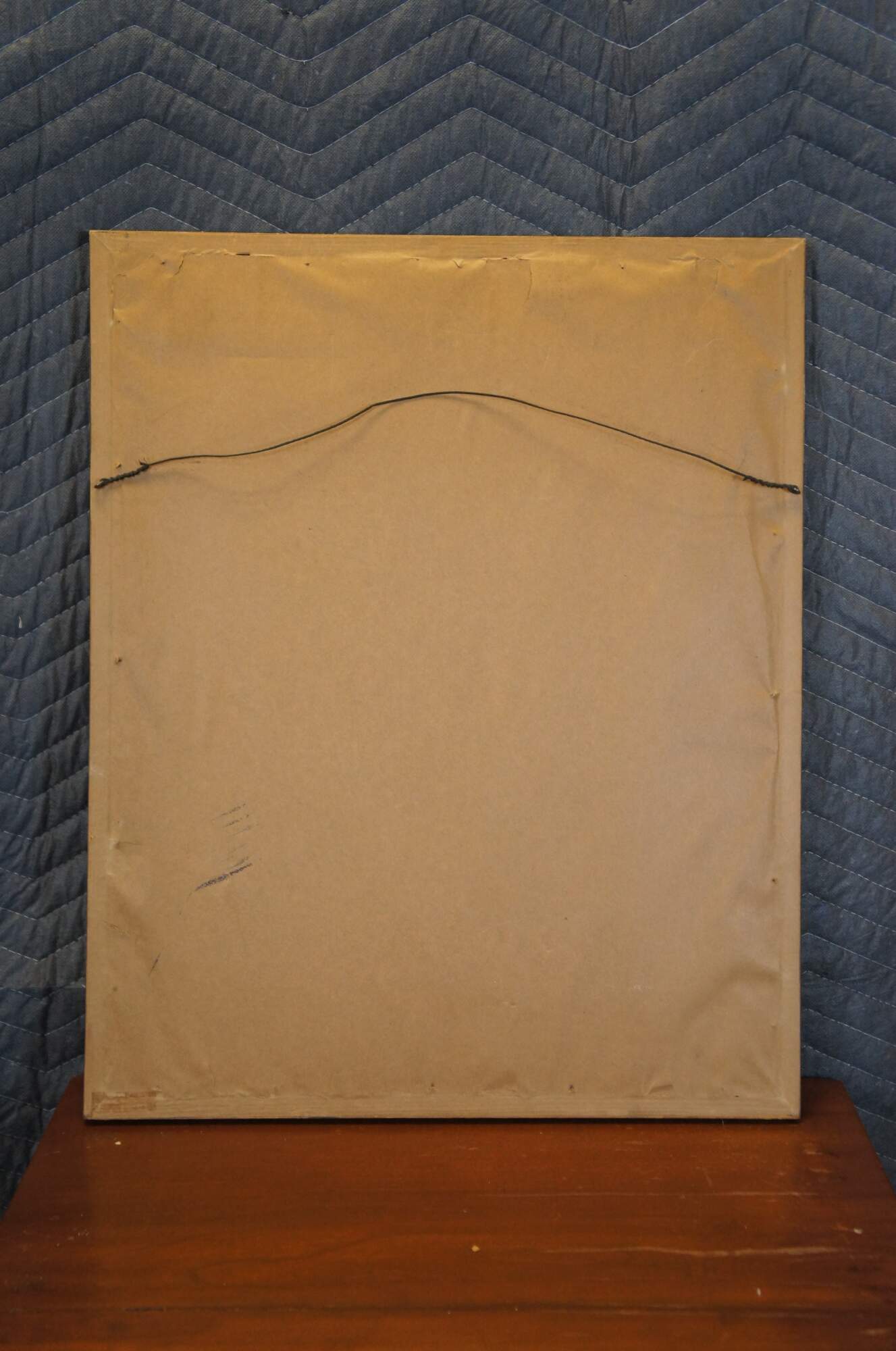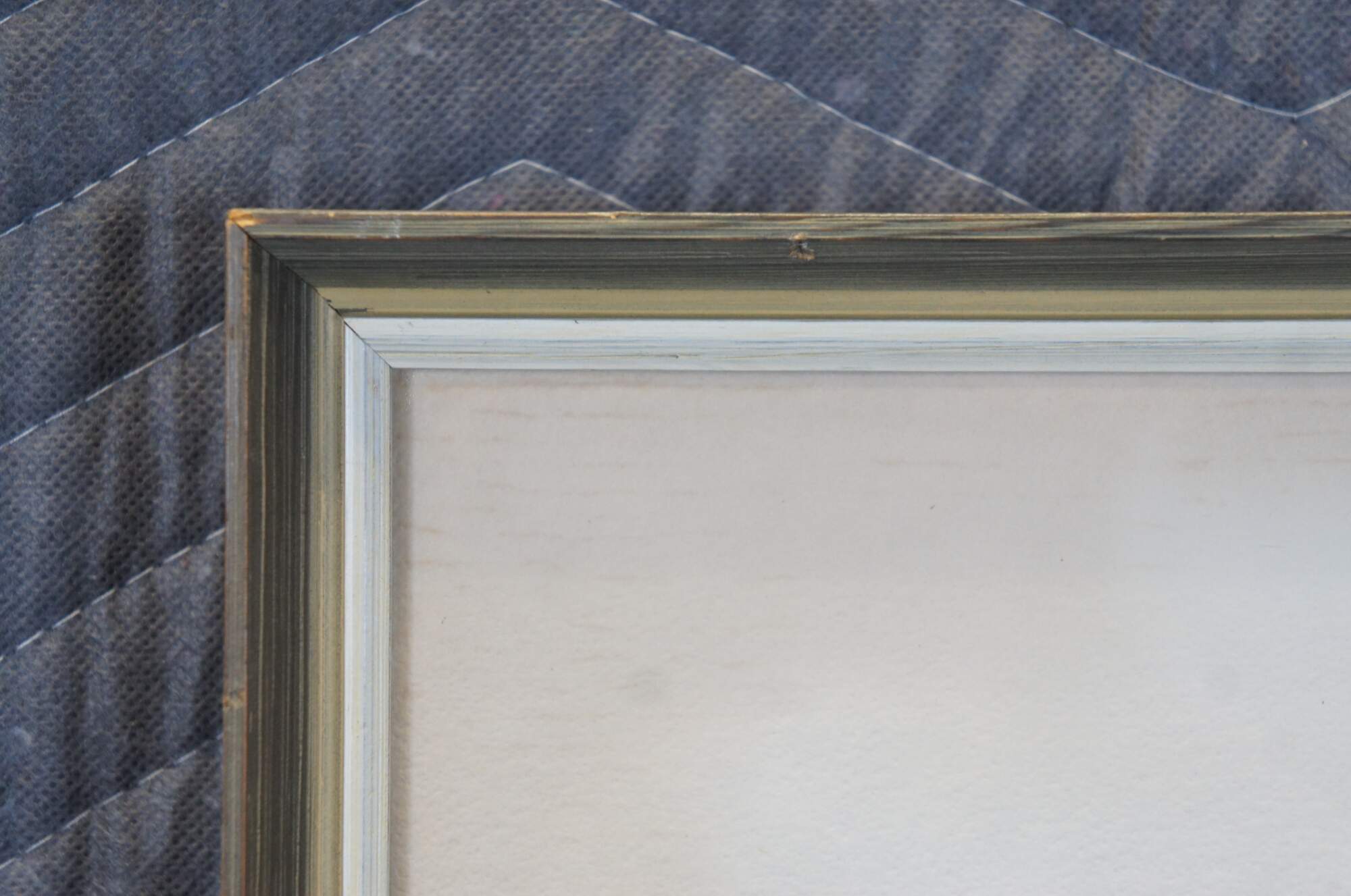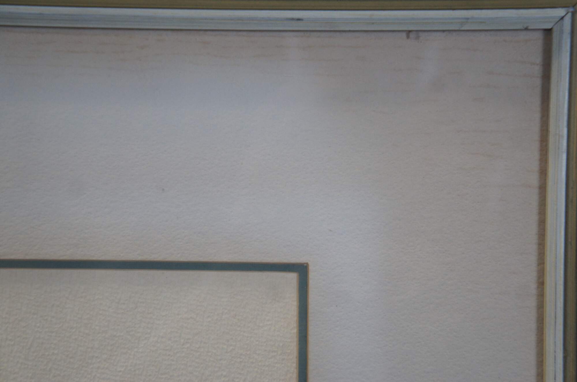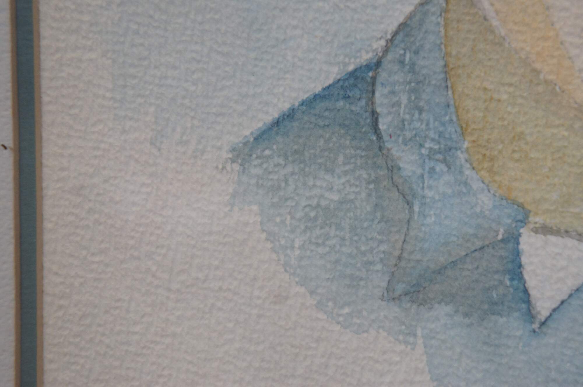Vintage 1960 watercolor on paper portrait painting of a blond boy in a blue shirt, with large blue eyes. Pencil signed Nancy Hauck (Hauk?) and dated in lower right corner. Weathered beveled wood frame with white painted border; green and white layered mat.
