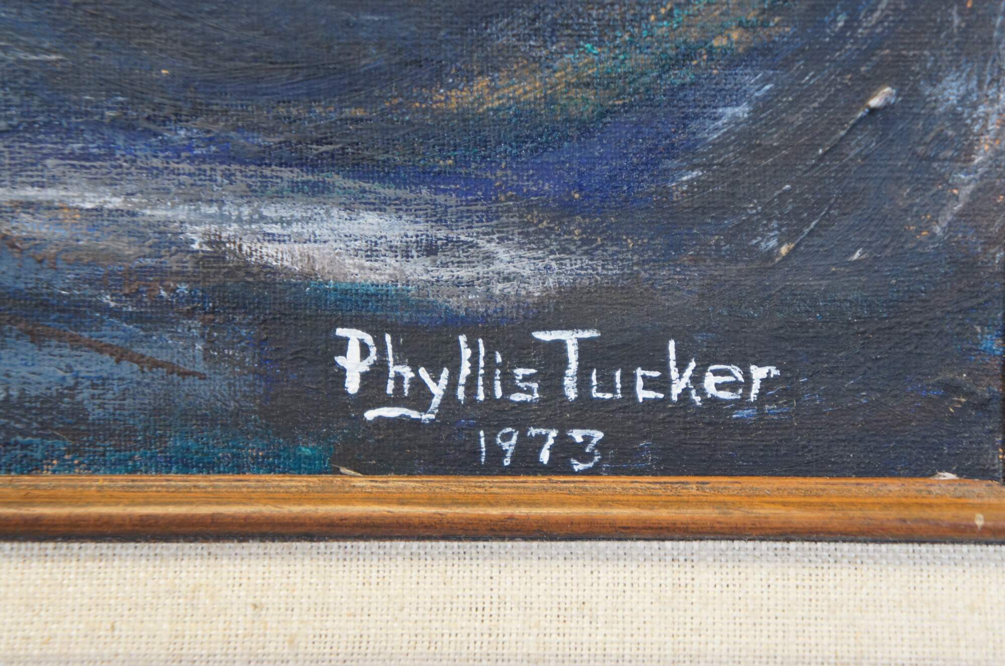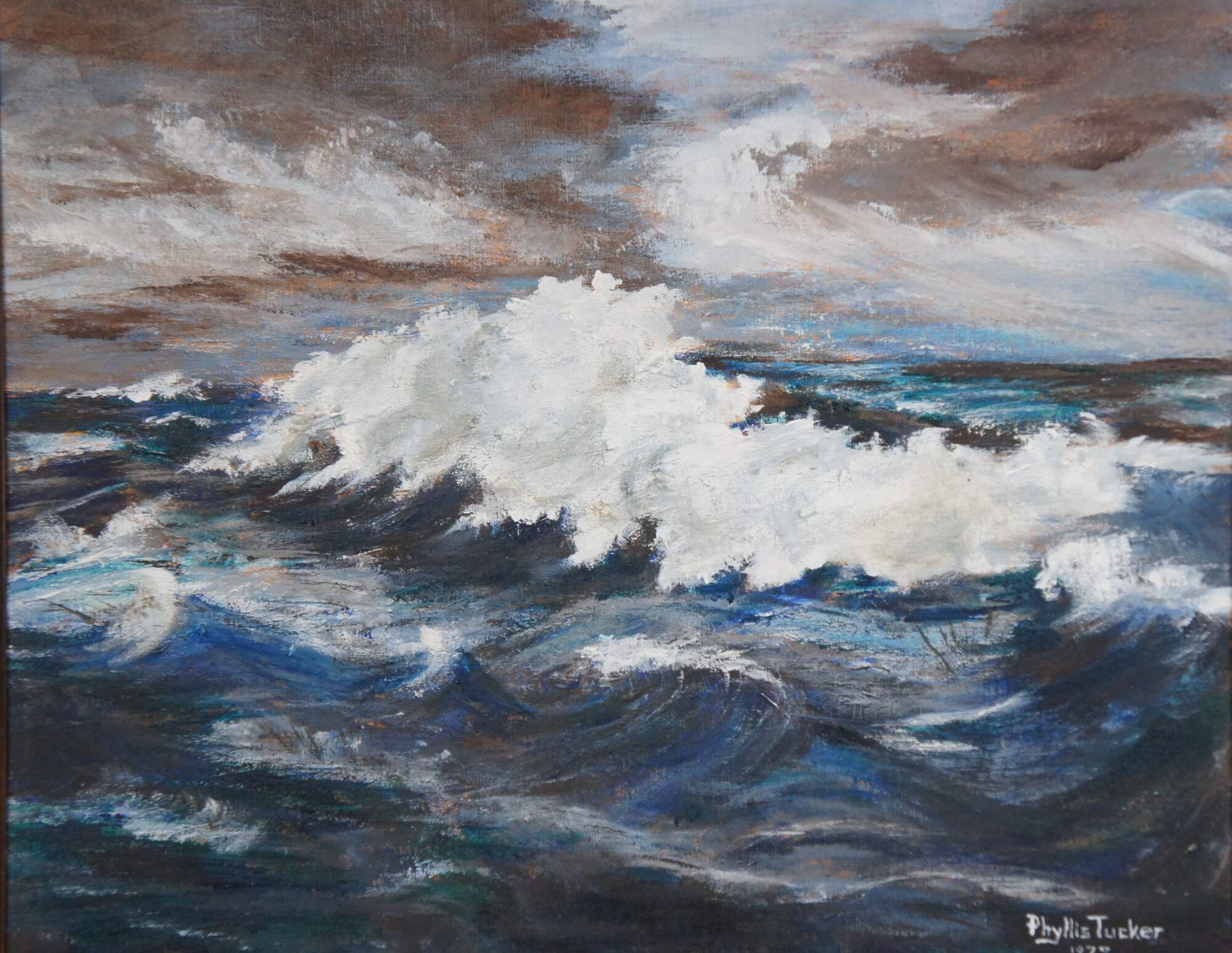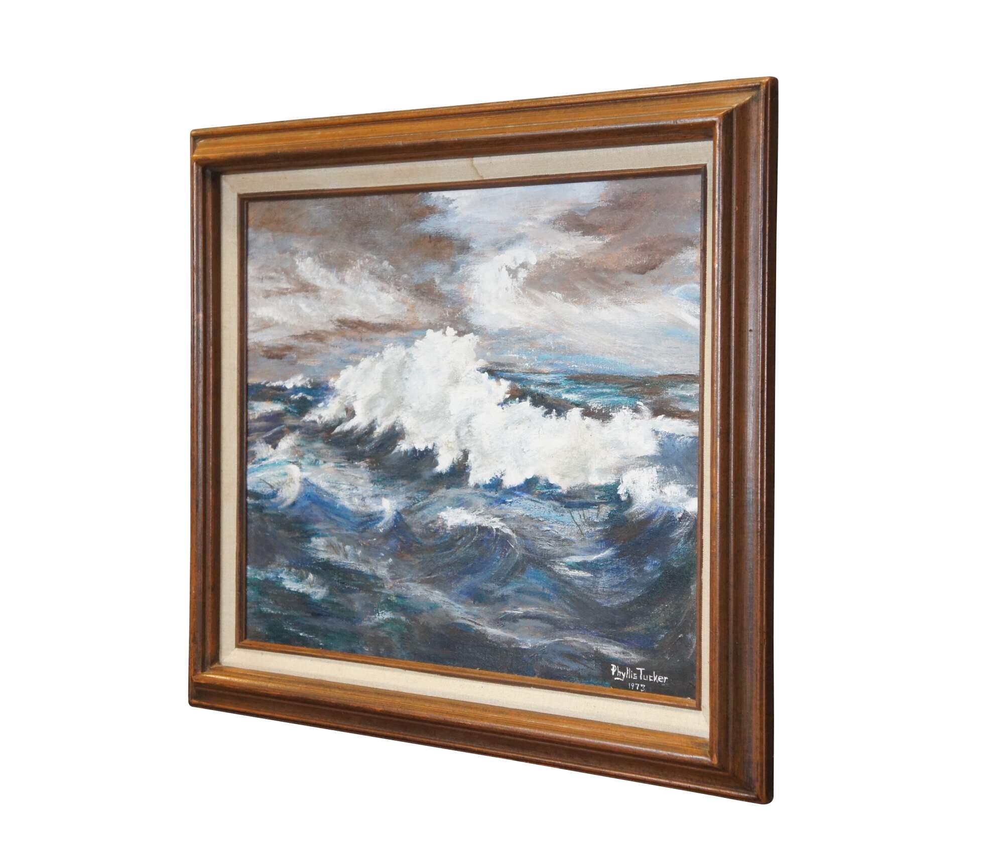Vintage 1973 oil on canvas seascape painting depicting crashing ocean waves beneath a stormy sky. Signed Phyllis Tucker and dated in lower right corner. Wood frame with raised bevel and white linen border.