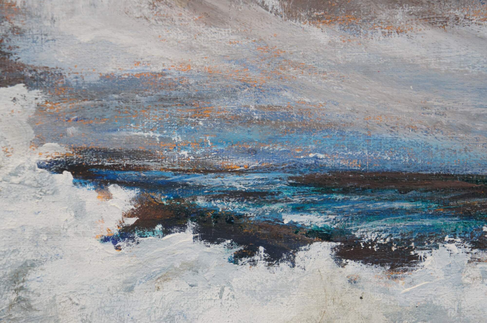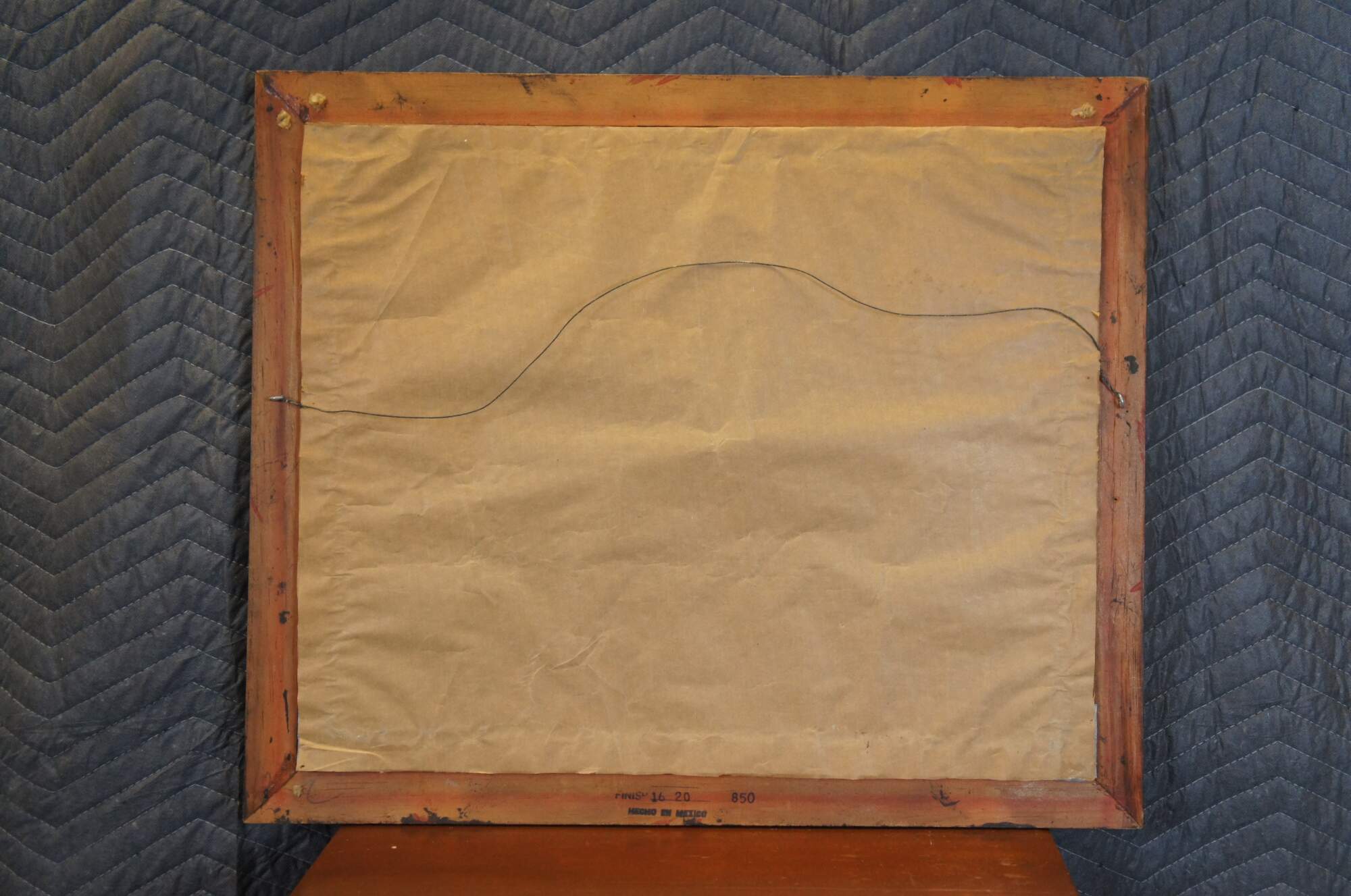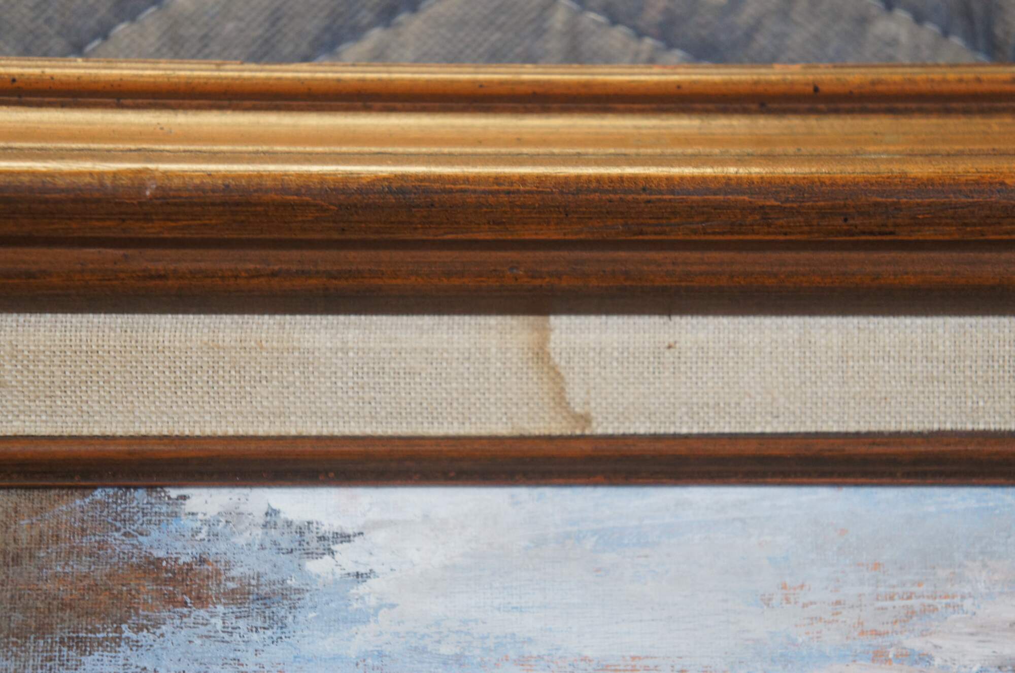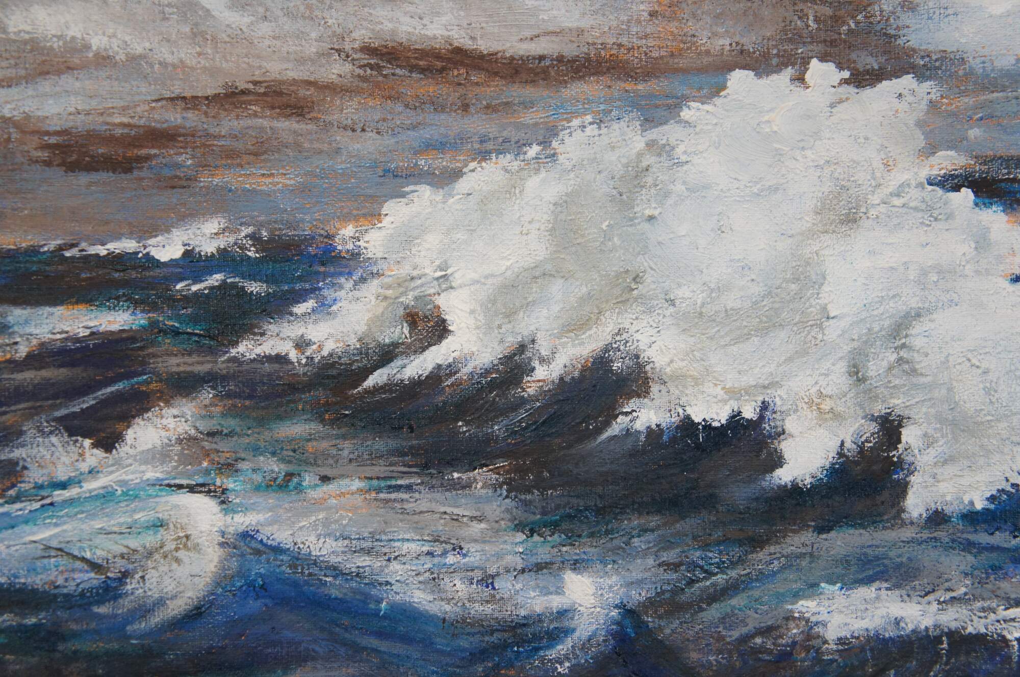 Vintage 1973 oil on canvas seascape painting depicting crashing ocean waves beneath a stormy sky. Signed Phyllis Tucker and dated in lower right corner. Wood frame with raised bevel and white linen border.
