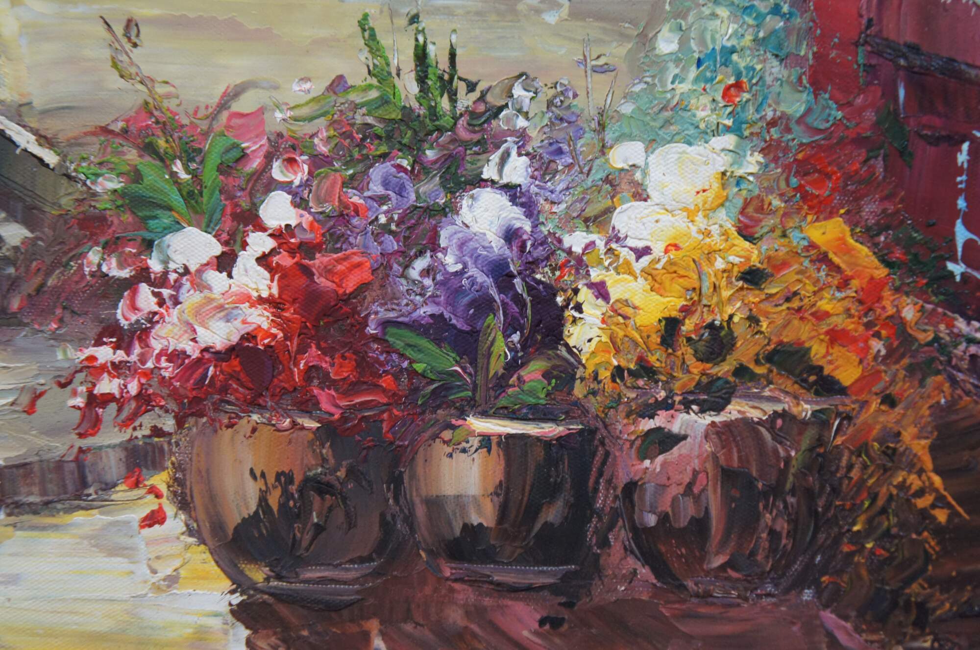Late 20th century oil on canvas impressionist / expressionist style painting depicting a picturesque Parisian city street and shops. Signed A.(?) Douglas in lower right. Black painted wood frame with raised bevel.